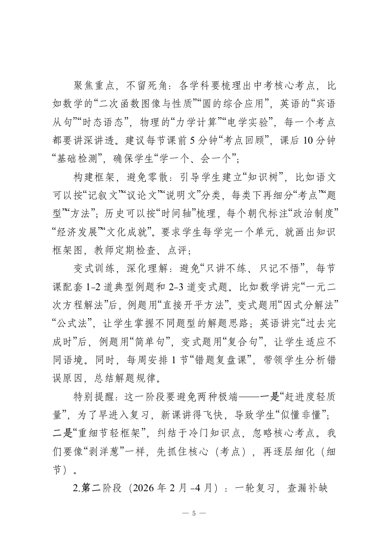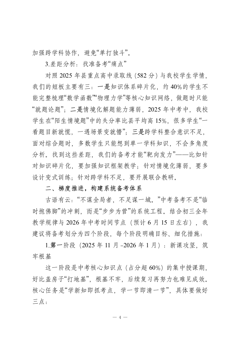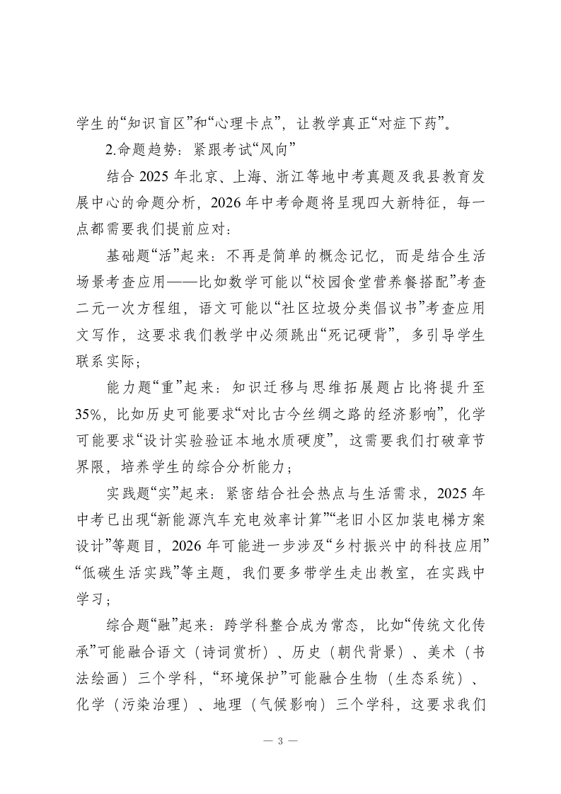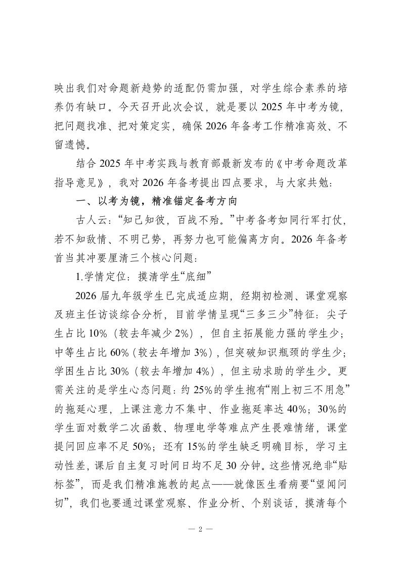 校长在2025年中考总结会暨2026年中考备考教师座谈会上的讲话各位九年级教师、各班班主任:今天是2025年11月21日,窗外寒风渐起,却挡不住我们共谋备考的热忱一2025年的中考已经过了近5个月,2026年备考的战鼓已然擂响。今天我们齐聚一堂,既是对过去一年中考工作的深度复盘,更是对新学年备考征程的周密布局。首先,我要向全体2025届九年级教师致以最诚挚的感谢:是你们清晨陪学生晨读的身影,是你们深夜批改试卷的灯光,是你们课间为学生答疑的耐心,让我校264名学子在今年中考中交出了可圈可点的答卷。回顾2025年中考,我们的成绩值得骄傲:尖子生群体(占比12%)中,有8名学生跻身全县前50名,数学、物理学科满分人数较去年增长30%;中等生(占比57%)整体稳定,其中英语学科及格率达92%,成为我校升学的中坚力量;即便是学困生(占比26%),也有15%的学生实现成绩跨越,达到普通高中录取线。但“成绩是镜子,问题是尺子”,我们更要清醒看到不足:32%的学生未达县重点高中录取线,其中数学基础题失分率达18%,语文作文立意偏题率占12%;部分学科在情境化试题、跨学科综合题上短板明显一比如历史与地理结合的“文化遗产保护”大题,我校平均分比县平均低3.5分;物理与化学融合的“环境治理实验”题,满分率仅为5%。这些数据背后,反1