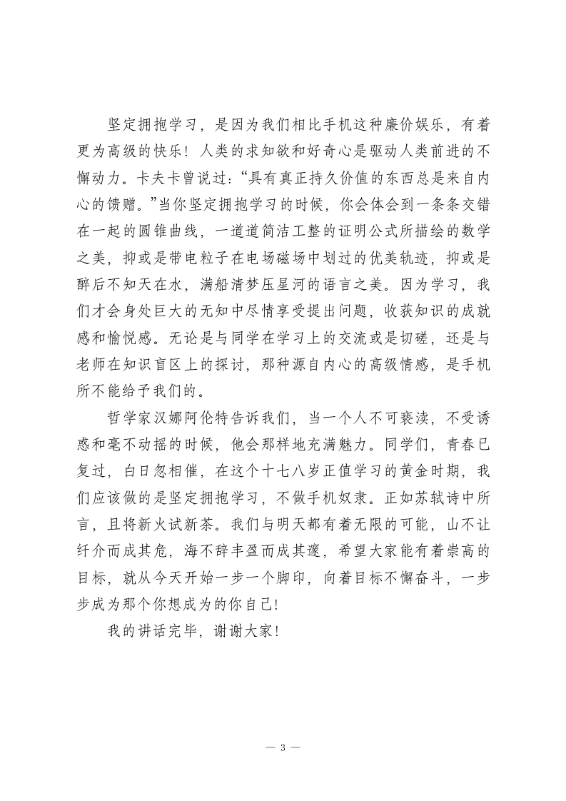 校长在国旗下讲话坚定拥抱学习,不做手机奴隶尊敬的各位同仁,亲爱的同学们:大家早上好!今天,我讲话的主题是“坚定拥抱学习,不做手机奴隶”。在当今这个信息爆炸的时代,手机在学生们的学习生活中扮演着一个亦正亦邪的角色。有人认为手机是很好的媒介,能为学生们开阔视野提供良好的平台,抑或是在重压之下放松的不二之选。但“人见利而不见害,鱼见食而不见钩”,手机背后所蕴藏的不良后果往往为人所忽视。手机如附骨之疽,无声无息磨平人的意志,故使其玩物丧志!在大数据时代,手机仿佛是被束缚在信息茧房的你最知心的朋友,它想你所想,无时不刻吸引着你的眼球。试想一下,多少同学能在听到手机的提示音后,会想知道究竟是亲朋好友的聊天信息,还是各路软件对你胃口的推送。在你的兴趣被不断勾起的时候,突然发现你竟难以保持专注。蔡元培曾说:“唯有专心致志,把心力集中在学问上才能事半功倍”。当意志力降低,学习恐难有建树!手机如岁月神偷,静静悄悄偷走零碎时间,故使其倍感焦虑!多少同学会选择在放学回家后拿出手机刷刷短视频以解学习压力,会在本就短暂的月假中打上几局惬意的游戏放松放松。如此廉价的娱乐方式,促使你的大脑分泌多巴胺的同时也提高1