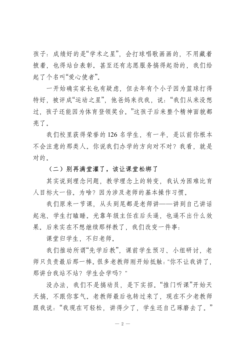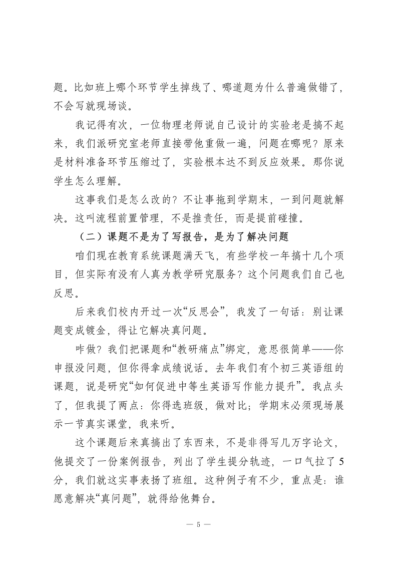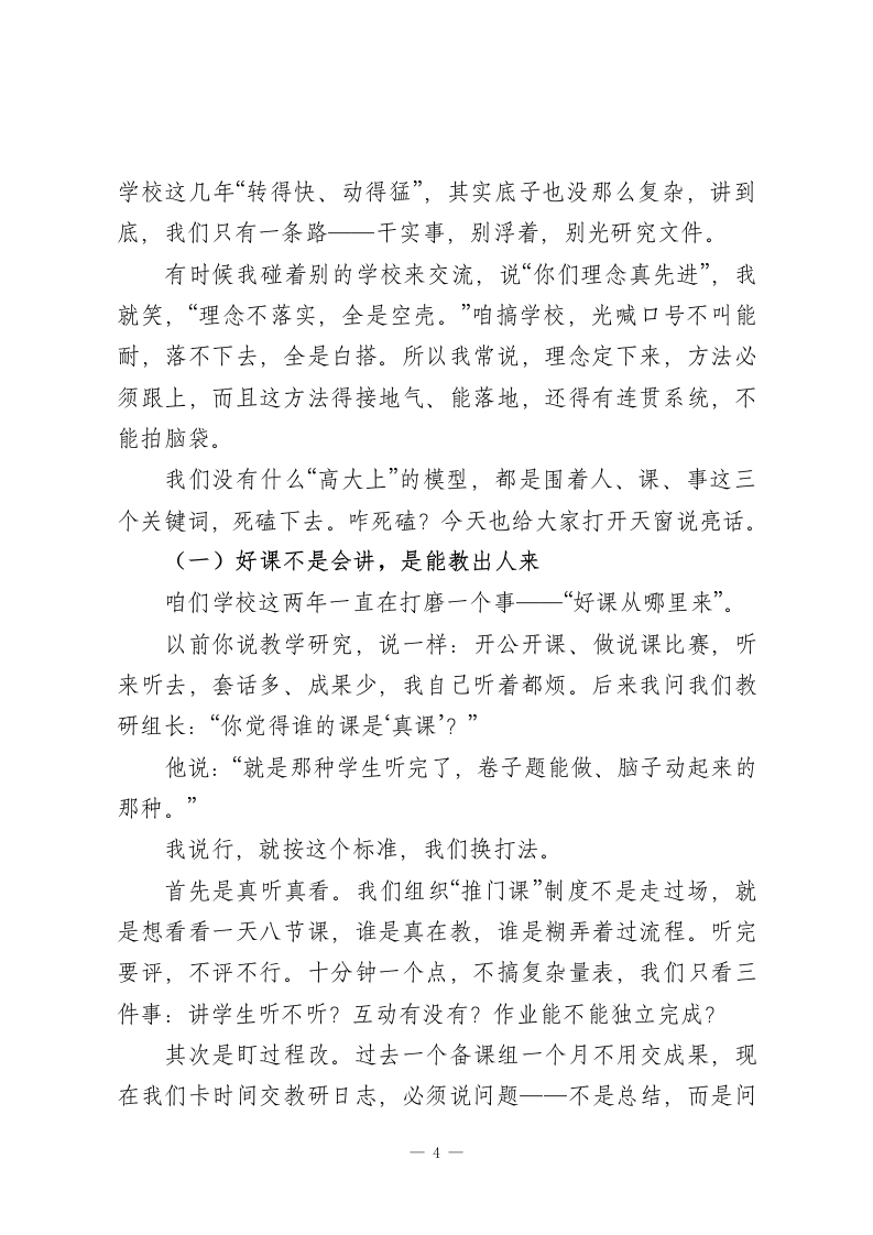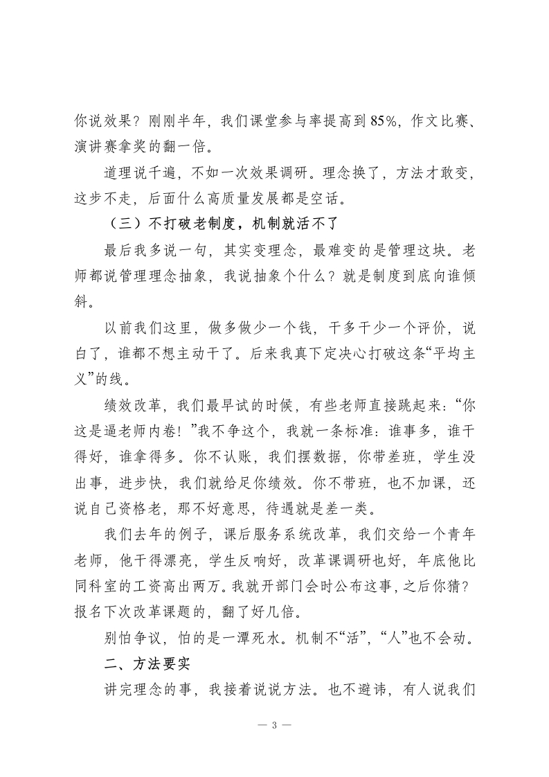 校长在全市学校管理经验交流会讲话:打破“大锅饭”!真刀真枪干!尊敬的各位领导:大家好这几年,老实说,我们学校能有点样子,靠的可不仅是熬出来的工夫,更多是走通了理念这条路。我始终觉得,教育搞不好,不是人不行,是脑子没转过来。现在推进所谓的高质量发展,嘴上说说是没用的,还是得从思想上动刀子。一、理念要新我常挂在嘴边一句话:理念不变,工作再卖力,也是推着老牛拉破车。教育不是几十年前那个路子了。今天我就说说我们学校这几年,把“理念往前提”这件事做的一些实践,讲得不一定对,但是真是踩过坑的经验。(一)不是说换句话术,而是换方向第一个事,还是得说办学理念。以前年年开学典礼,我站台上讲的最多是什么?“希望大家勤奋学习,争取好成绩”。现在我基本不这么讲了。说实话,多少年我们一把尺子量,量来量去,量出一堆跑偏的孩子。改课标、改革育人方式,不是改几个名字,我们真得明白,分数这玩意不是全部。我校从前年开始就自己定目标,不再拿“尖子生”数量当硬指标了,转头把目光放在“看不见”的学生身上。像我们推的“学生多元评价”体系,说白了就是换个思路看1