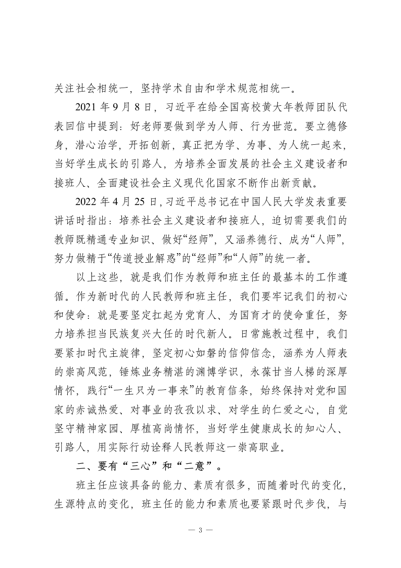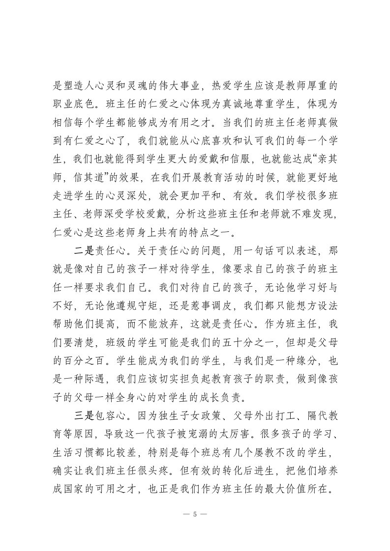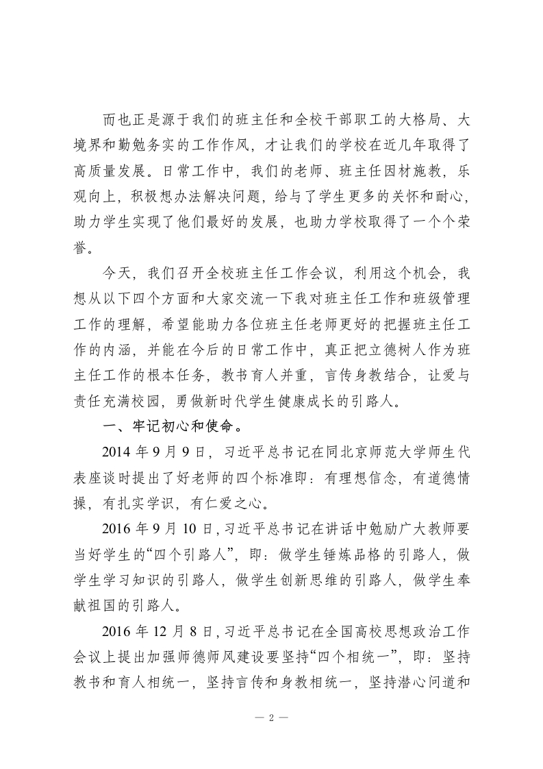 校长在全校班主任工作会议上讲话让爱与责任充满校园各位班主任老师:今天有幸和各位班主任交流工作,我非常高兴。自工作以来,特别是担任学校管理工作的这些年,和同事在一起交流,经常会讨论起学校中哪个岗位最重要的问题,而我的答案是明确的,我认为学校各个岗位中,班主任这个岗位是最重要的。我认为,班主任是班集体的组织者和教育者;班主任是学生全面发展的指导者;班主任是联系班级中各任课教师的纽带;班主任是沟通学校、家庭与社会的桥梁;班主任是学校实施教学、教育工作的得力助手和骨干力量。学校是由一个个的班级组成的,只要班主任把各自的班级管理好了,学校的管理自然也就好了。班主任是一个班级的灵魂,班主任的思路和境界直接影响着班级的发展水平,也影响着学校的整体发展状况。“一个好班主任就是一个好班级”与“一个好校长就是一所好学校”是一个道理。班级形成什么样的风气、文化、精神,班级学生发展到什么程度,都取决于班主任的思想境界和思路。我回一中担任校长的这四年多的时间,亲身体会到我们学校的绝大多数班主任老师素质都非常过硬,都有较高的格局和境界,都有很强的管理能力,工作上也都兢兢业业、尽职尽责,可以说我们的所有班主任都为学校发展做出了突出的不可替代的重要贡献。一1
