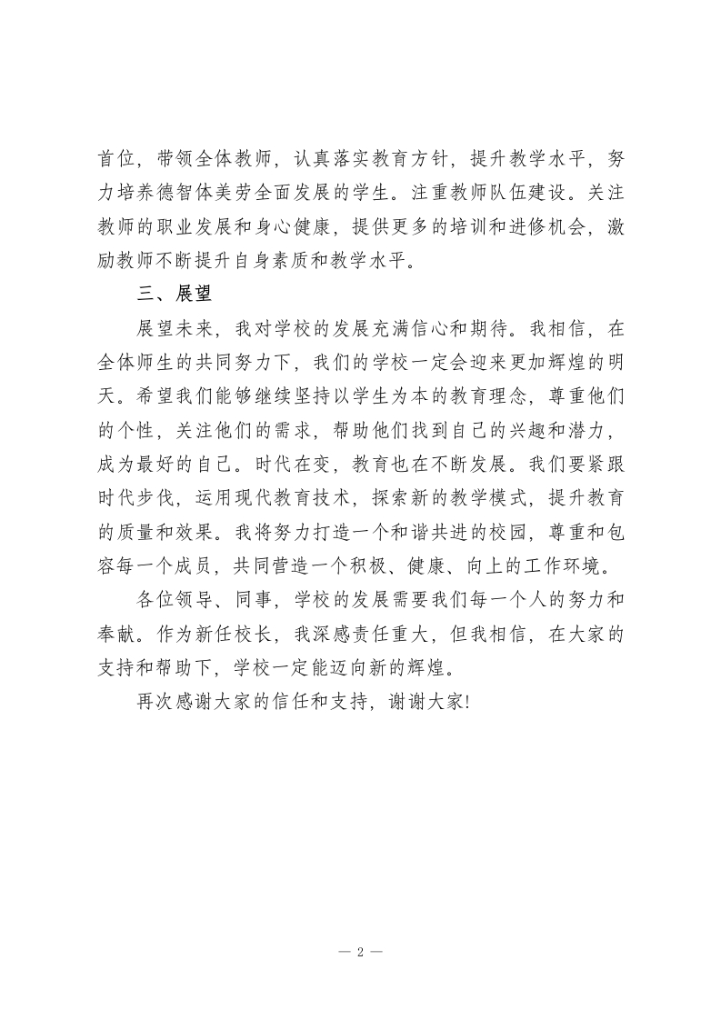 校长在任命会上表态发言尊敬的各位领导、各位同事:大家好」今天,我怀着无比激动和感恩的心情,站在这里发表我的表态发言。首先,请允许我向一直以来关心和支持我成长的领导、同事、老师表示衷心的感谢!我想表达三个方面的内容。一、感谢首先,我要感谢上级领导对我的信任和厚爱。这不仅是对我个人的肯定,更是对我今后工作的鞭策和激励。我深知,这份信任来之不易,唯有努力工作,才能不负众望。其次,我要感谢各位同事。你们在过去的工作中给予了我无私的支持和帮助,你们的智慧和汗水是学校不断前进的重要动力。在未来的工作中,我期待继续与大家并肩作战,共同进步。再次,我要感谢全体老师。你们是学校的核心和灵魂,学校的一切成绩和荣誉都离不开你们的辛勤付出和积极参与。作为校长,我将全力以赴为你们创造一个更加优质的教学环境。二、责任被任命为校长,意味着责任的加重。我深知,校长不仅仅是一个职务,更是一份沉甸甸的责任。这份责任,要求我始终保持清醒头脑,不断学习和进步,才能带领学校不断前行。教育是学校的根本任务,是立校之本。我将始终把教育质量放在1