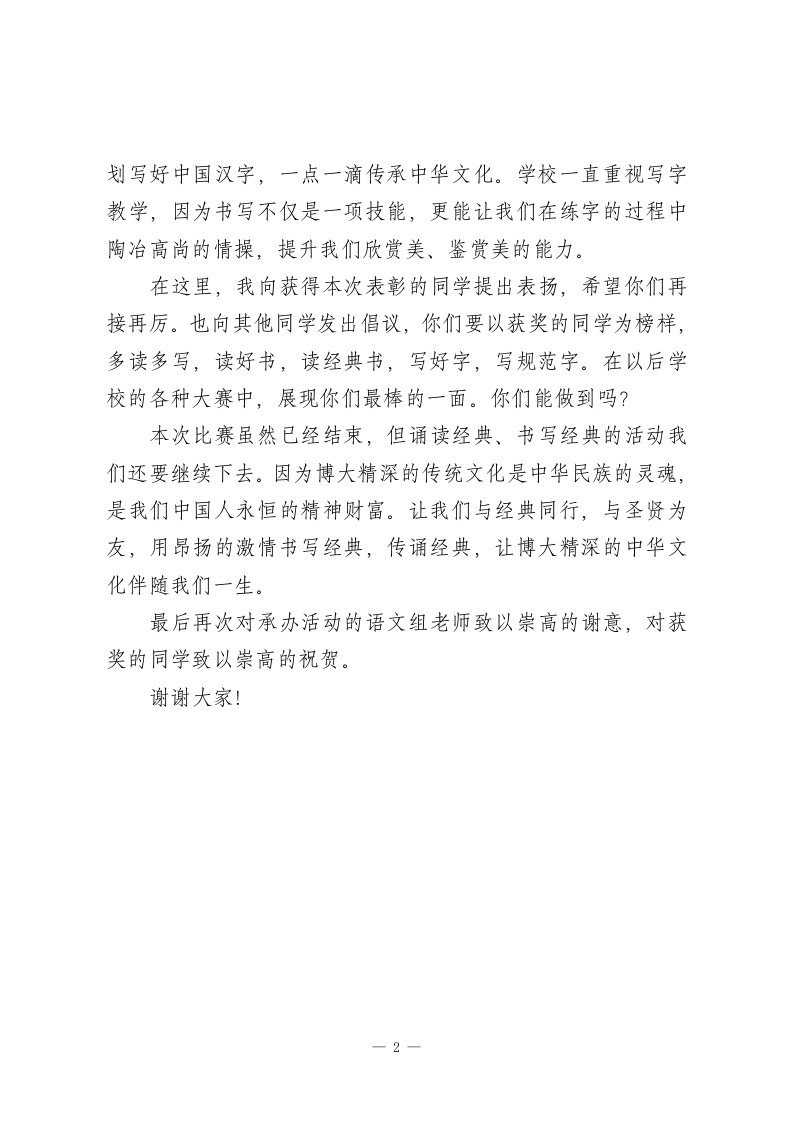 校长在学校硬笔书法大赛颁奖典礼上讲话同学们,都说我国有960万平方公里,地大物博;要我说啊,最值得咱们中国人骄傲的是咱们有五千多年的文化传承!仓颉造字,始为化文;秦皇一统,始为根基。(什么意思呢?这里说了两个人。一个是仓颉,他始创了的汉字,一个是秦始皇,他在拢四方聚六合之后,统一了汉字,为中华文化传播奠定了根基)从那时起,中华文明得以代代相传。中国汉字从甲骨文到我们今天所读所写的规范字,经过了不断地发展变化,它不仅仅是一种传播文化的文字符号,更是一门艺术。汉字的书写让王羲之、欧阳询、颜真卿这样的书法家万古流芳,也让我国古代先贤的智慧千秋长存。从先秦时期的诸子百家到唐诗宋词元曲,留下了无数灿烂的中华文化。汉字承载的是中华五千年文化的传承。同学们都读过《弟子规》《论语》等书,里面告诉了我们很多学习、做人的道理。我们还从一首首古诗中认识了李白、杜甫、陆游、苏东坡…他们带我们遨游五湖四海领略受祖国山河的壮丽;引我们穿越历史的长河感受诗人的家国情怀。规范写经典,古韵记心间。我来点评一下本次书写大赛,两句话“一个感触、一个欣喜”。这个感触就是:字写的漂亮,是美的享受。这个欣喜就是,我们的同学们从小就能说普通话,写规范字。你们棒棒的,我为你们点赞。我这里还有一个希望。这个希望就是希望同学们:一笔一1
