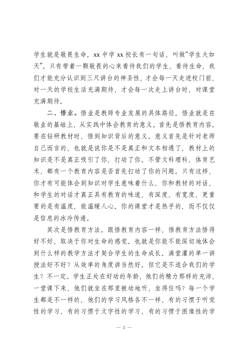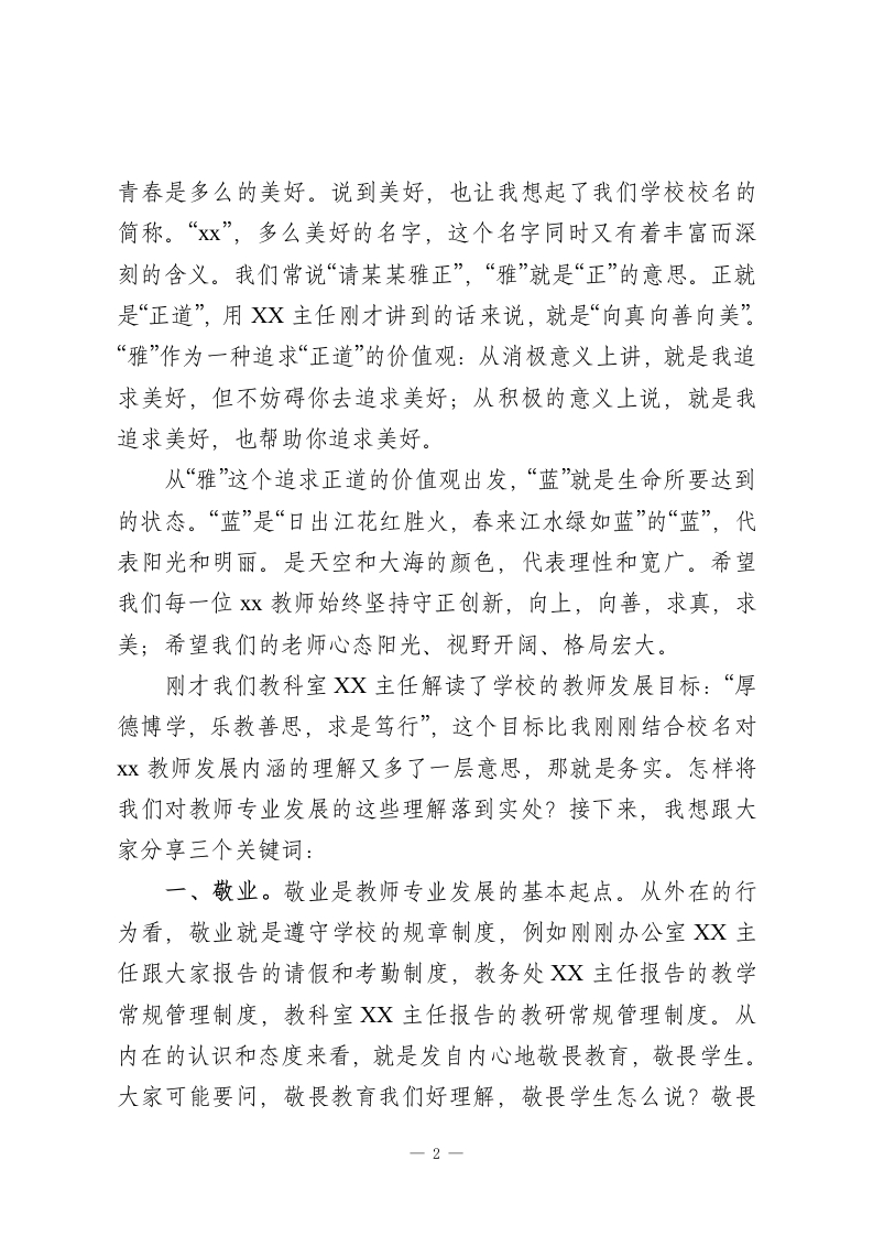 新教师培训活动,校长总结讲话教育的味道老师们:今天我们在XX市Xx组织岗前培训会。“大成桥”这个名字的寓意很好,希望大家在新学校取得更“大”的“成”绩,学校负责为你们牵线搭“桥”。今天的培训,我感觉很有“味道”。什么味道?我想首先是“思想的味道”。著名教育学者刘铁芳教授有一个词语,叫做“思想的芬芳”,可见思想是有味道的。我们教务处XX主任讲教学常规,就讲出了思想的味道。她说,什么叫坚守常规?坚守常规就是不仅职初,而且在我们的教育生涯中一直坚守教育的初心,初心纯洁、热烈、美好。这就赋予枯燥的教学常规以思想的味道。我们学校每栋楼名字的背后,都包含着我们的办学思想,这就使枯燥的学校介绍具有了思想的味道。不仅有思想的味道,而且有“情感的味道”,她们对教育的理解,不仅是思想认识上的,也是情感上的,代表着一种浓浓的教育情怀。“思想的味道”代表一种深度,“情感的味道”代表一种温度,它们合起来就是“教育的味道”:教育的味道就是“生命的味道”,今天她们讲出了生命的辽阔、深邃和温暖。生命的辽阔、深邃和温度,用一个词概括,就是“美好”。说到美好,大家刚刚的互动发言,让我的脑海里浮现出三个词:青春Xx、活力Xx、品质Xx。大家的青春活力让我感觉到,1