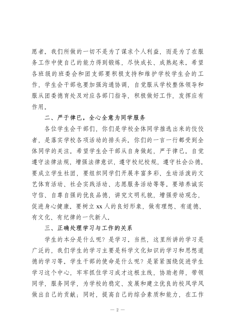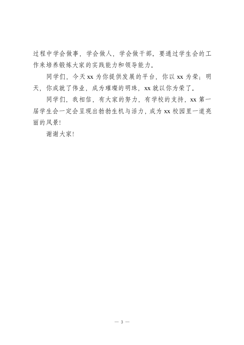 学生会成立大会上,校长讲话学生会是学生自己管理自已的团体,是联系学校与学生的桥梁和纽带老师们,同学们:上午好!在我校校委会的带领下,在全校师生齐心协力把x创建为“师生共同发展,张扬生命个性,打造激情校园”的大好氛围中,在学校德育处的精心策划和周密安排下,Xx中学第x届学生会以其崭新的面貌登台亮相了,这是全校的一件大喜事。在此,我代表学校对第ⅹ届学生会的成立表示热烈的祝贺!看着你们宣誓的样子,我的心情也十分激动,我仿佛又回到了中学时代,中学时代是人生中最美好的时光,也是人生成长中最关键的时期,有很多能力都是在当学生干部时锻炼的。学生会是学生自己管理自己的团体,是联系学校与学生的桥梁和纽带。工作任务是参与学校管理,联系服务同学,锻炼实践能力,提高综合素质。我想对Xx第x届学生会提三点要求:一、准确定位,明确职责学生会实行“自我服务、自我教育、自我管理”,是广大同学锻炼自己、奉献他人、全面提高自身综合素质的平台。我们每一位学生会的成员都要充分认识到,学生干部不是管理者,而是学生的骨干、学生工作的组织者,更是为同学们服务的志1
