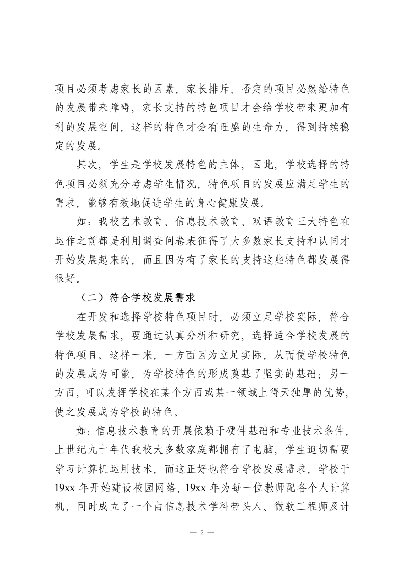 学校办学特色论坛,校长发言与时俱进继承创新!学校的特色建设不是凭空产生的!各位专家,领导:很荣幸,主办方给我这个机会,能让我站在这里向各位汇报工作。“发展学校特色,追求特色办学”在今天受到了前所未有的重视,成为许多学校追求的目标。中国教育学会前会长、著名教育家顾明远说:“何谓特色,顾名思义,是指不同于一般,不是平平常常,而是要有所创新,具有个性,而且这种个性能够形成传统,代代相传。”作为学校法人代表,校长如何打造学校特色、对于提高学校的社会知名度,提升学校的竞争力有着积极的意义。我所在的学校是一所有着几百年办学历史的学校,在历代教育人的努力下形成了以艺术教育、信息技术教育、双语教育为代表的三大办学特色。现立足学校的情况从学校特色的起源、学校特色的形成、学校特色的彰显三个角度谈谈如何构建学校特色。一、特色起源于需求(一)满足学生成长需求学校在开发和选择学校特色时,应该充分满足学生的成长需求。首先,学生的未来是家长的期望,因此,学校选择的特色—1