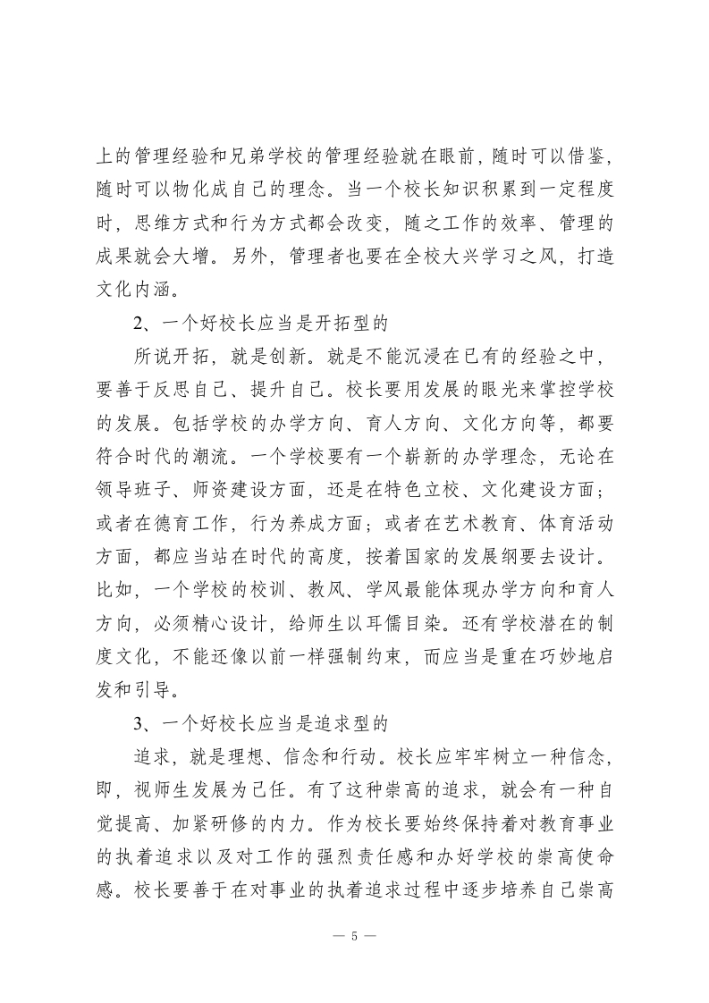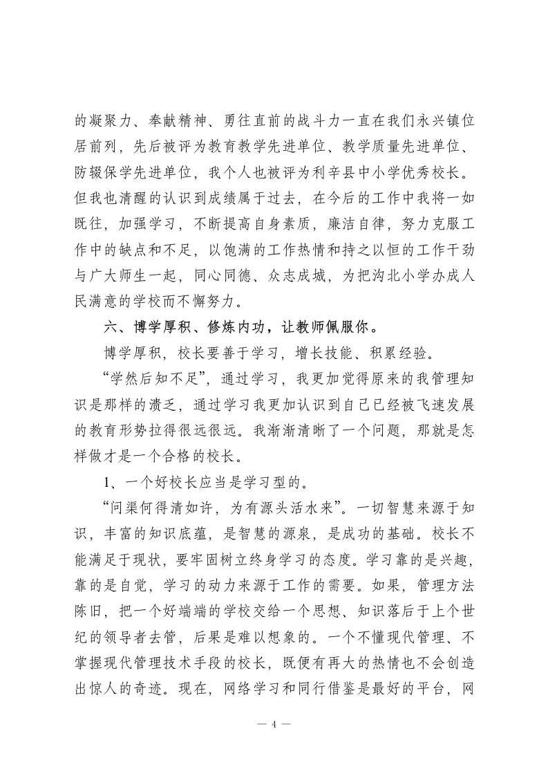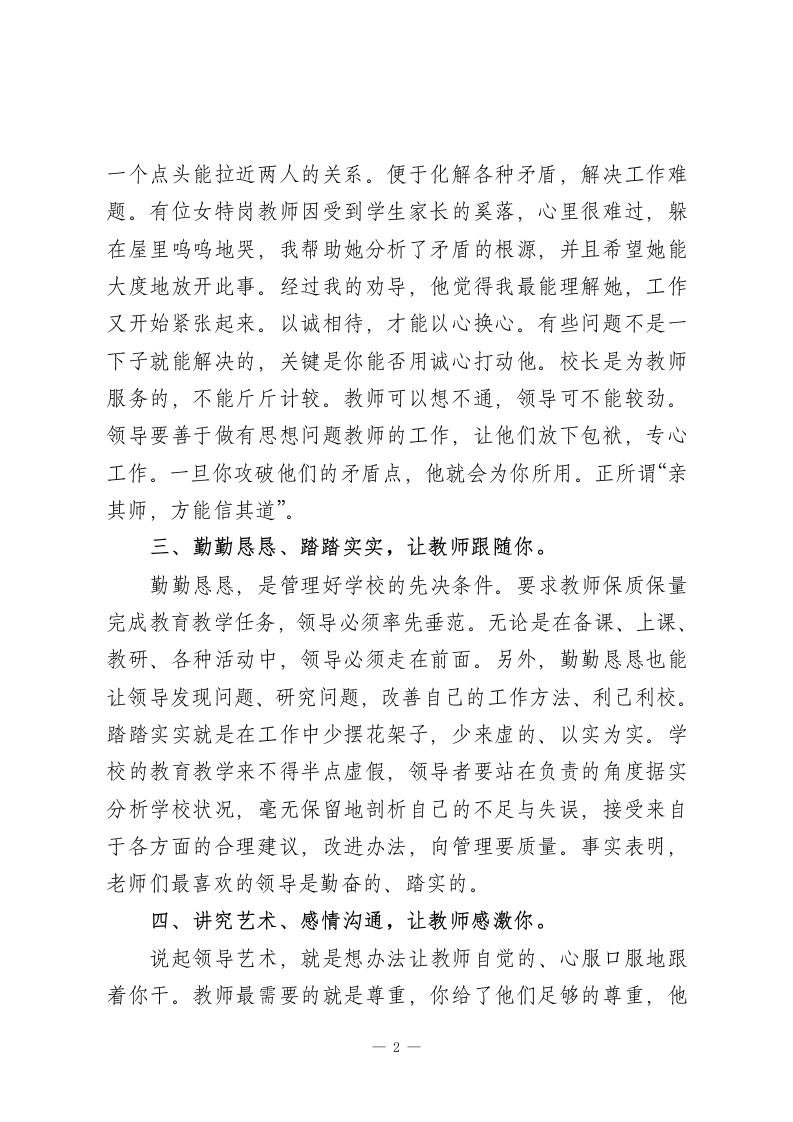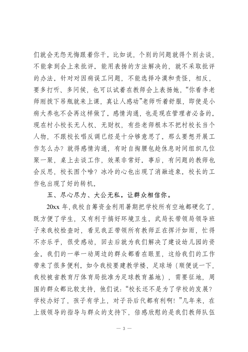 学校管理经验交流,校长发言,主要讲了6点尊敬的领导、各位同事:大家好!今天坐在这里,和大家一起交流学校管理经验,我真不知道说什么好,原因是我没有积累多少可用来交流的经验。只能把十几年来所做、所得和所感向大家汇报一下。主要有以下六点:一、公正公平、为人朴实,让教师敬重你。公正公平,是一个校长最难做到的。无论是在任命班主任、分配课程,还是在考核评价、荣誉奖励面前,有时校长很难吃得准。这方面我是这样做的,比如安排班主任和课程分配上,我始终做到教师个人的想法与学校整体安排相结合,在教师个人利益受到冲突时,教师必须牺牲个人利益服从集体。另外,不能厚此薄彼,照顾自己的亲属和朋友,相反要把最困难的工作尽量安排在他们身上,这样,在其他教师眼里,就会觉得这个校长还算公平。校长不要摆架子,从言谈举止到工作、生活都要和教师一样普普通通。让教师们感到你就是他们朋友中的一个,这也是嬴得教师敬重的一个方面。二、平易近人、以诚相待,让教师亲近你。平易近人,是处理好各种关系的前提。不管是与教师、学生家长,还是与外界人员办事,都需要做到这一点。一个微笑、-1