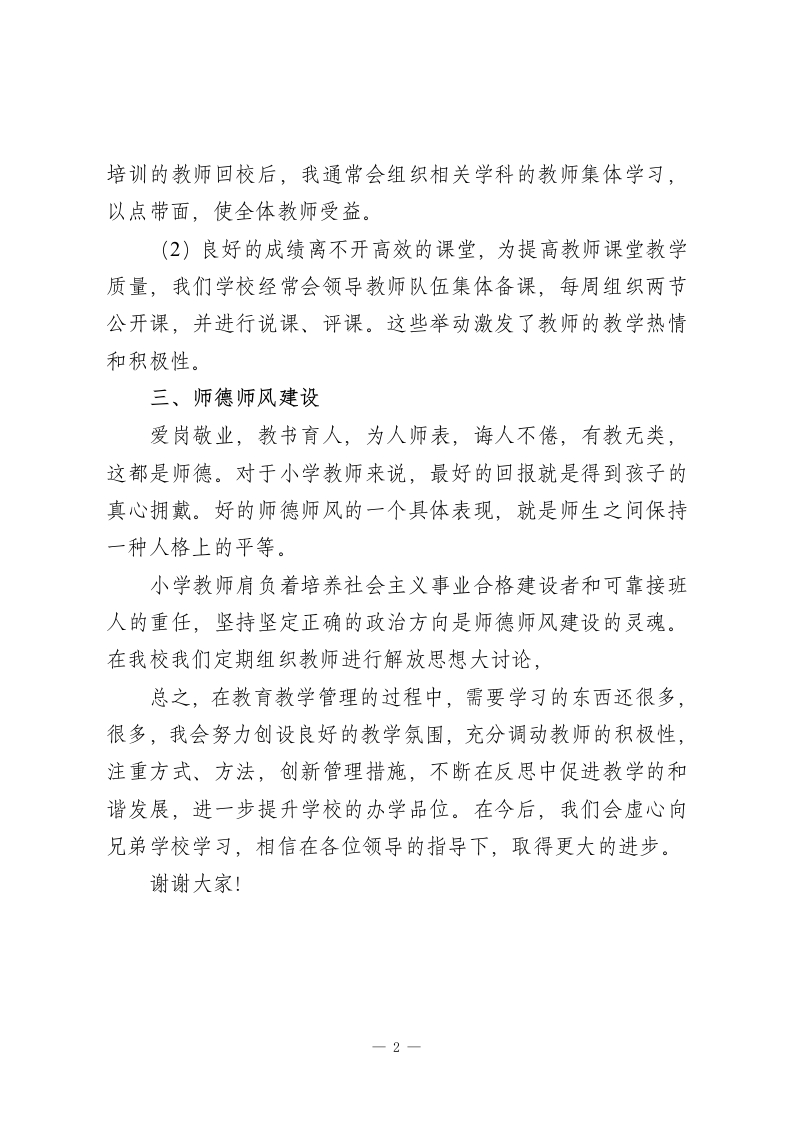 学校管理经验交流,校长讲话在今后,我们会虚心向兄弟学校学习,相信在各位领导的指导下,取得更大的进步尊敬的各位领导,各位同仁:大家好!首先感谢教育局领导给我这样一次学习与交流的机会,今天,能在这里和大家一起探讨教育教学管理方面的问题,我感到非常荣幸!下面,我就我校的教育教学管理方面的一些做法和体会,谨向各位领导如下,不当之处,敬请批评指正。一、以身作则,与时俱进。身为学校校长,首先,我在教学上以身示范,深入教育教学第一线亲自抓教学,成为教学的内行。二是在教学思想上,我努力成为教学思想的先行者。我要求自己勤于学习、善于思考,思想上要走在教师的前面,走在时代的前沿。不断用新的教学思想影响教师、感染教师,当好老师们教学上的带头人。而且,要求别人做到的我必须先做到,安排别人搞好的我必须先搞好,要以能服人,以绩服人。二、扎扎实实开展教研活动,促进教师专业发展。(1)国家大计,教育为本,教育大计,教师为本。教师的发展关系着学校教育的质量。为使学校教学研究跟上社会发展的步伐,我尽力选拔思想觉悟高,有奉献精神,业务能力强的青年教师参加外出培训学习,为打造骨干教师打下基础。外出1