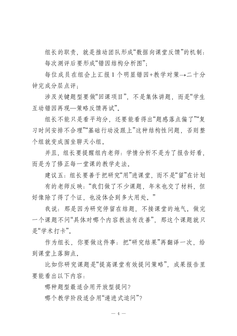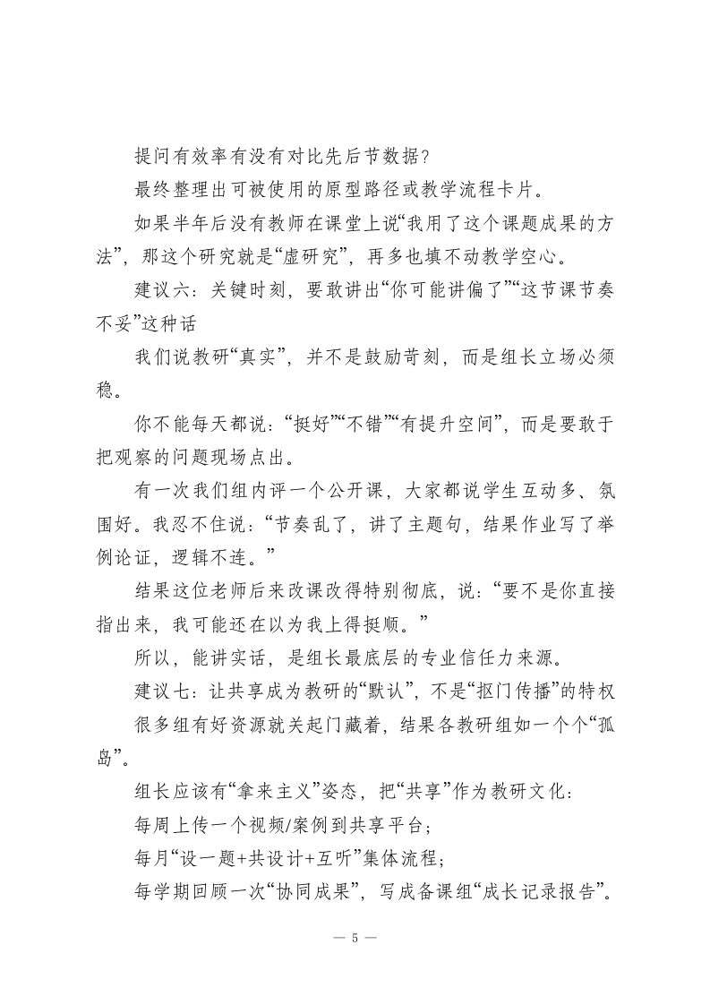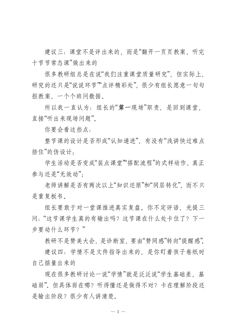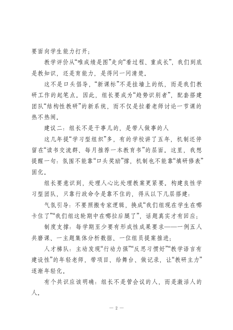 学校教研(科研)组长会议,校长讲话:深夜突发!让300位教研组长当场崩溃!尊敬的各位老师、组长们:大家上午好!今天站在这里,其实更像是一个“交流者”而非“讲授者”。我既想谈谈个人对教研科研工作的理解,也希望借此机会,把我们在推动教研质量、提升科研实效过程中,一些“堵点”“难点”的观察掏出来,跟大家共商、共研。这一段时间,我们在反思校内部分教研科研组工作的开展情况,发现虽然形式上热闹,但在实操中仍然存在“泛化、零散、短效”的问题。组长队伍能力层次不齐,部分“以会代研、以交代作任务”的倾向也比较明显。所以,今天我就围绕“教研科研组长”的职责定位与能力锻造,聊九条很实在的建议一它既是对过去经验的总结,也是对未来工作的期待。建议一:方向比努力重要,要站在改革大潮上看清坐标教育这几年,比过去任何时候都变化快。我们教研科研想真干事、干成事,首先得读懂这股“大势”。组长要把自己放在国家教育改革的语境下,形成“三个预判”:育人导向正在从“会考试”转向“会学习”,本质上是从知识输出转向核心素养;教学重心从“老师讲得清”改变为“学生学得透”,学科逻辑是一1