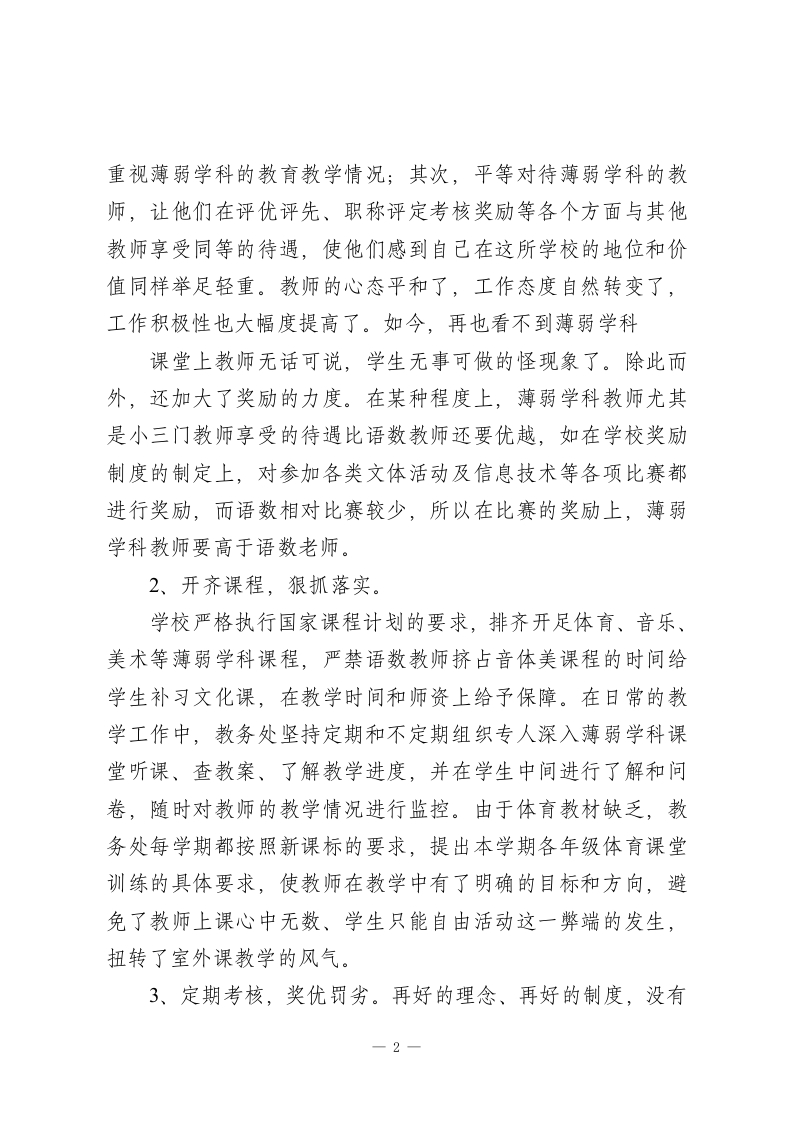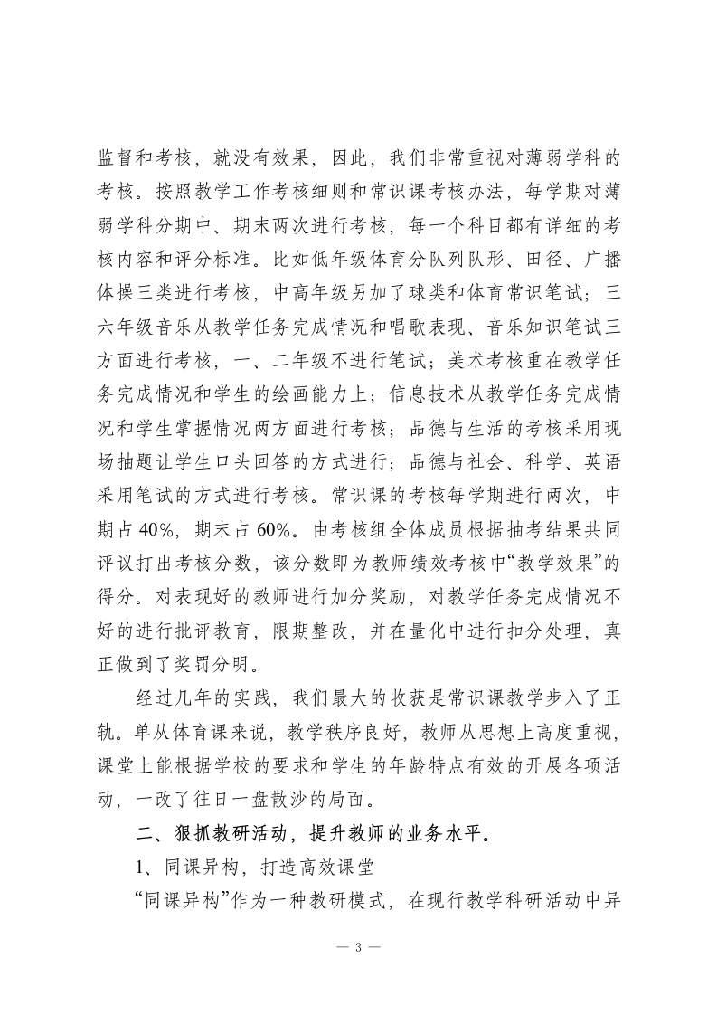 学校亮点工作汇报,校长讲话,主要讲了在教学管理上重点开展的几项工作各位领导:近年来,在局领导的关心支持下,在冯校长的正确领导和全体教师的共同努力下,我校的各项工作都取得了长足的发展。下面,我主要向各位领导汇报一下在教学管理上重点开展的几项工作。一、狠抓薄弱学科教学促进学生全面发展长期以来,由于受诸多因素的影响,薄弱学科在小学阶段备受冷落,有的甚至被忽视或放弃了,连正常的课也不能开齐开足。鉴于这样的认识,从20xx年起,冯校长在充分调研的基础上,在总结了以往经验教训的基础上,研究制定出了一整套完整的常识课考核方案。将音、体、美、信息技术、科学、品德与社会、品德与生活、英语等薄弱学科教学当作学校整体教学工作的重要组成部分,纳入了量化考核的范畴,并采取一系列措施,突出薄弱学科教育的鲜明化、制度化,做到了人无我有,人有我新,人新我特。从而有效地促进了学生的全面发展和学校办学特色的形成。1、制度引领,平等对待制度是管理的基础,也是学校正常的教育教学秩序的保证。为此,我校首先建立健全了各项考核奖励制度,把薄弱学科放到与语、数、同等重要的位置,使得从领导到全体教师都开始-1