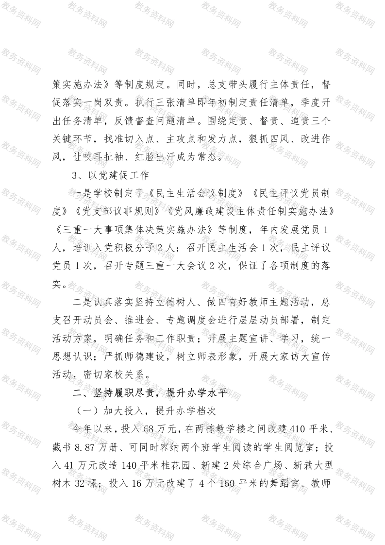 学校一年工作情况汇报促进学校办学水平和素质教育质量再上新的台阶一年来,在区委、区政府和区教体局的正确领导下,学校全体教职工创新进取,勤奋实干,实现了学校整体办学水平的稳步提升。2025年,我校1人市政府表彰为市教书育人楷模、1人被表彰为区人民满意教师,我本人被表彰为区人民满意校长。现将工作情况汇报如下:一、坚持党建引领,严格落实主体责任1、加强理论学习,带头强化政治纪律坚持个人带动。总支班子坚持以身作则、率先垂范,沉下心来读原著、学原文、悟原理,做到真学真懂、真信真用,工作中,带头讲党课、谈体会、作报告,以实际行动带动党员干部的学习。坚持支部推动。各支部制定了《2025年工作计划》《2025年支部学习计划》《学习型党小组评选方案》,坚持支部统领、党小组管理、党员参与方式,认真抓实三会一课,深入开展主题党日以及党员活动,积极开展专题学习、研讨交流、主题党课等活动,做到融入日常、抓在经常。一年来,学校党支部共组织班子集中学习7次,上党课3次,召开全体党员大会4次,组织党小组学习9次。2、从严管党治党,带头执行廉洁从教坚持依法治校,依法执教。支部制定了《党支部议事规则》《党风廉政建设主体责任制实施办法》《三重一大事项集体决