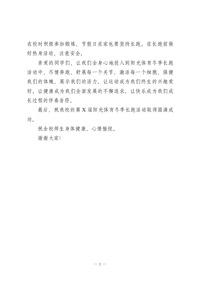 阳光体育冬季长跑活动启动仪式,校长发言让运动成为我们终生的兴趣爱好。让健康成为我们全面发展的不懈追求尊敬的老师、亲爱的同学们:今天,我们在此隆重举行我校第X届阳光体育冬季长跑活动启动仪式。本届主动的主题为“阳光体育绿色公益跑”。为开展好此次活动,我代表学校提出几点希望:一、希望全体师生提高认识,积极参与长跑是一项简单但效果明显的健身运动,它有益于我们的身心健康,有益于我们培养良好的体育锻炼习惯和健康的生活方式。希望全体同学充分认识开展冬季长跑活动,是磨练意志品质,培养良好习惯,有效提高体质特别耐力素质水平的重要举措;充分认识到提高身体素质和学好科学文化知识是同等重要,希望大家努力做到德智体全面发展,认真主动地参与到这次活动中去。二、希望科任教师、各班级认真组织,注重质量各班要按照学校要求认真组织,全员参与,全体班主任和科任教师全程参与管理,在活动过程中做到队形整齐,步调一致。切实提高冬季长跑质量,真正做到促进自我身体素质的提高和发展。三、坚持锻炼,注意安全习惯的养成贵在坚持,希望全体同学坚持每日跑步,不但1