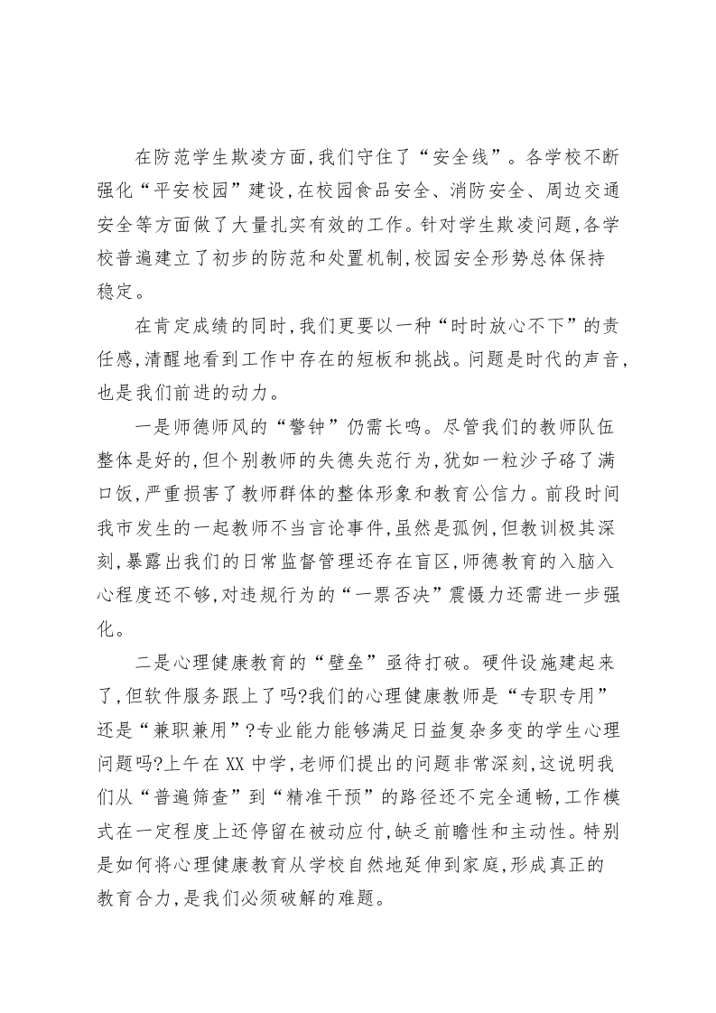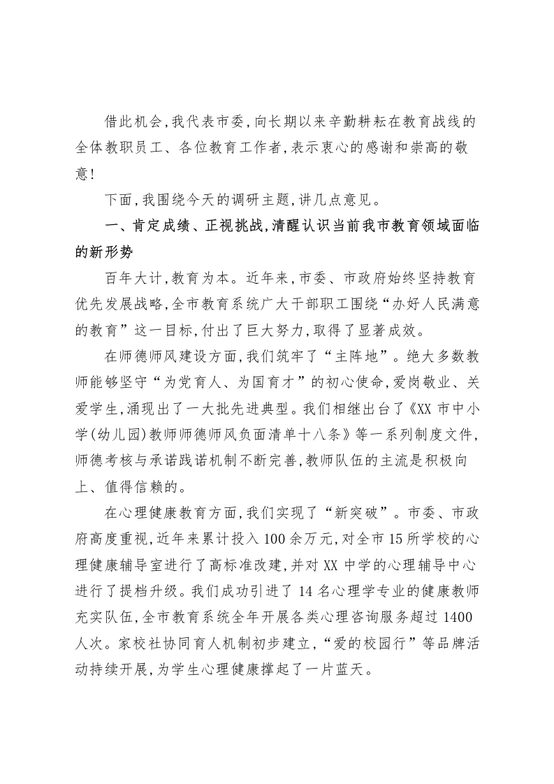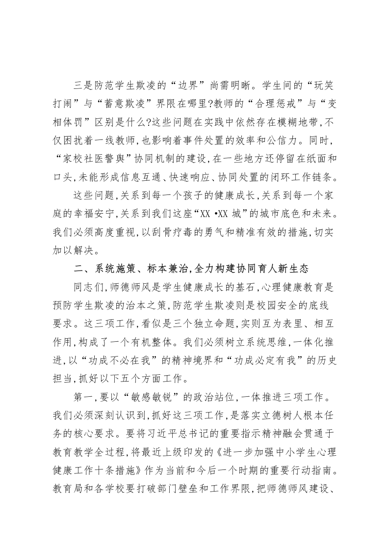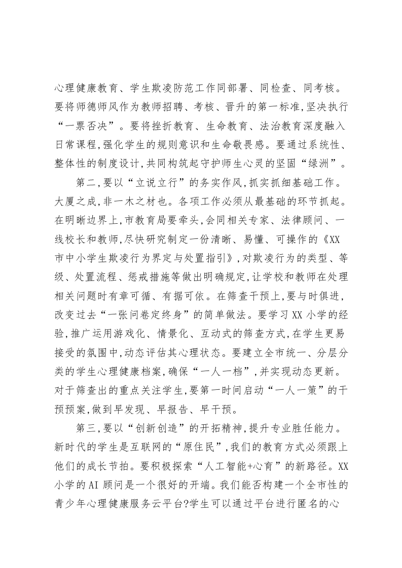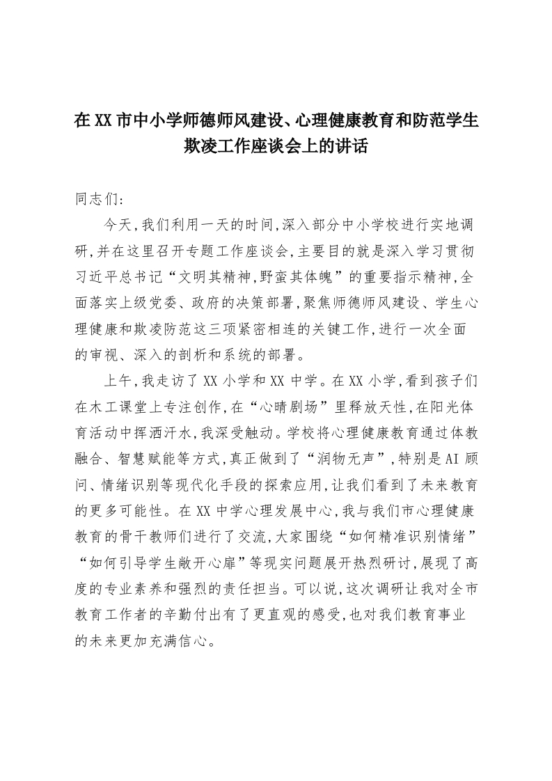 在XX市中小学师德师风建设、心理健康教育和防范学生欺凌工作座谈会上的讲话同志们:今天,我们利用一天的时间,深入部分中小学校进行实地调研,并在这里召开专题工作座谈会,主要目的就是深入学习贯彻习近平总书记“文明其精神,野蛮其体魄”的重要指示精神,全面落实上级党委、政府的决策部署,聚焦师德师风建设、学生心理健康和欺凌防范这三项紧密相连的关键工作,进行一次全面的审视、深入的剖析和系统的部署。上午,我走访了XX小学和XX中学。在XX小学,看到孩子们在木工课堂上专注创作,在“心晴剧场”里释放天性,在阳光体育活动中挥洒汗水,我深受触动。学校将心理健康教育通过体教融合、智慧赋能等方式,真正做到了“润物无声”,特别是AI顾问、情绪识别等现代化手段的探索应用,让我们看到了未来教育的更多可能性。在XX中学心理发展中心,我与我们市心理健康教育的骨干教师们进行了交流,大家围绕“如何精准识别情绪”“如何引导学生敞开心扉”等现实问题展开热烈研讨,展现了高度的专业素养和强烈的责任担当。可以说,这次调研让我对全市教育工作者的辛勤付出有了更直观的感受,也对我们教育事业的未来更加充满信心。