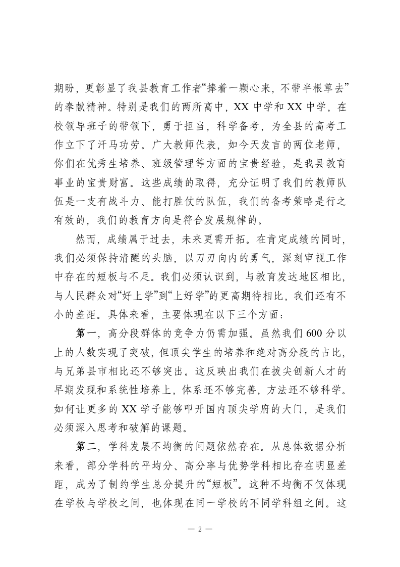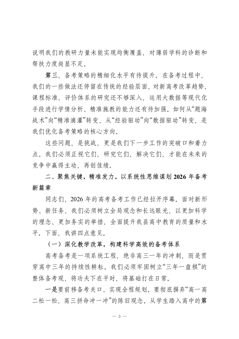 在XX县2025年高考工作复盘分析总结会上的讲话同志们:今天,我们怀着对过去一年辛勤付出的敬意和对未来美好蓝图的期许,在这里隆重召开全县2025年高考工作复盘分析总结会。这次会议的主要任务是,全面总结分析我县2025年高考工作的经验与不足,深入剖析当前高中教育面临的新形势、新挑战,并在此基础上,系统谋划、周密部署2026年的高考备考工作。首先,我代表县委、县政府,向在2025年高考中取得优异成绩的全体师生表示热烈的祝贺!向辛勤耕耘在教育战线上的广大教职员工,以及长期以来关心支持我县教育事业发展的各级各部门、社会各界人士,致以最崇高的敬意和最诚挚的感谢!一、肯定成绩,正视差距,在回顾与反思中坚定前行信心刚刚过去的2025年,是我县教育事业砥砺奋进、硕果累累的一年。在县委、县政府的坚强领导下,在全县上下的共同努力下,我们克服了重重困难,高考工作取得了令人鼓舞的成绩。根据县教育局的通报,今年我县高考600分以上的考生达到了21人,特殊类型招生控制线上线人数达到328人,本科上线总人数为845人。这三大核心指标的完成率均超过了XX州下达的目标任务,整体成绩位居全州前列。这一份沉甸甸的成绩单,来之不易。它凝聚了全体高三师生夜以继日的拼搏与汗水,承载了全县人民对优质教育的殷切1