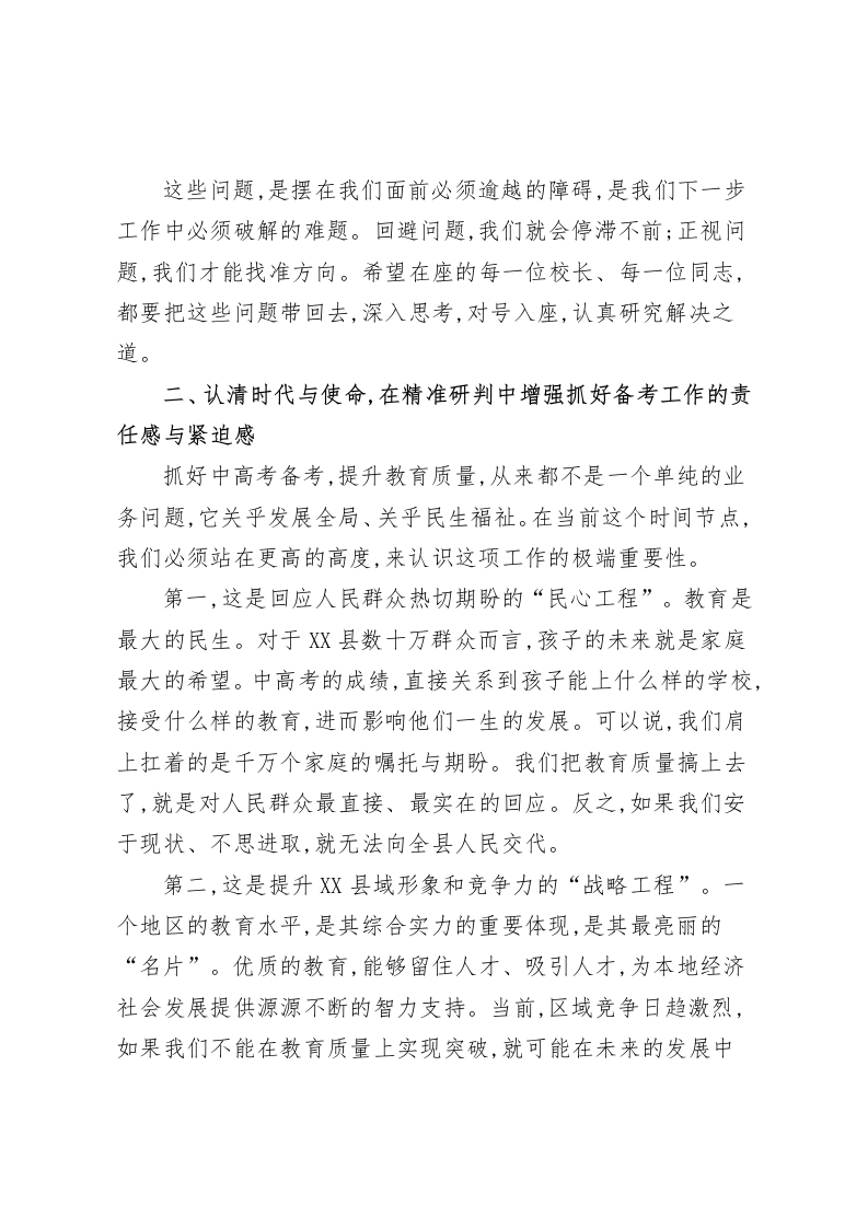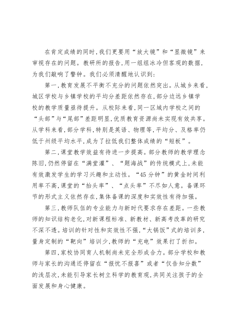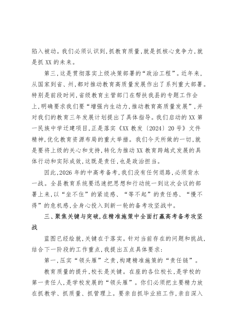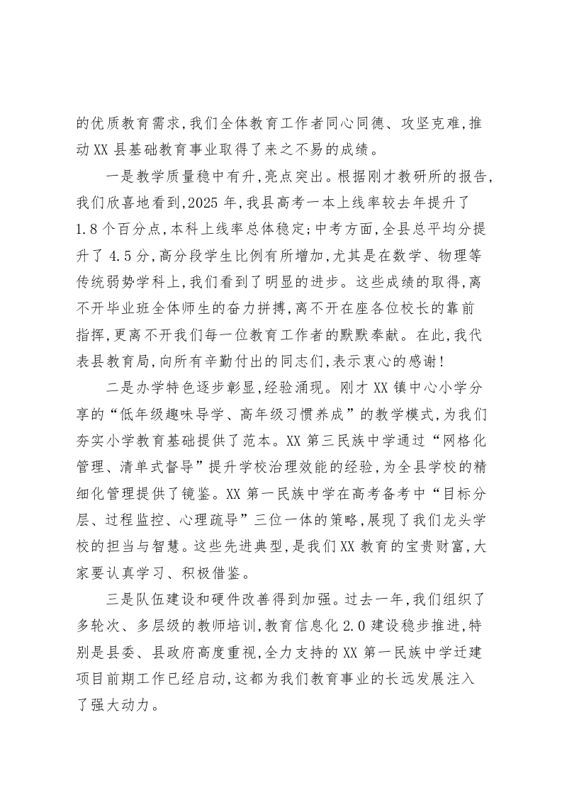 在X县2025年基础教育质量分析暨中高考备考工作启动会议上的讲话同志们:今天,我们在这里召开全县基础教育质量分析暨中高考备考工作启动会议,这是一次承前启后、继往开来的关键会议。刚才,XX同志宣读了表彰决定,教研所对2025年全县的教学质量进行了全面、详实的数据剖析,XX镇中心小学、X第三民族中学、XX第一民族中学三所学校的代表也从不同维度分享了宝贵的实践经验。他们的发言,既展示了我们过去一年辛勤耕耘的成果,也为我们接下来的工作提供了有益的启示。召开这次会议,目的非常明确:就是要以最客观的数据回顾过去,以最清醒的头脑分析现在,以最坚定的决心部署未来。2026年的中高考,不仅是对我们教学成果的一次大检阅,更是关系到XX县千家万户切身利益、关系到XX教育未来声誉的一场硬仗。我们必须统一思想、凝聚共识,以“起步即冲刺,开局即决战”的姿态,全面开启新一轮的备考周期。下面,我围绕“回顾总结、分析形势、部署任务”三个方面,讲几点意见。一、正视成绩与不足,在回顾反思中坚定高质量发展的信心与决心过去的一学年,是全县教育系统迎难而上、砥砺奋进的一年。面对教育改革的深化、生源结构的变动以及人民群众日益增长