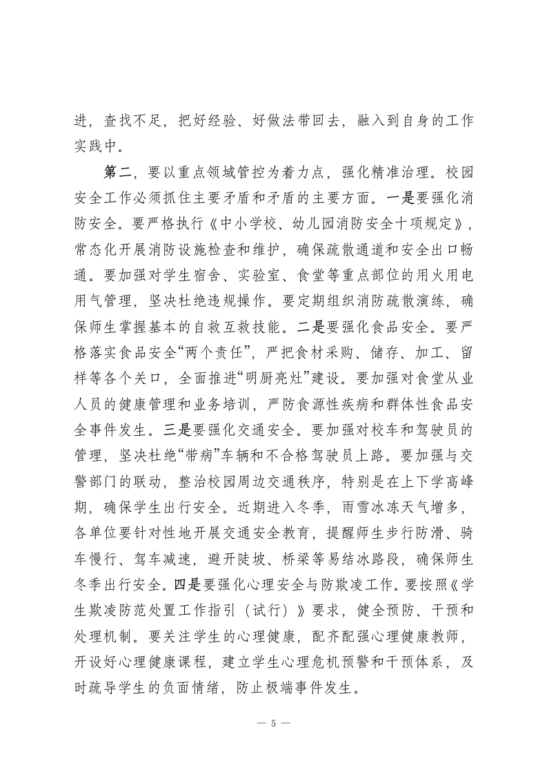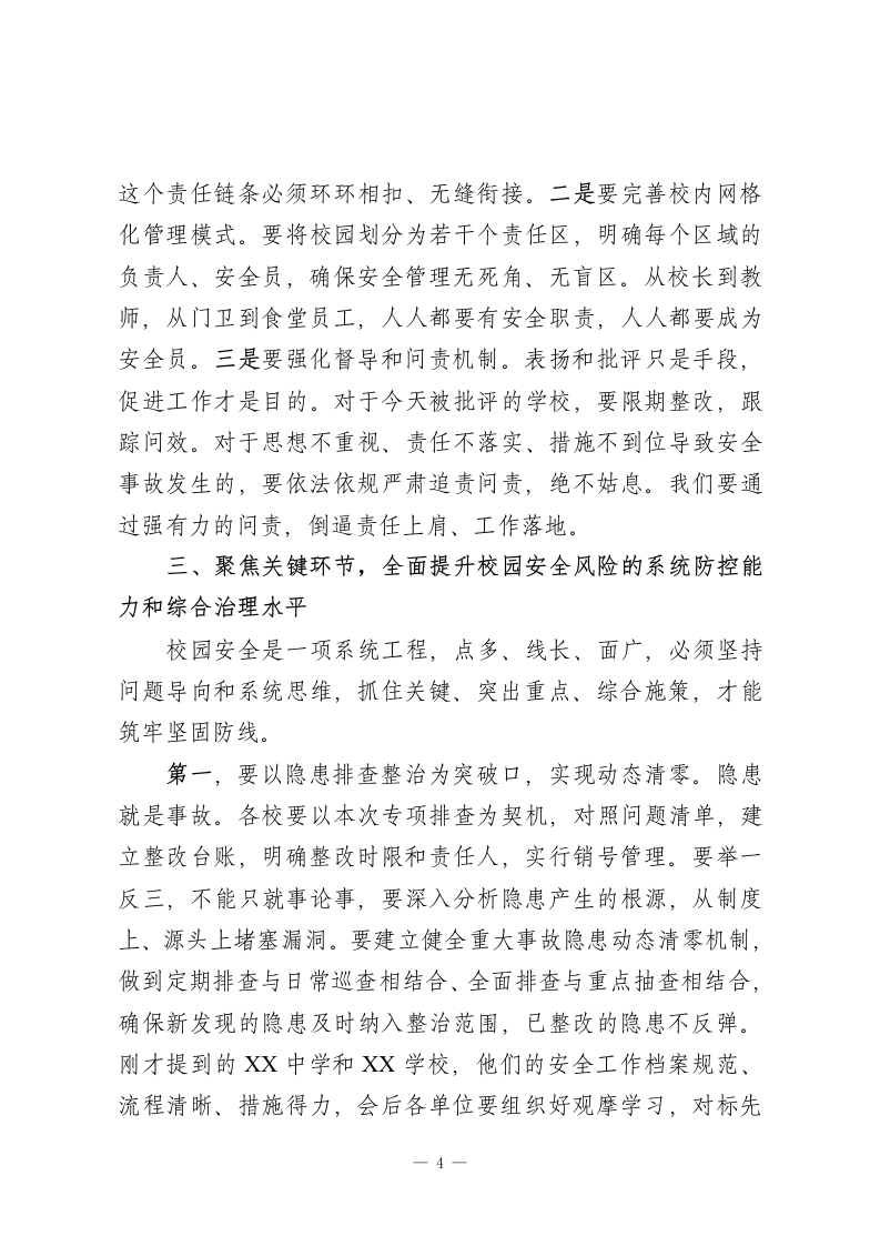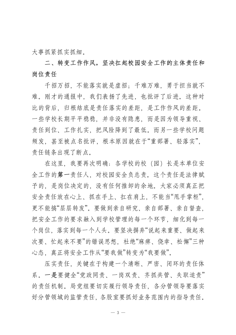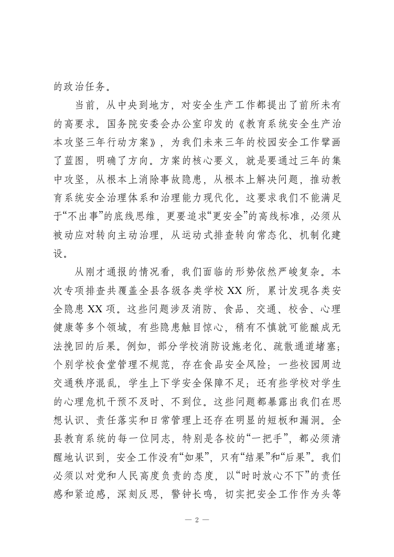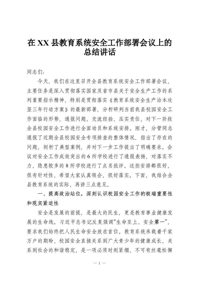 在XX县教育系统安全工作部署会议上的总结讲话同志们:今天,我们在这里召开全县教育系统安全工作部署会议,主要任务是深入贯彻落实国家及省市县关于安全生产工作的系列重要指示精神,特别是贯彻落实《教育系统安全生产治本攻坚三年行动方案》的最新部署,分析研判当前我县校园安全工作面临的形势,通报问题、交流经验、压实责任,对下一阶段全县校园安全工作进行全面动员和系统安排。刚才,分管同志通报了近期全县校园安全专项排查的整体情况,指出了存在的问题,剖析了典型案例,并对下一步工作提出了明确要求。会议对安全工作成效突出的6所学校进行了通报表扬,对落实不力、隐患较多的8所学校进行了点名批评。这些安排都很好,很有针对性,希望大家认真领会,抓好落实。下面,我结合全县教育系统的实际,再讲三点意见。一、提高政治站位,深刻认识校园安全工作的极端重要性和现实紧迫性安全是发展的前提,是最大的民生,更是教育事业健康发展的生命线。习近平总书记反复强调“生命至上、安全第一”,要求我们始终把人民生命安全放在首位。教育系统承载着千家万户的期盼,校园安全直接关系到广大青少年的健康成长,关系到社会的和谐稳定,是一项必须时刻紧绷、不可有丝毫松懈1