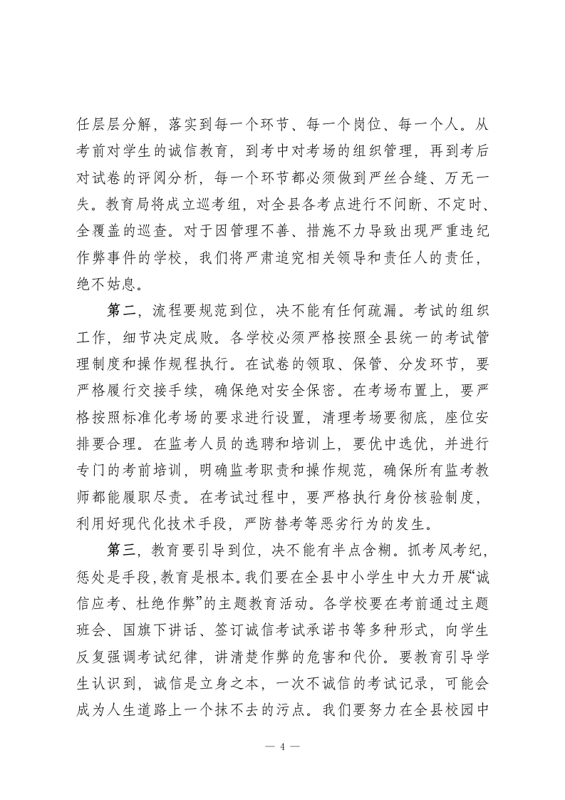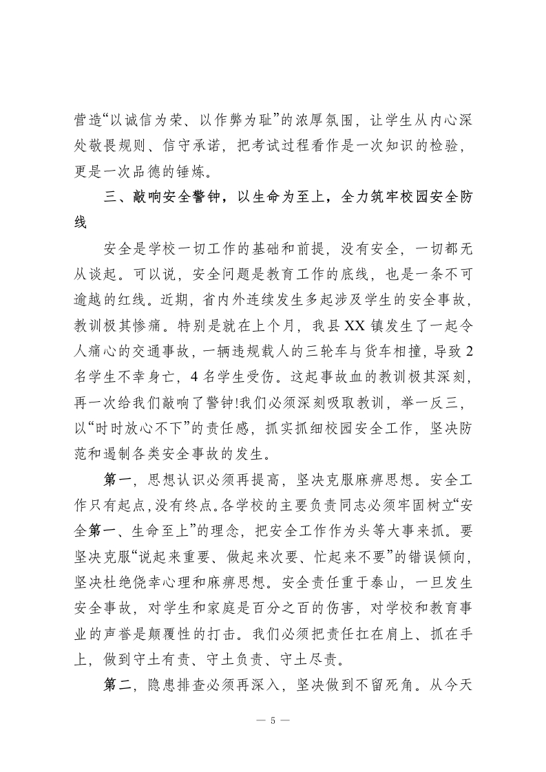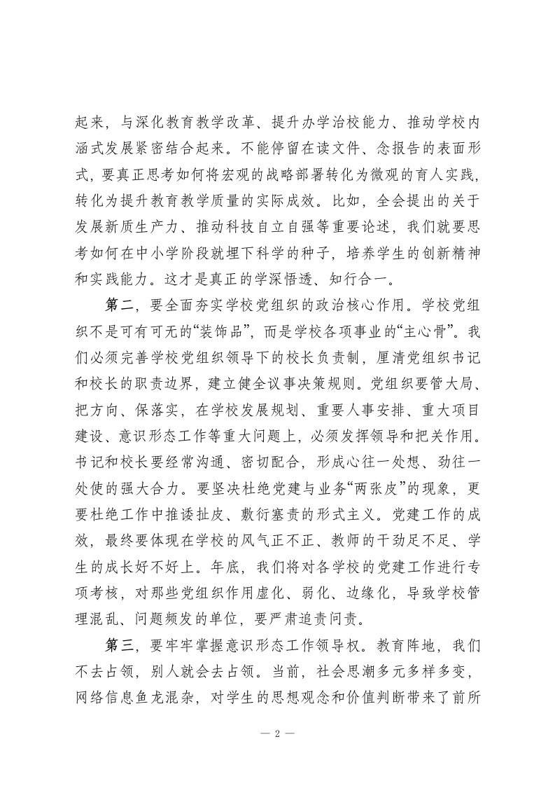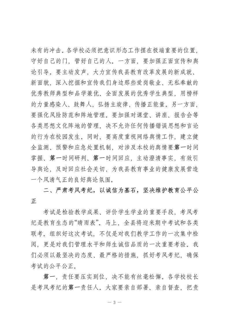 在XX县全县学校(幼儿园)工作会议上的讲话同志们今天,我们在这里召开全县学校(幼儿园)工作会议,主要任务是深入分析当前我县教育工作面临的新形势、新挑战,总结近期工作,并就下一阶段的重点任务进行全面部署和动员。刚才,几位分管同志已经就具体业务工作提出了明确要求,我都同意,希望大家认真领会,抓好落实。下面,我再强调五个方面的意见。一、提高政治站位,以党建为引领,牢牢把握社会主义办学方向教育是国之大计、党之大计。我们必须清醒地认识到,我们办的是社会主义教育,根本任务是立德树人,是为党育人、为国育才。全县教育系统的同志们,特别是各学校的党组织书记和校长,必须旗帜鲜明讲政治,把党的全面领导贯穿于办学治校、教书育人的全过程和各方面。第一,要深入学习贯彻党的二十届四中全会精神。党的二十届四中全会为我们国家未来一个时期的发展擘画了宏伟蓝图,也为我们教育事业的发展指明了前进方向。各学校党组织要将学习宣传贯彻全会精神作为当前和今后一个时期的首要政治任务,迅速组织传达学习,确保精神入脑入心。关键在于“结合”与“转化”。要把全会的精神要义与学校的实际工作紧密结合1