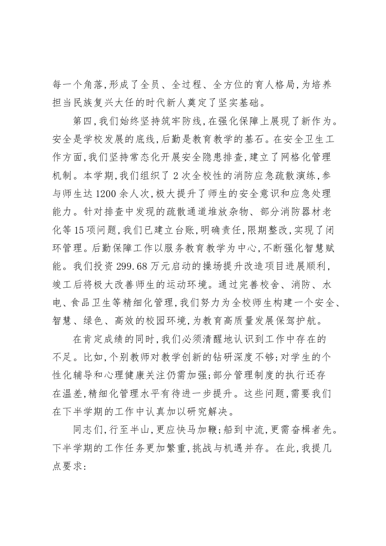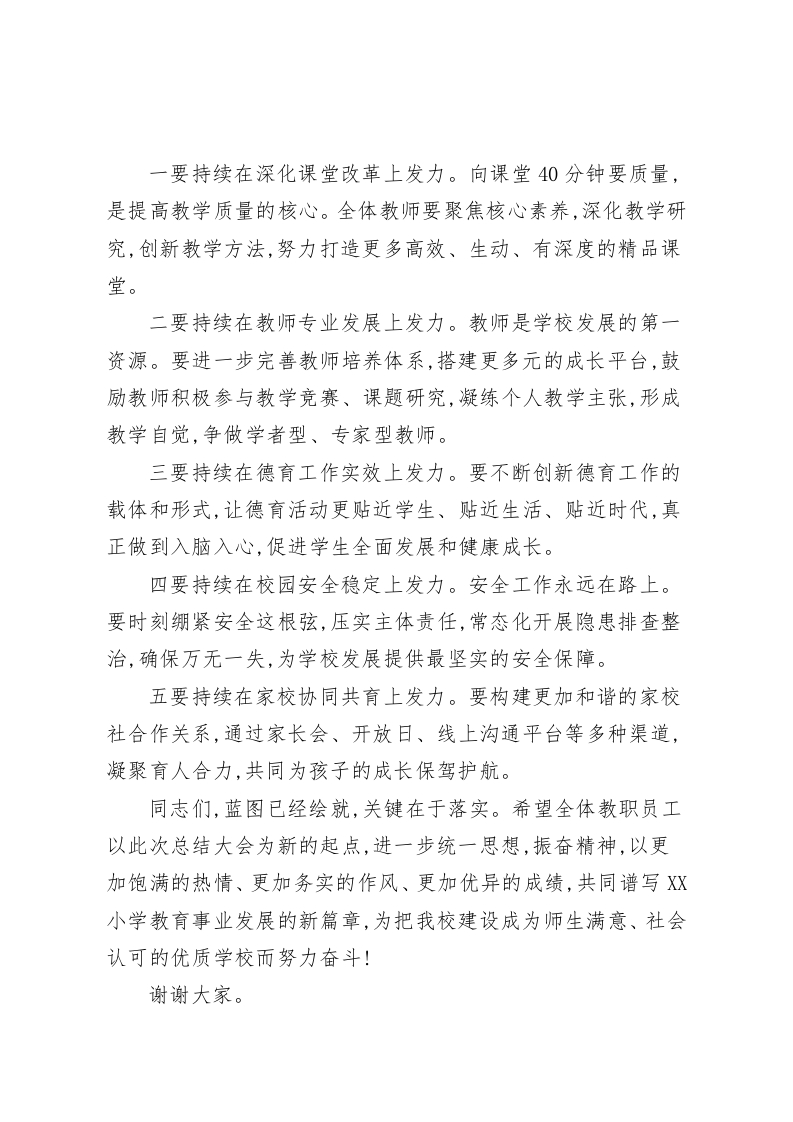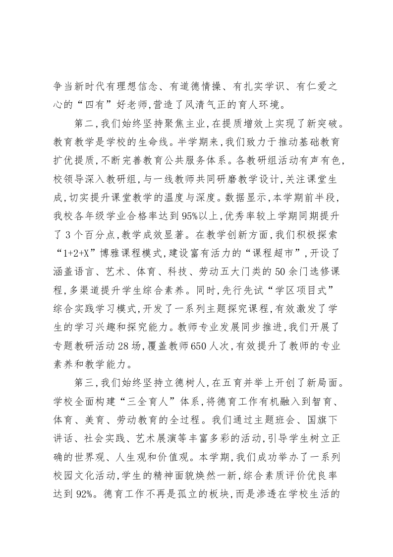 在XX小学2025年秋季学期期中总结大会上的总结讲话同志们:今天,我们齐聚一堂,隆重召开2025年秋季学期期中总结大会。这次会议既是一次回顾过去、盘点成果的总结会,也是一次分析形势、查找问题的反思会,更是一次凝聚共识、谋划未来的动员会。刚才,各部门负责人就半学期来的工作进行了汇报,内容详实,重点突出。在此,我代表学校,向辛勤耕耘在教育教学、管理服务一线的全体教职员工,表示最衷心的感谢和最诚挚的敬意!半学期以来,全校上下紧紧围绕学期初制定的工作目标,凝心聚力,锐意进取,各项事业呈现出良好的发展态势,为推动学校教育教学高质量发展注入了强劲的新动能。第一,我们始终坚持政治引领,在铸魂育人上取得了新成效。学校将深入学习党的二十届四中全会精神作为首要政治任务,通过专题学习、交流研讨等形式,引导全体教师深刻领会核心要义,不断提高政治站位。我们系统学习了《中共中央关于制定国民经济和社会发展第十五个五年规划的建议》原文,将服务教育强国建设的宏伟蓝图内化于心、外化于行,增强了全体教职员工的责任感与使命感。在师德师风建设方面,我们坚持师德第一标准,完善制度体系,健全了新时代师德师风建设的长效机制。学校对师德违规行为保持“零容忍”的高压态势,通过警示教育、榜样引领等多种方式,引导广大教师自律自强、爱岗敬业,自觉