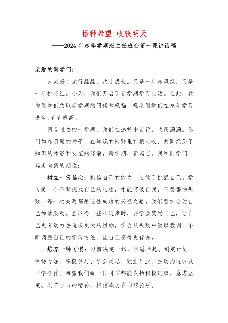 播种希望收获明天2024年春季学期班主任班会第一课讲话稿亲爱的同学们:大家好!龙行龘龘,共赴成长。又是一年春风绿,又是一年桃花红。今天,我们开启了新学期学习生活。在此,我向同学们致以新学期的问候和祝福,祝愿同学们在龙年学习进步,节节攀高。回首过去的一学期,我们在热爱中前行,收获满满。你们如春日里的种子,在知识的田野里扎根生长,共同经历了知识的沐浴和友谊的浇灌。新学期,新起点,我和同学们一起走向新的期望:树立一份信心:相信自己的能力,要敢于挑战自己。学习是一个不断挑战自己的过程,才能突破自我。不要害怕失败,每一次失败都是通往成功的必经之路。我们要学会为自己加油鼓劲。当取得一些小进步时,要学会奖励自己,让自己更有动力去追求更大的目标。学会从失败中汲取教训,不断调整自己的学习方法,让自己变得更优秀。培养一种习惯:习惯决定一切,早睡早起、制定计划、保持专注、积极参与、学会反思、独立作业、主动沟通以及同学合作。希望我们每一位同学都能发扬积极进取、意志坚定、刻苦学习的精神,相信成功在向您招手。