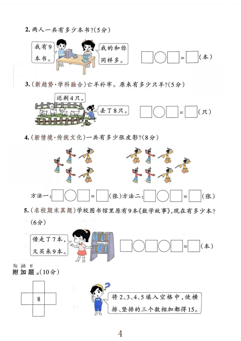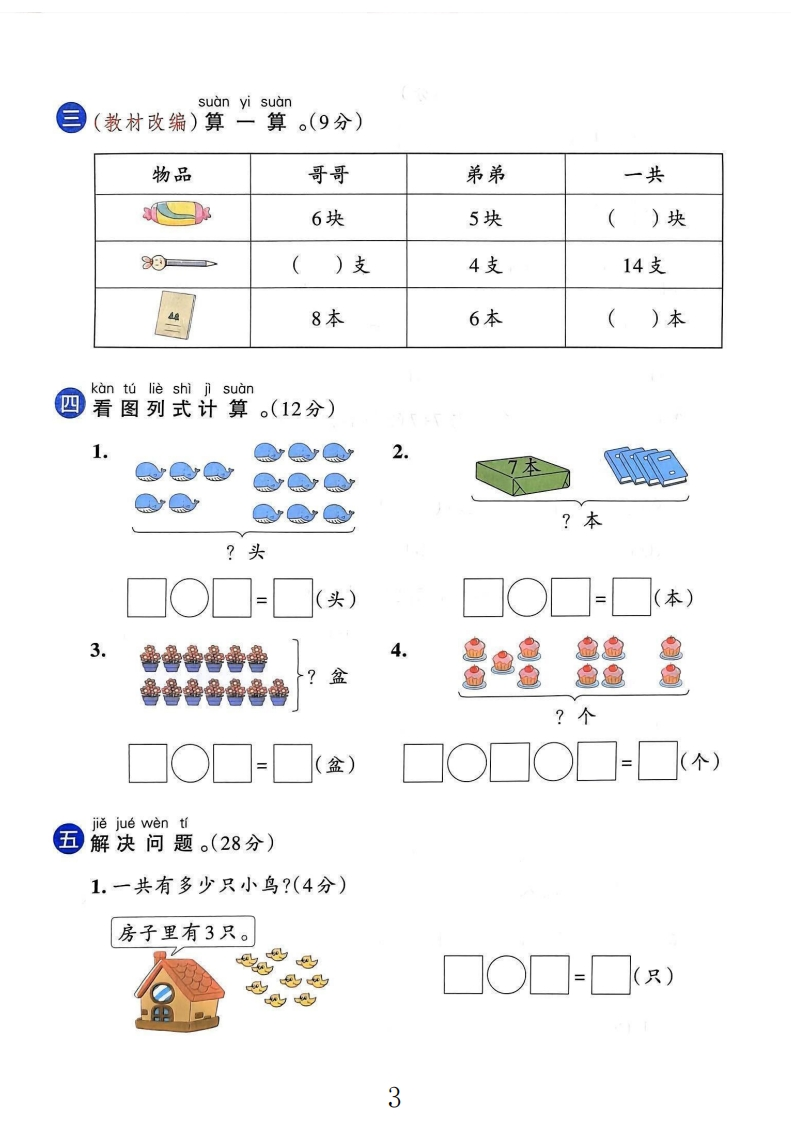 2025人教版一年级数学上册第五单元测试卷第五单元测试卷检测时间:60分钟满分:100分+10分题序三四五附加题总分等级得分an yao qiu wan cheng xia lie ge ti按要求完成下列各题。(39分)1.先圈出10个,再算一算。(9分)吧早丹名0a⑦f000自目自图会身吧身骨含⑦⑦⑦d00r0自0旧08+62.口算。(16分)8+3=4+7=6+9=9-3+8=7+7=2+9=8+4=4+5+7=9+3=7+5=6+7=4+4+5=5+9=8+7=9+9=7+9-10=3.在O里填上“>”“<”或“=”。(8分)2+9(127+4()11159+76+87+53+81014(○5+98+8139+47+71