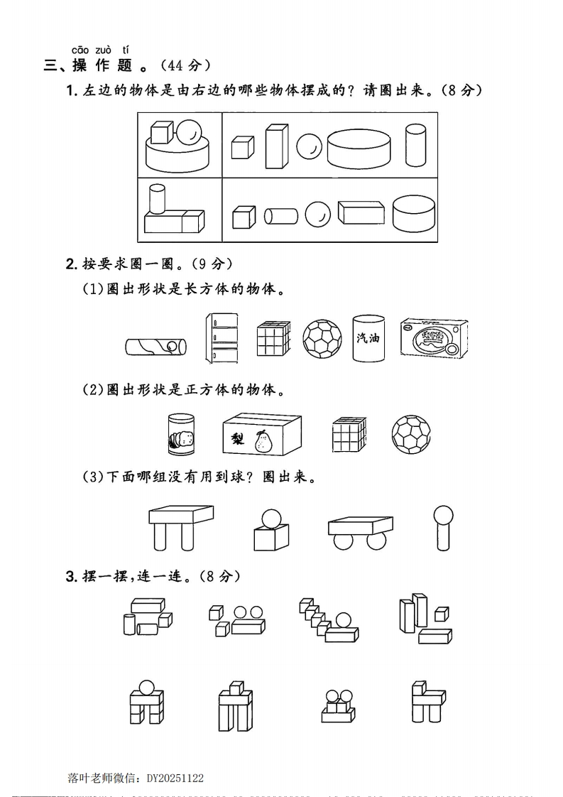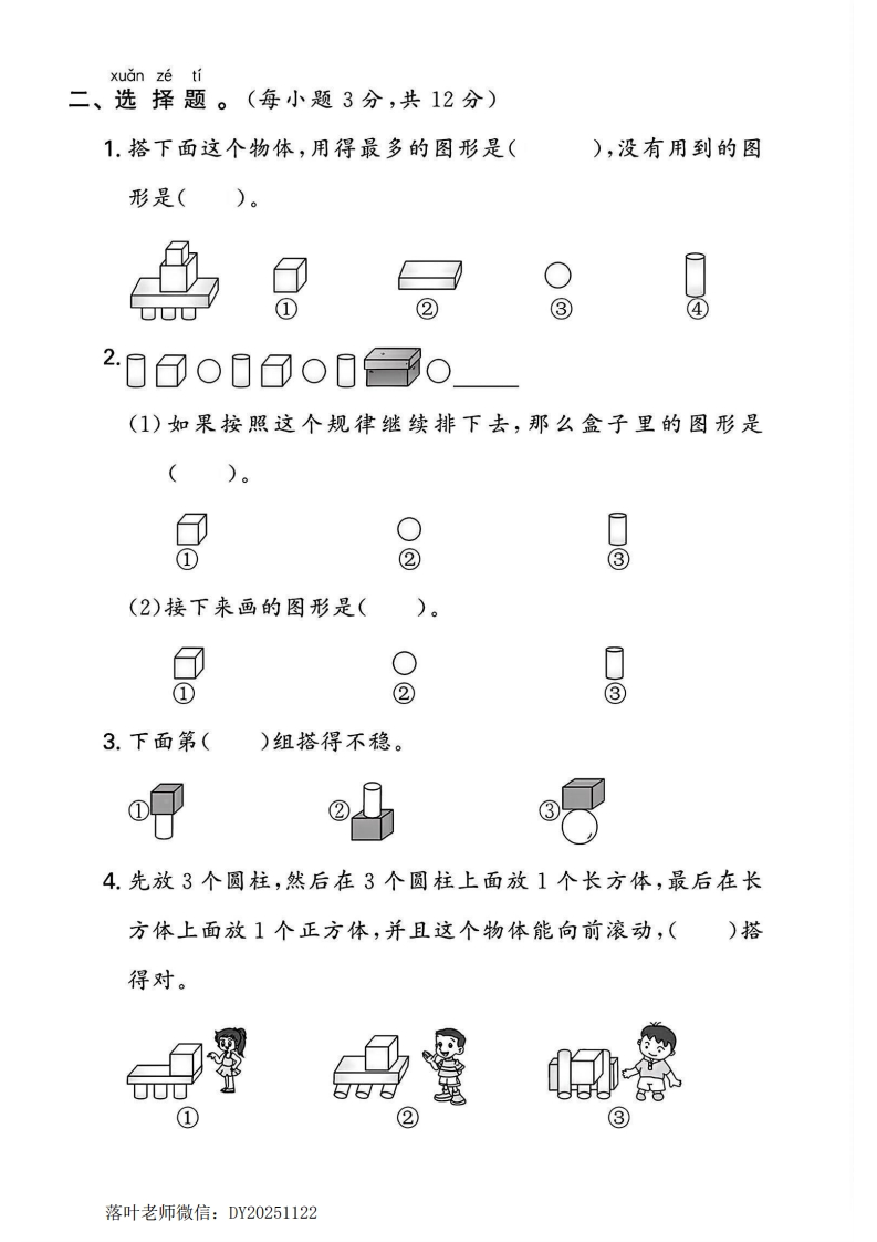 2024北师大版一年级数学上册第五单元测试卷2tangqi8823天前发布关注私信3.03MB8页03510 第1页 / 共8页 第2页 / 共8页 第3页 / 共8页 第4页 / 共8页 第5页 / 共8页 试读已结束,还剩3页,您可下载完整版后进行离线阅读 2024北师大版一年级数学上册第五单元测试卷2此内容为付费资源,请付费后查看¥9.9¥19.9VIP会员免费立即购买您当前未登录!建议登陆后购买,可保存购买订单付费资源© 版权声明本站是一个信息分享及获取的平台,不确保部分用户上传资料的来源及知识产权归属,资料由老师投稿,公开渠道整理,网友上传,如果侵犯到您的权益,请联系客服删除THE END试卷资料 文本预览 2024北师大版一年级数学上册单元试卷第五单元测试卷时间:40分钟满分:100分p孙tian kong ti一、填空题。(每空2分,共24分)1.数一数,填一填。o00000o0(1)0有()个,日有()个,0有()个,0有拟)个。(2)从右数,第()个和第()个是(3)左边的第4个图形是()。(填图形名称)2.下面是安安用积木摆的两个小车。杀(1)()号小车可以滚动。(2)两个小车共用了()个子,()个⑦,()个孙0,()个0.落叶老师微信:DY20251122 查看更多 收起部分 喜欢就支持一下吧点赞10 分享QQ空间微博QQ好友海报分享复制链接收藏