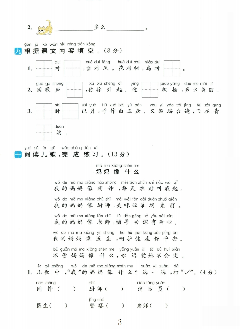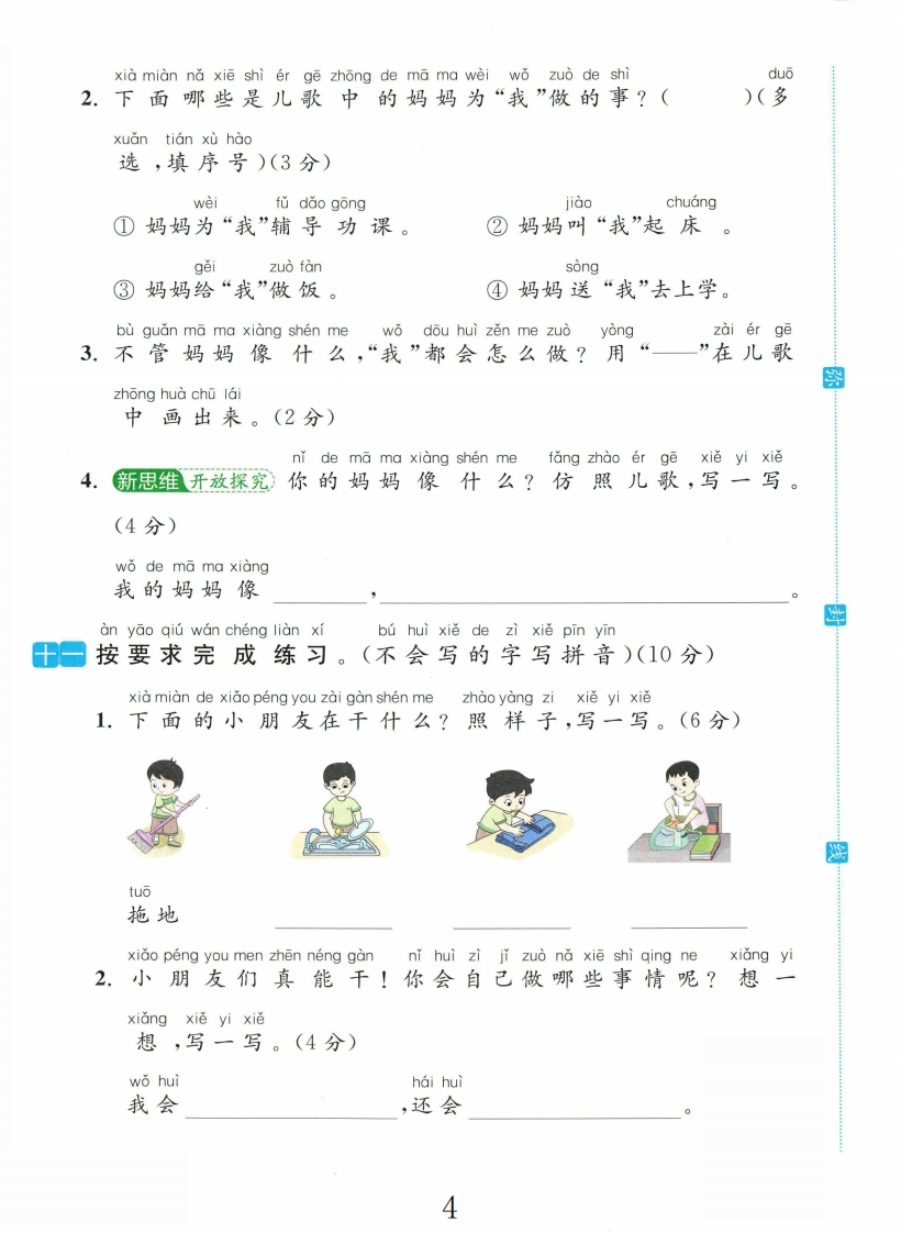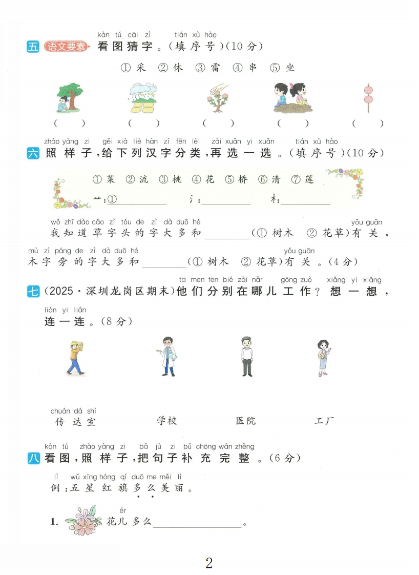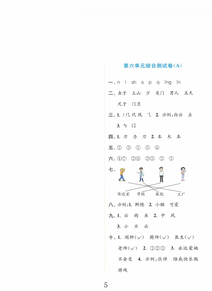 2025一年级语文上册第六单元测试卷第六单元测试卷时间:60分钟满分:100分靴du yi dugěijia dian zi xuan ze zheng que de sheng m心huòyùnmǔ读一读,给加点字选择正确的声母或韵母。(8分)n-ls-shp-gin-ingǚǜengen9女生绿叶声音森林果皮起来清水金色kan pin yin xieězici看拼音,写字词。(15分)製chongzit心shanduoshaoguan men多nan renWutianchizimen weian yao qiu tian kong目按要求填空。(6分)de bi shun shidi er bi shi1.“风”的笔顺是,第二笔是kězǔcijia yi bi kěbian chengzi2.“云”可组词:,加一笔可变成“”字。de pian pang shide pian pang shi3.“包”的偏旁是,“国”的偏旁是bi yi bi xuǎn zi zu ci四比一比,选字组词。(6分)1.力刀中小(()气)尖tou2.本木中课()》)头)来1