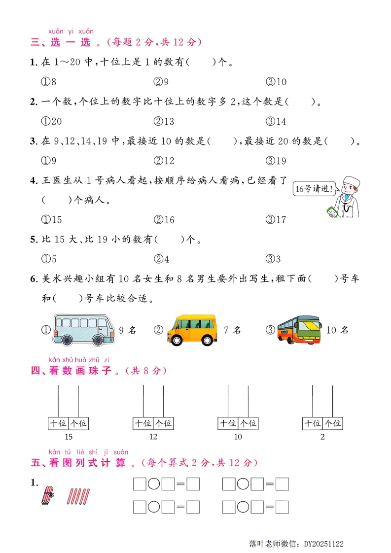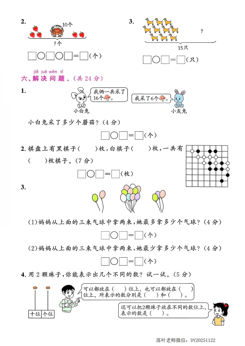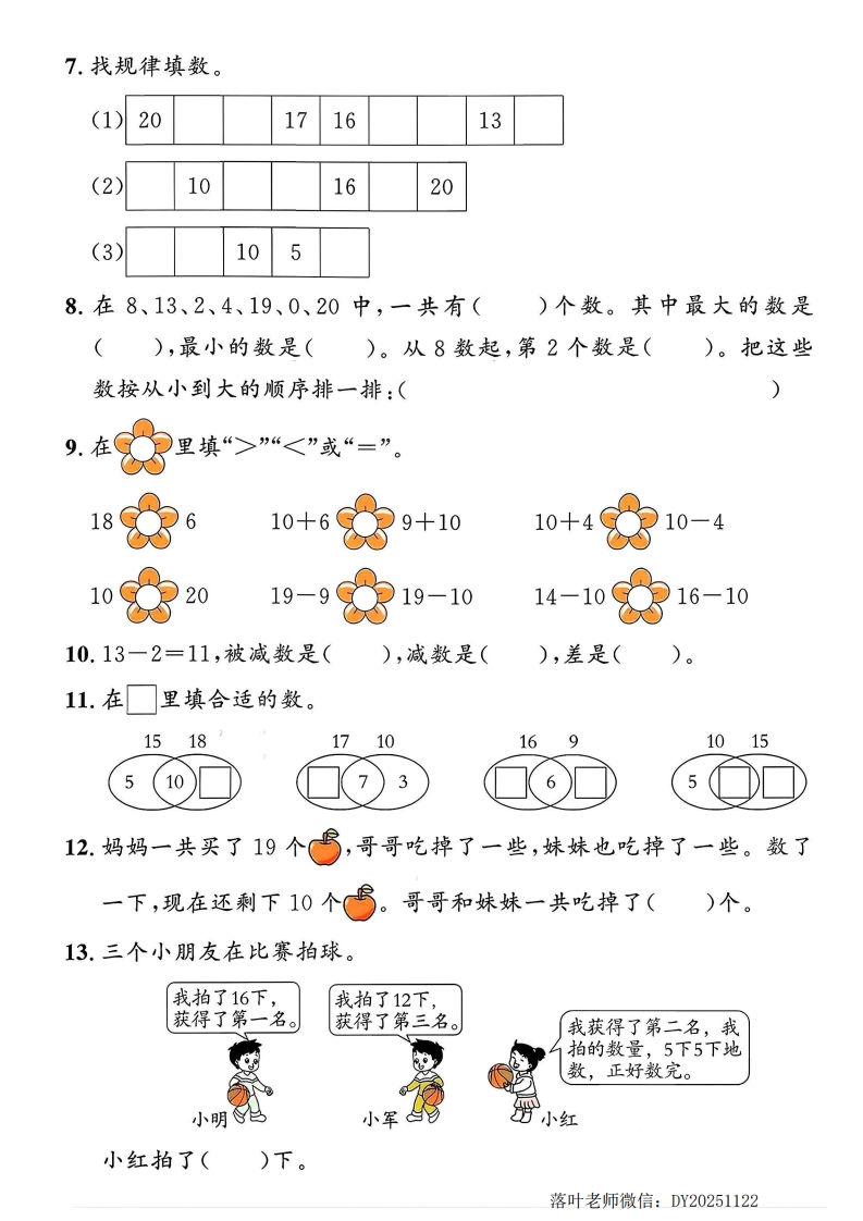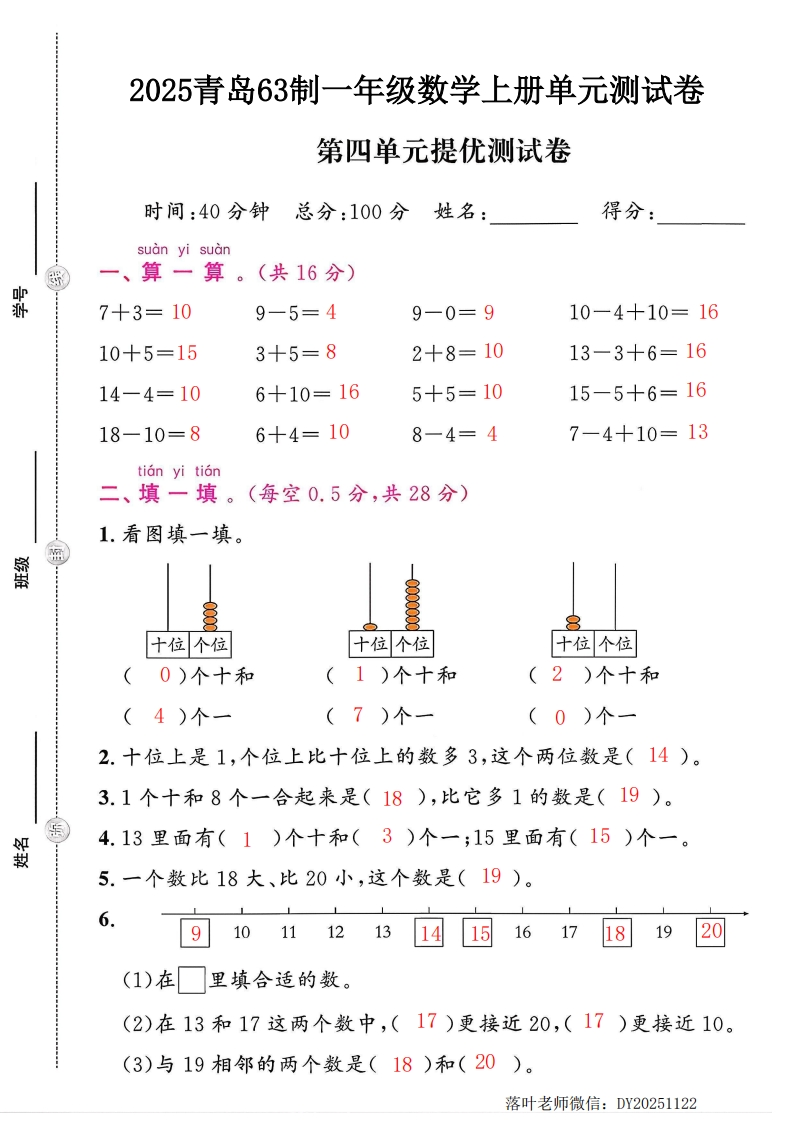 2025青岛63制一年级数学上册单元测试卷第四单元提优测试卷时间:40分钟总分:100分姓名:得分:suan yi suan一、算一算。(共16分)器7十3=9-5=9一0=10-4+10=10+5=3十5=2十8=13-3+6=14-4=6+10=5+5=15-5+6=18-10=6+4=8一4=7-4+10=tian yi tion二、填一填。(每空0.5分,共28分)1.看图填一填。蟹十位个位十位个位十位个位)个十和)个十和)个十和)个一()个一()个一2.十位上是1,个位上比十位上的数多3,这个两位数是()。3.1个十和8个一合起来是(),比它多1的数是()。4.13里面有()个十和()个一;15里面有()个一。製5.一个数比18大、比20小,这个数是()。10111213161719(1)在里填合适的数。(2)在13和17这两个数中,()更接近20,()更接近10。(3)与19相邻的两个数是()和()。落叶老师微信:DY20251122