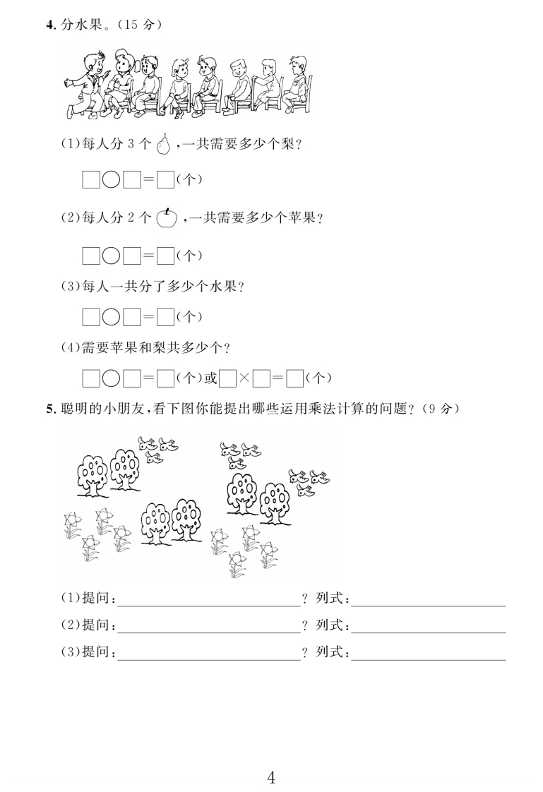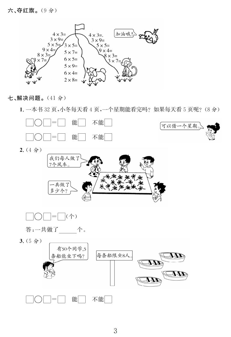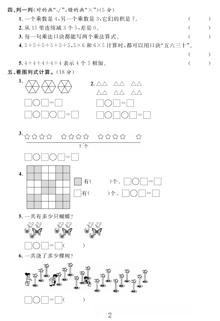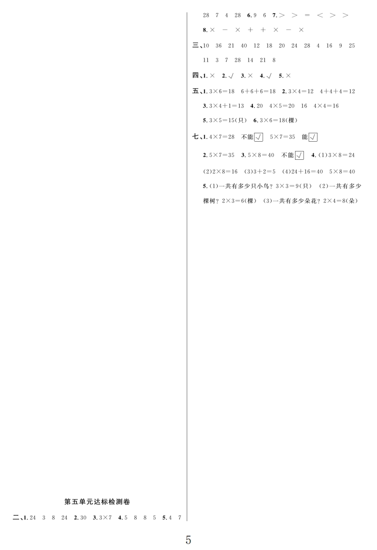 2025年数学二年级上册第五单元测试卷第五单元测试卷检测时间:60分钟满分:100分+5分题号三四五六七总分得分一、卷面书写。(5分)请同学们在答题时认真书写,做到规范、端正、美观,让你的试卷拥有一张清秀、漂亮的面孔!二、填一填。(17分)1.3×8=(),读作()乘()等于(2.一个乘数是5,另一个乘数是6,积是()。3.7+7+7=()X()4.()×()和()X()都是用口决“五八四十”求积。5.从4、6、7、28四个数中选出三个数写出两道乘法算式。()×()=()()×()=(6.5×()=454×()=247.在○里填上“>”“<”或“=”。4×4○154×2○3×23+3○3×27×5○405+1○5×115○3+58.在○里填上“十”“一”“X”5○4=208○2=647=285=74○2=63○3=930●15=1558=40三、算一算。(10分)5×2=4X9=7×3=5×8=4×3=3×6=5×4=4X6=7X4=2X2=4×4=3X3=5×5=4+7=6一3=1X7=7X5-7=2×5+4=6×3+3=4X3一4=1