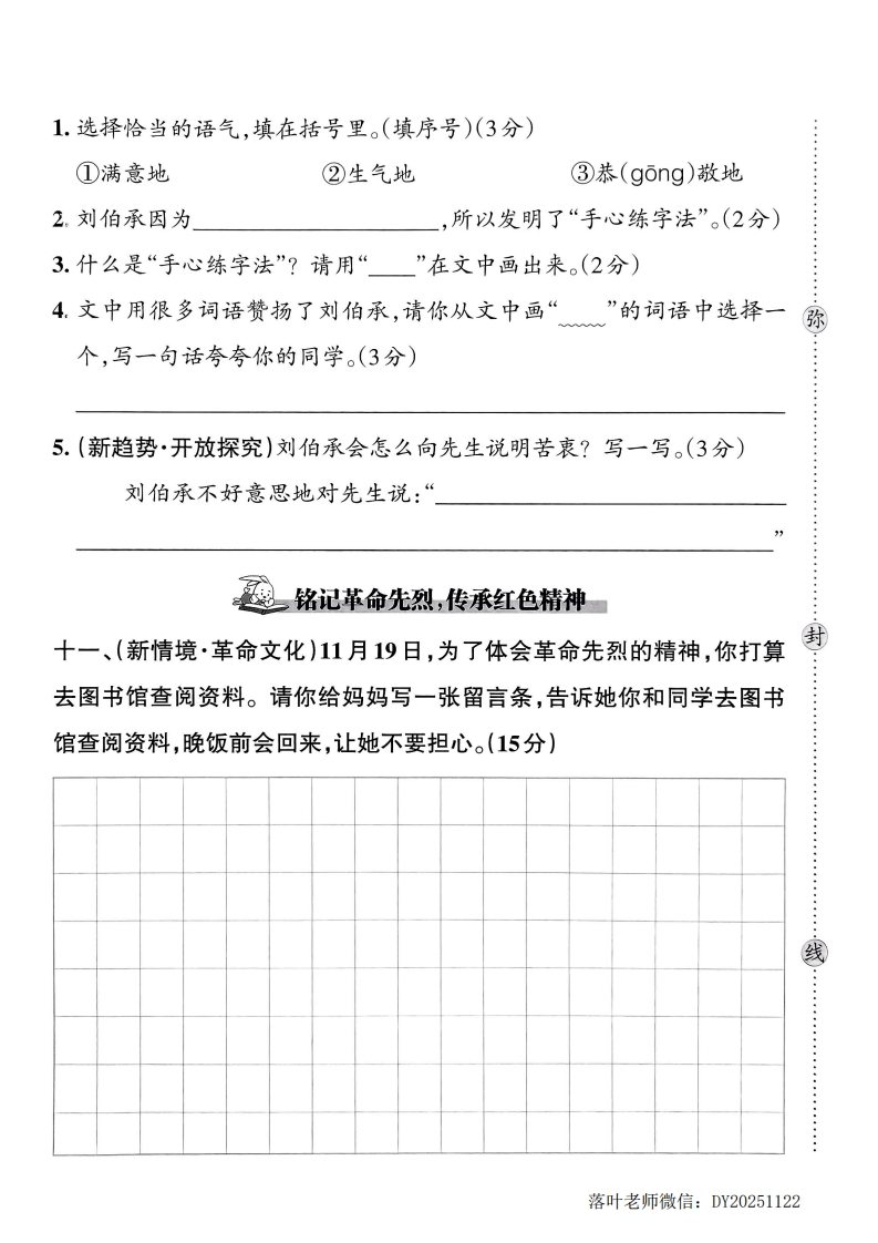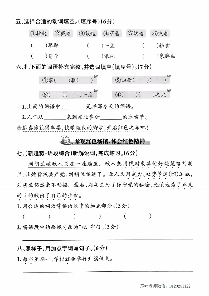 2025-2026学年二年级上册语文情境素养卷第六单元情境素养卷时间:60分钟满分:100分红色之旅即将开始,快来参与挑战,感受红色文化吧!弥弥兑换旅行车票,开启红色之旅一、用“V”为加点字选择正确的读音。(8分)1.一觉(jiàojué)醒来,我发觉(jiàojue)外面下雨了。2.弟弟弄乱了刚铺(pUpù)好的床铺(p0pù)。3.今天的饭菜很丰盛(cheng sheng),我盛(chengsheng)了一大碗。4.看着天上的星斗(dǒudòu),我重新燃起斗(dǒudòu)志。毁二、拼一拼,写一写。(14分)封nian gingzhanshicunzi1.他带领的们来到里oshengxiaoxitongzhifei chang2.的传来,们高兴。带三、加偏旁,变新字,再组词。(8分)皮线)见)四、(教材核心题)连一连。(9分)慕布刀峰吵饭墓名蜜蜂炒写豁幕地山锋抄架落叶老师微信:DY20251122