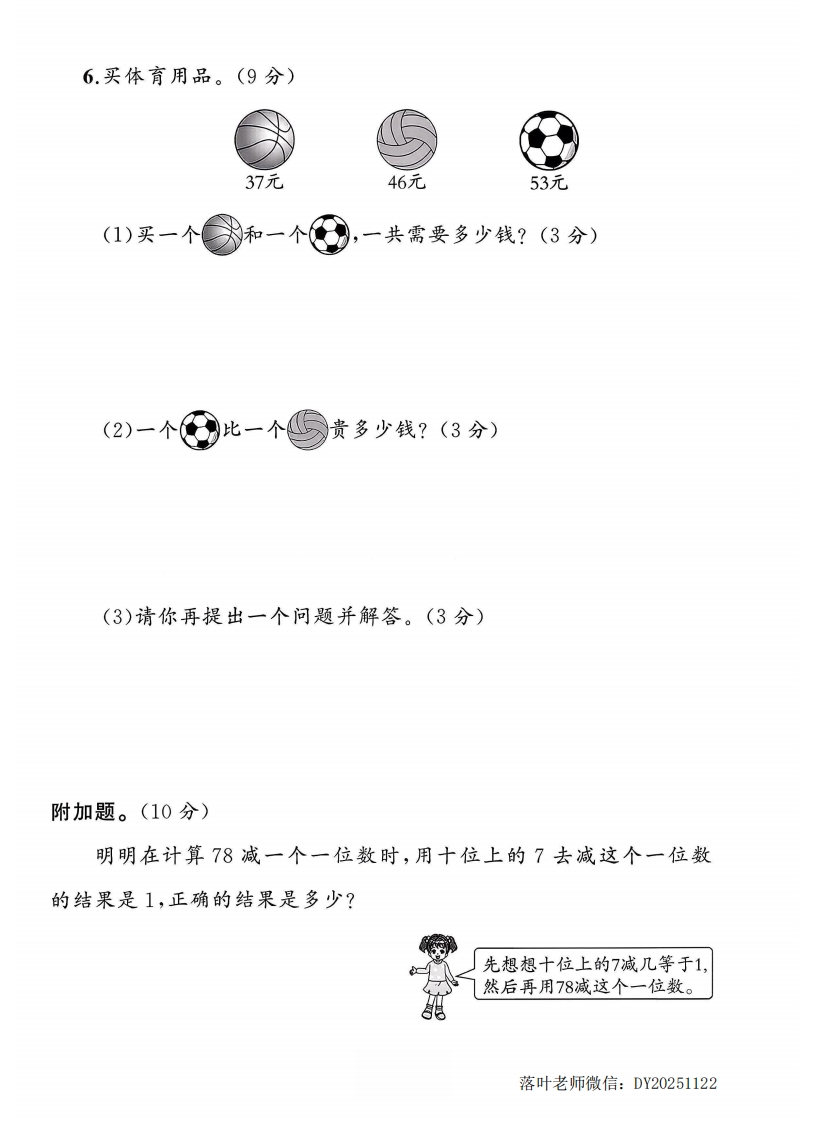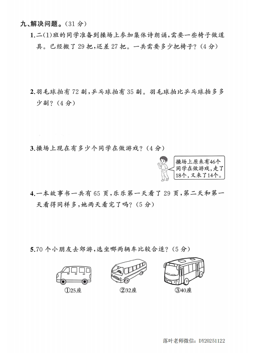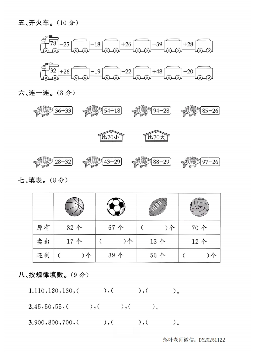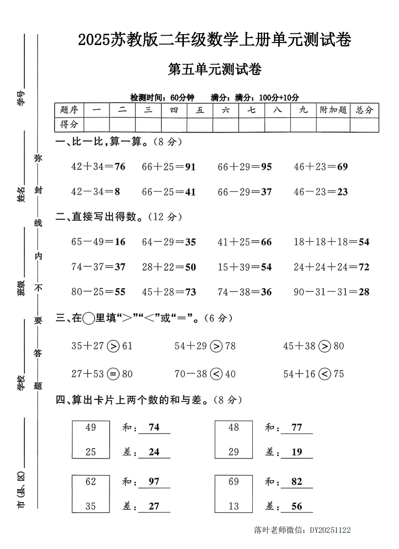 2025苏教版二年级数学上册单元测试卷第五单元测试卷露检测时间:60分钟满分:满分:100分+10分题序三四五六七九附加题总分得分一、比一比,算一算。(8分)弥42+34=66+25=66+29=46+23=毁封42-34=66-25=66-29=46-23=线二、直接写出得数。(12分)65-49=64-29=41+25=18+18+18=内74-37=28+22=15+39=24+24+24=童不80-25=45+28=74一38=90-31-31=要三、在○里填“>”“<”或“=”。(6分)35+276154+29○7845+3880答27+538070-38○4054+16○75靠题四、算出卡片上两个数的和与差。(8分)49和:48和:25差:29差:62和:69和:35差:13差:落叶老师微信:DY20251122