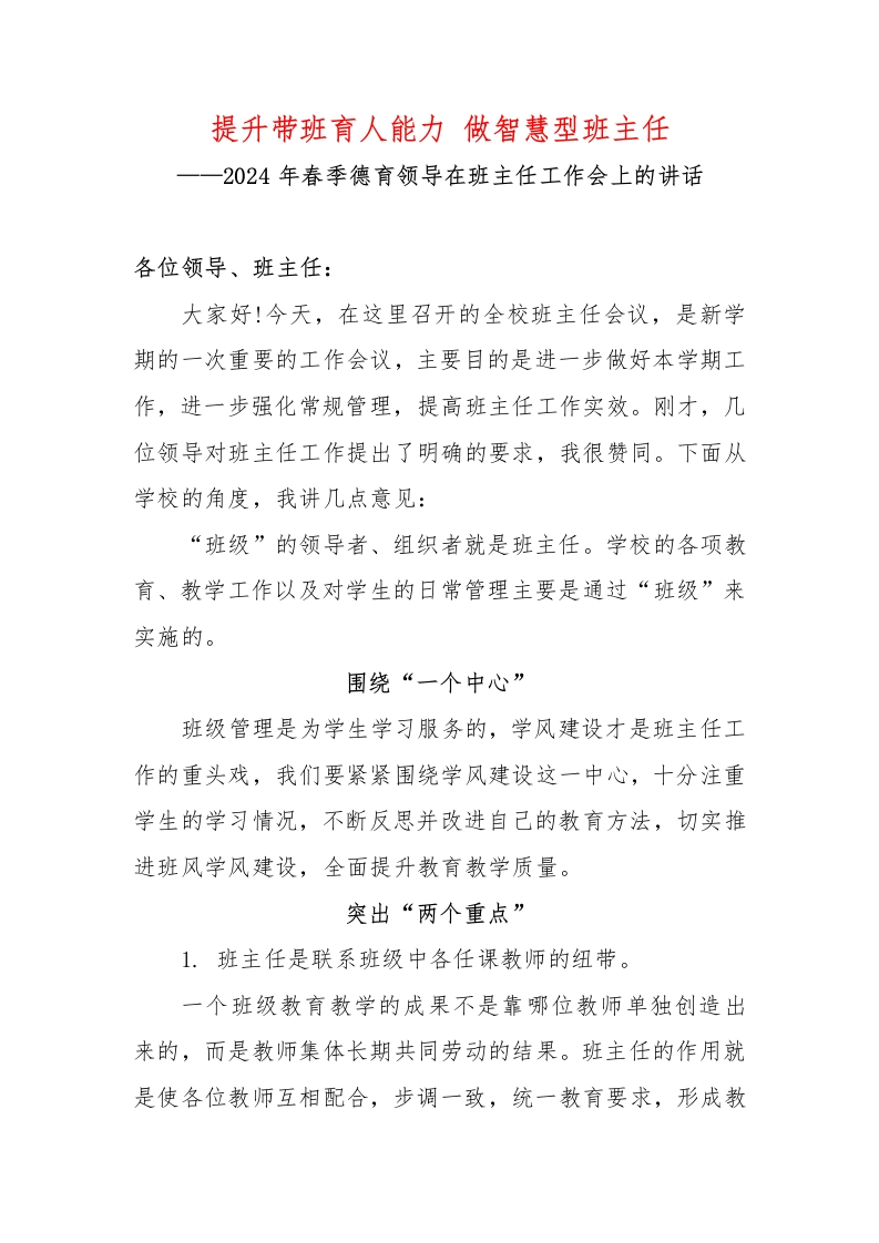 提升带班育人能力做智慧型班主任2024年春季德育领导在班主任工作会上的讲话各位领导、班主任:大家好!今天,在这里召开的全校班主任会议,是新学期的一次重要的工作会议,主要目的是进一步做好本学期工作,进一步强化常规管理,提高班主任工作实效。刚才,几位领导对班主任工作提出了明确的要求,我很赞同。下面从学校的角度,我讲几点意见:“班级”的领导者、组织者就是班主任。学校的各项教育、教学工作以及对学生的日常管理主要是通过“班级”来实施的。围绕“一个中心”班级管理是为学生学习服务的,学风建设才是班主任工作的重头戏,我们要紧紧围绕学风建设这一中心,十分注重学生的学习情况,不断反思并改进自己的教育方法,切实推进班风学风建设,全面提升教育教学质量。突出“两个重点”1.班主任是联系班级中各任课教师的纽带。一个班级教育教学的成果不是靠哪位教师单独创造出来的,而是教师集体长期共同劳动的结果。班主任的作用就是使各位教师互相配合,步调一致,统一教育要求,形成教