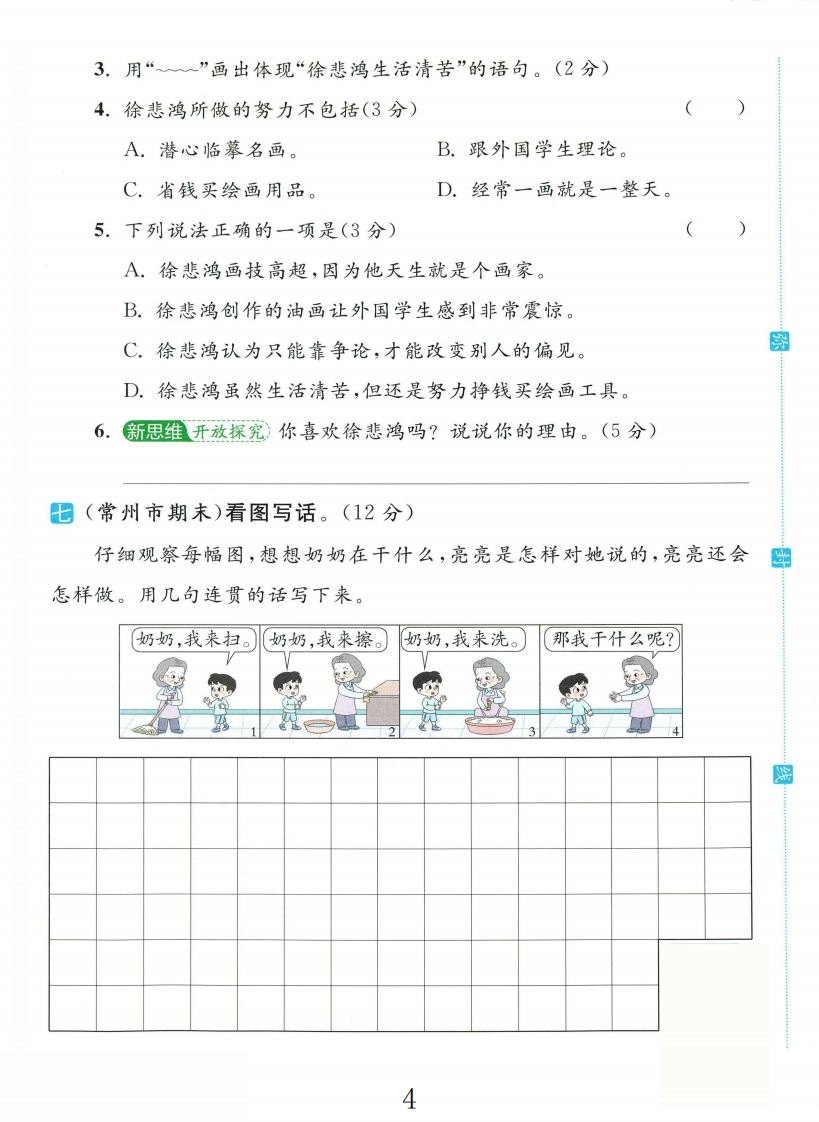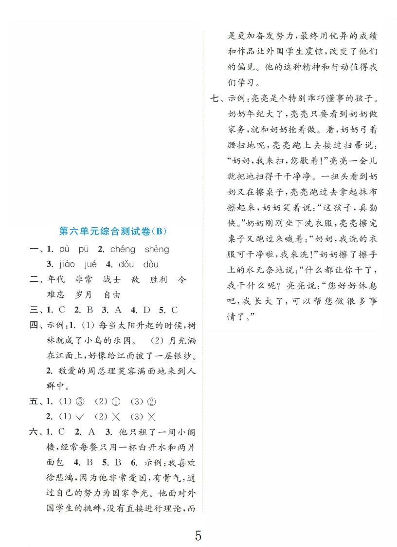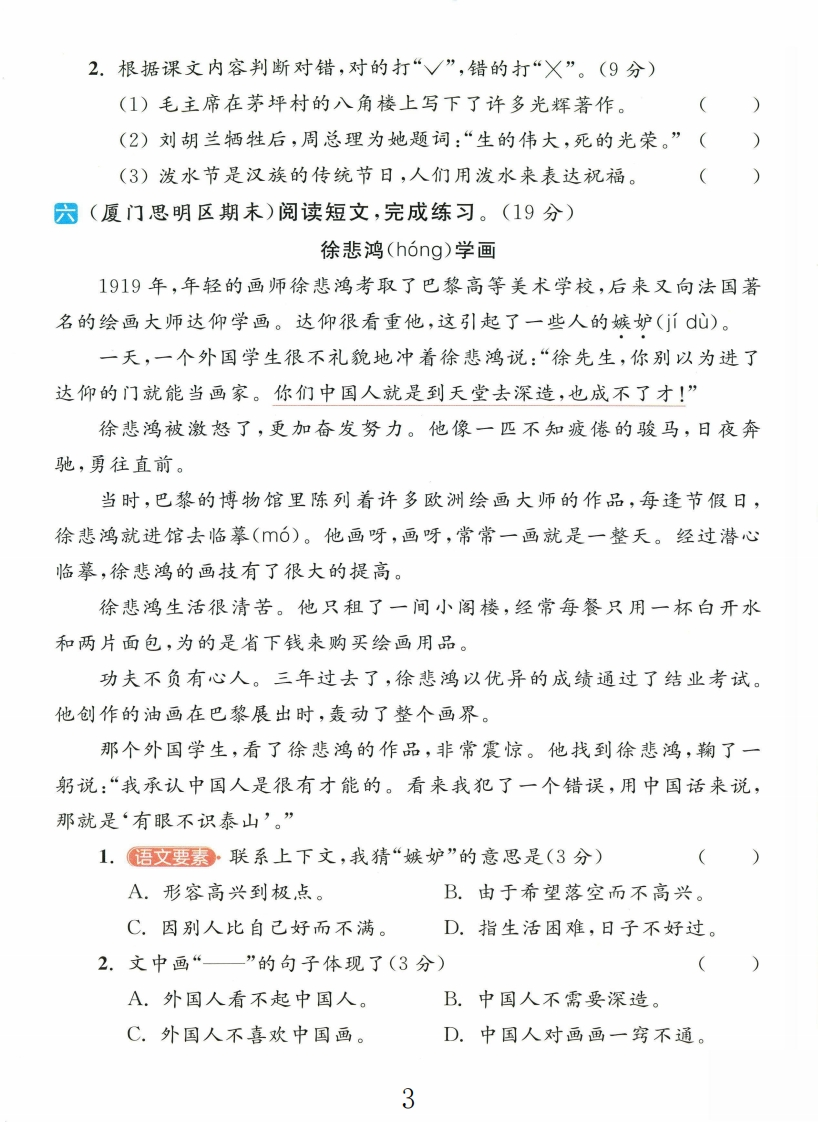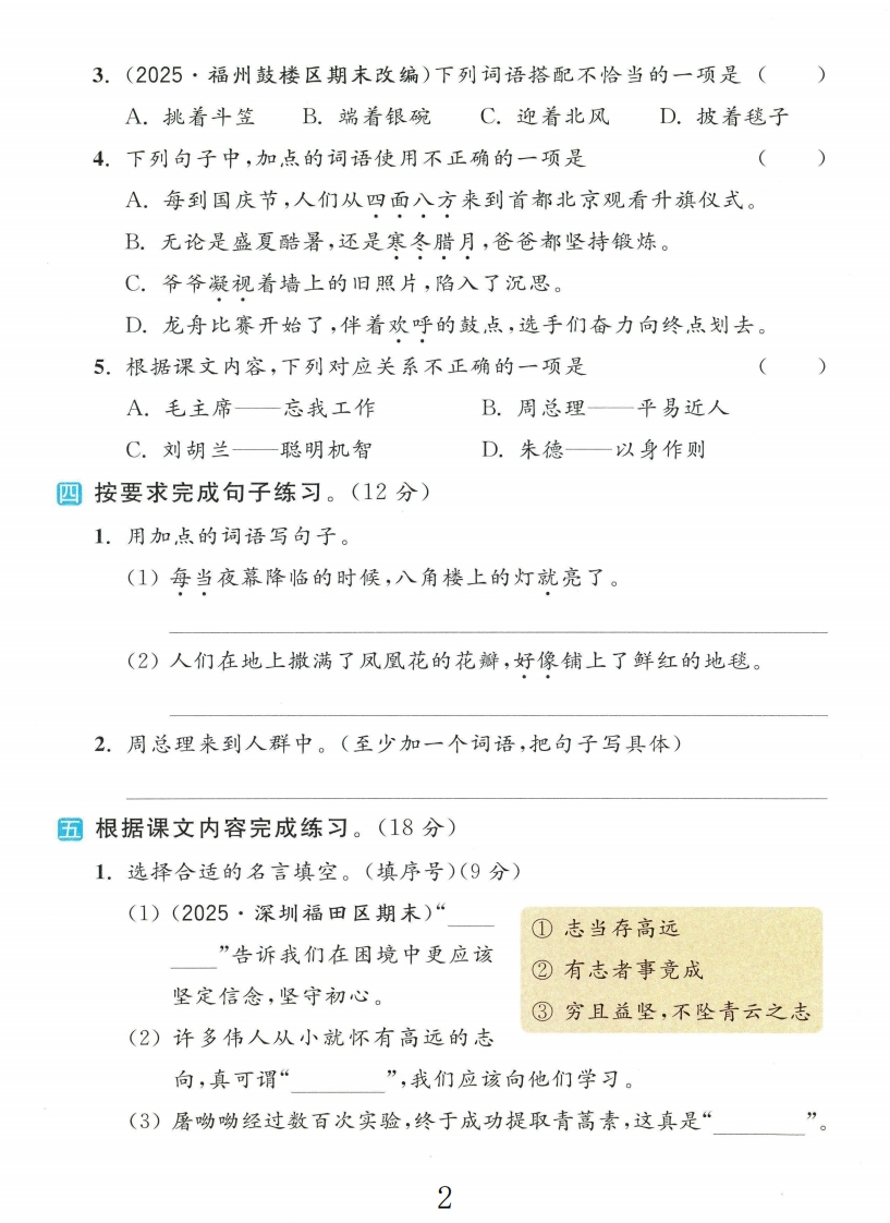 2025二年级语文上册第六单元测试卷第六单元测试卷时间:60分钟满分:100分靴(2025·徐州新沂市期末)给加点字选择正确的读音,打“√”。(8分)1.他在床铺(pUpù)上铺(pūpù)了一层厚毛毯。2.盛(chéng sheng)满水的盆里盛(chéng sheng)开着睡莲。3.人在睡觉(juéjiào)时,一般察觉(juéjiào)不到什么动静。4.孙悟空翻上筋斗(dǒudòu)云,与妖魔展开搏斗(dǒudòu)。亮点原创读句子,根据拼音写字词。(16分)niandaifeichang站在国旗下,校长对我们说:“遥想革命条件虽然zhànshidi艰苦,但们用钢铁般的意志,在首长的带领下,坚持与、抗黛shenglingnan wang争到底,最终取得了革命的这是一段多么suiyueziyou阁的啊!同学们一定要珍惜今天幸福的生活。”选择正确的答案。(填序号)(15分)1.“读一本好书,如品一杯茗茶。”我猜测句中“茗”的读音与()相近。A.茶B.花C.名D.口2.依次填入“争、爆、摘”中的字正确的一项是(A.炒吵抄B.吵妙抄C.抄炒吵D.吵抄炒1