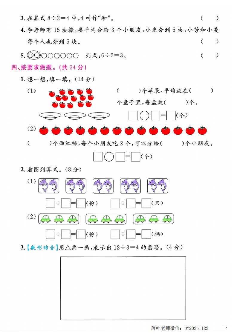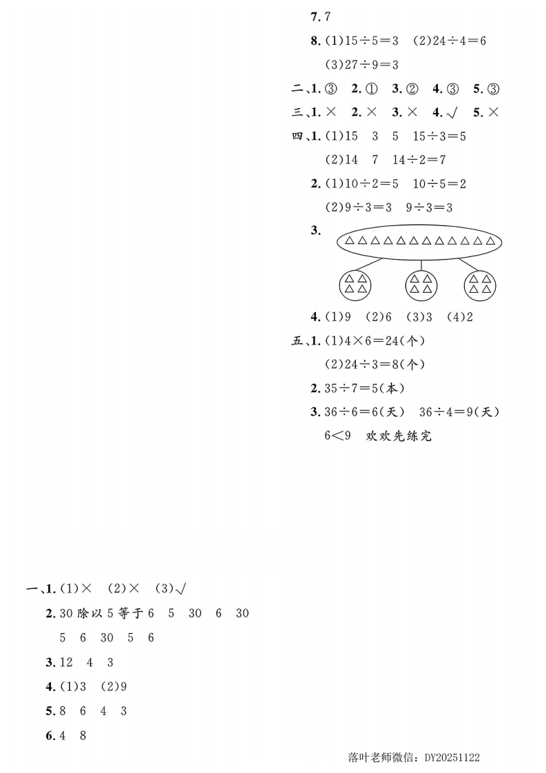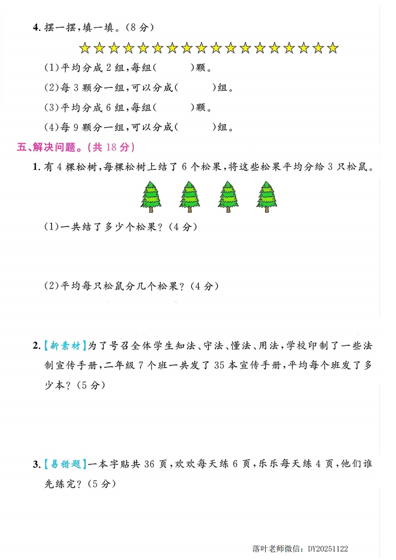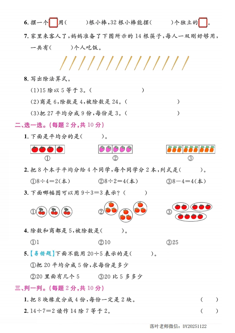 2025青岛63制二年级数学上册单元测试卷第四单元测试卷时间:40分钟总分:100分书写等级:质量等级:一、填一填。(每空1分,共28分】1.把6个苹果平均分给3个小朋友,在对的分法下面画孙“/”,不对的分法下面画“X”。(3)2.30÷5=6这个算式读作(),除数是(),被除数是(),商是(),表示把()平均分成()份,每份是(),也可以表示一共有()个,每()个分成一份,量可以分成()份。3.有()块糖,每()块分成一份,可以分成()份。4.考卷考考考考考考考卷考考考考考考考娄(1)每6枝插在一个花瓶里,可以插()瓶。(2)平均插在2个瓶子里,每个瓶子插()枝。毁5.【一题多解】分一分,填一填。每人要分得同样多。为为为为为为为为为为为光为为为为为为为为贵为为人数3468每人分得的个数落叶老师微信:DY20251122