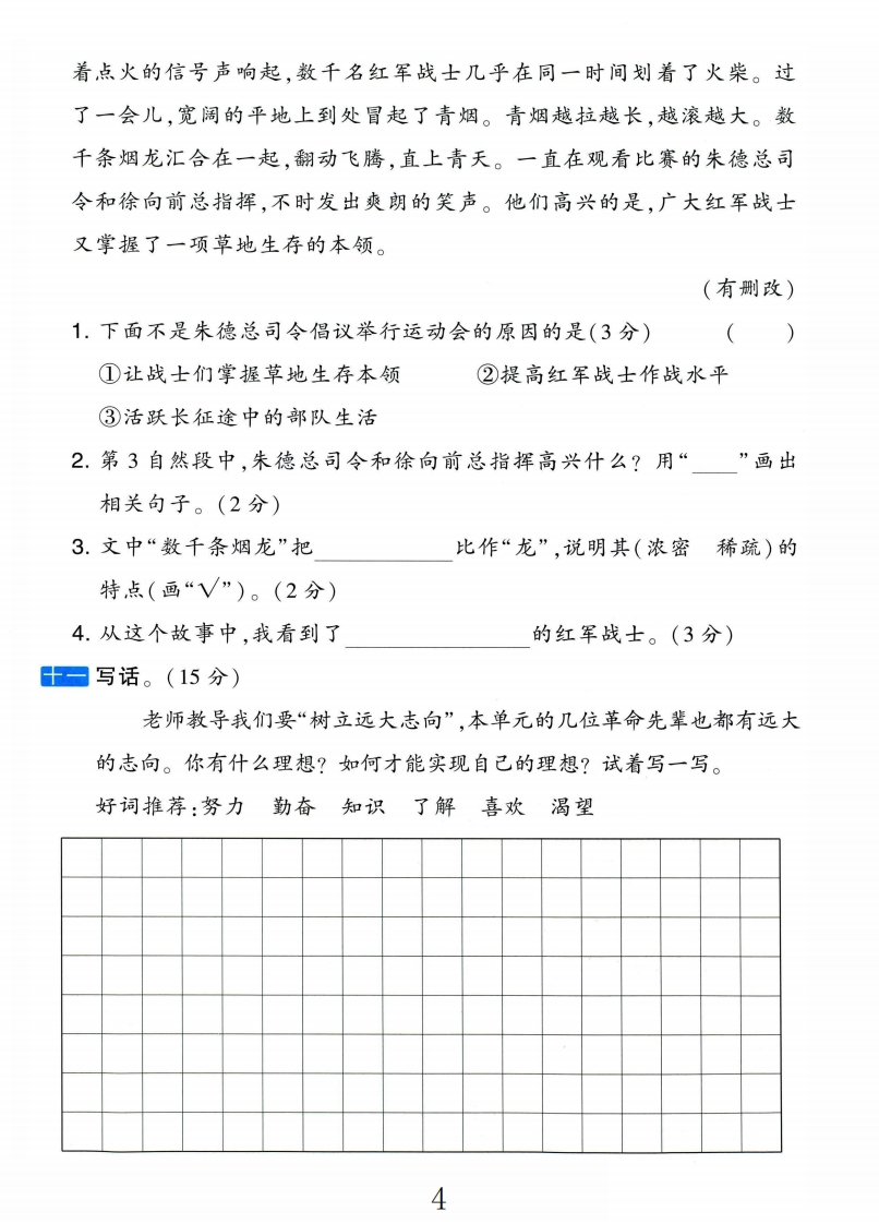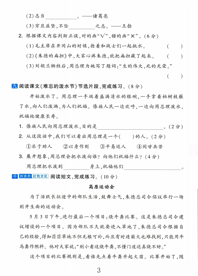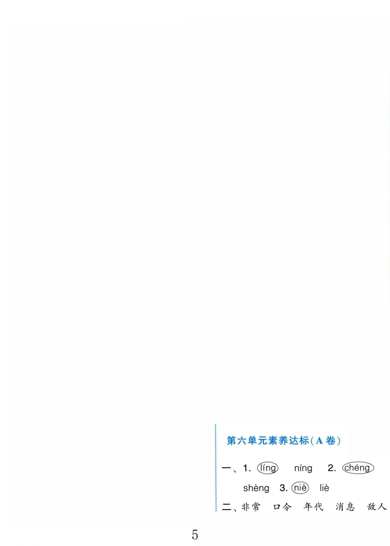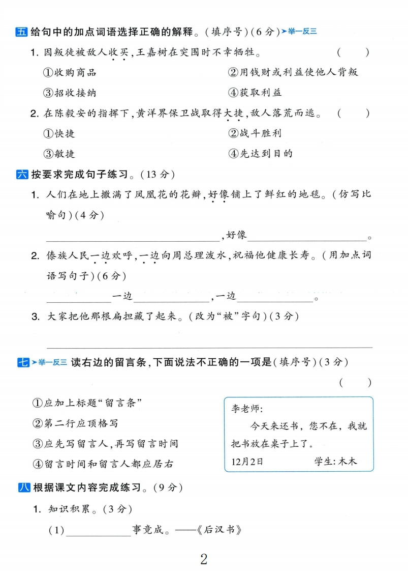2025人教版二年级语文上册第六单元测试卷第六单元测试卷时间:60分钟满分:100分用“圈出每小题中的错误读音,并改正在后面的横线上。(6分)”1.凝视(ling)光辉(hui)心疼(teng)密2.爆发(bào)盛开(chng)宁静(ning)3.长寿(shu)山冈(gang)壮烈(niè)毁封日读拼音,写词语。(12分)》fei changkǒuingnian daixiaoxi线内direnryoucun mindào0童不fanduitongzhikùchuan dai要答目照样子,加部件,变新字,再组词,最后说说你的发现。(10分)把(把手)题巴)包))我发现:形声字中声旁表示,形旁表示,(①读音②意思)(填序号)》四选词填空。(填序号)(8分)①戴着②挑着③搬着④穿着☒排练红色舞台剧时,场务()道具走上舞台,小演员们()斗e笠、()草鞋、()粮食在一旁等待上场。1
