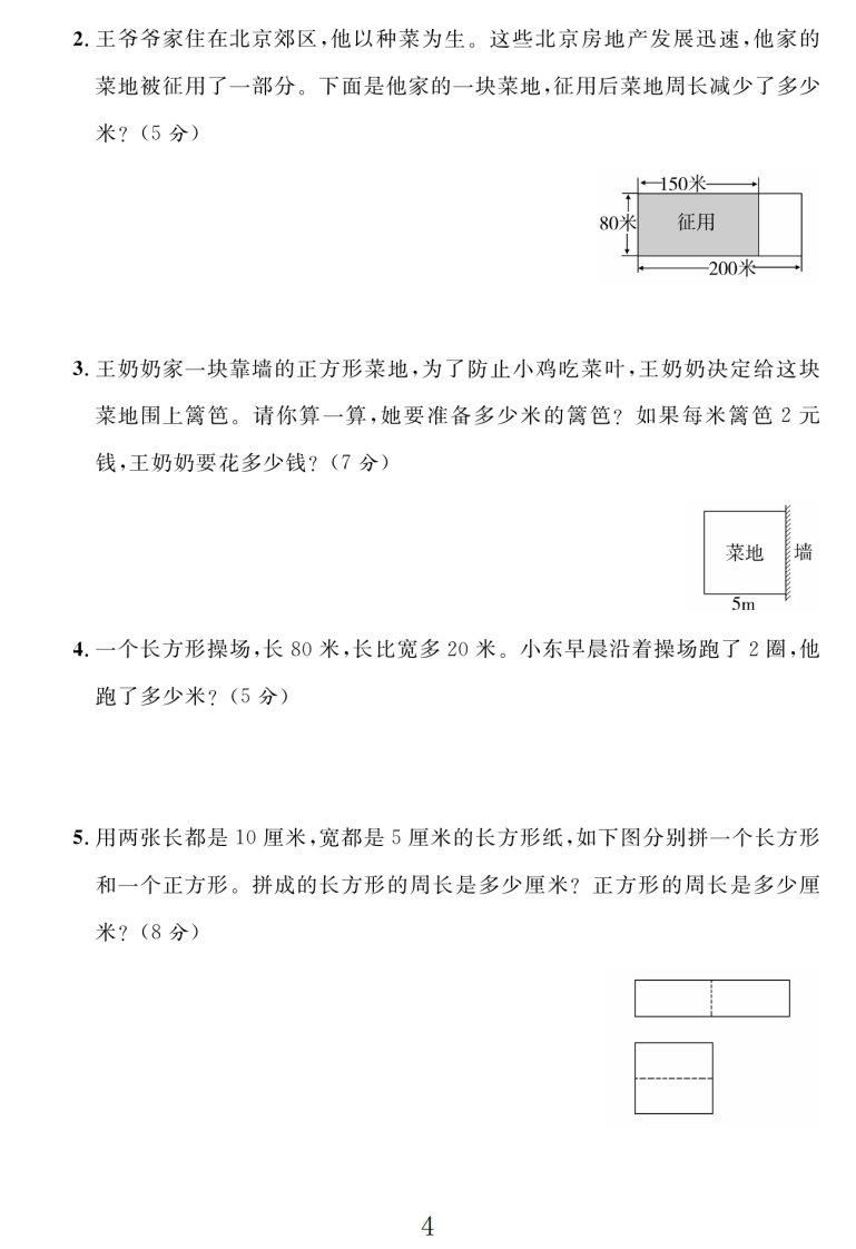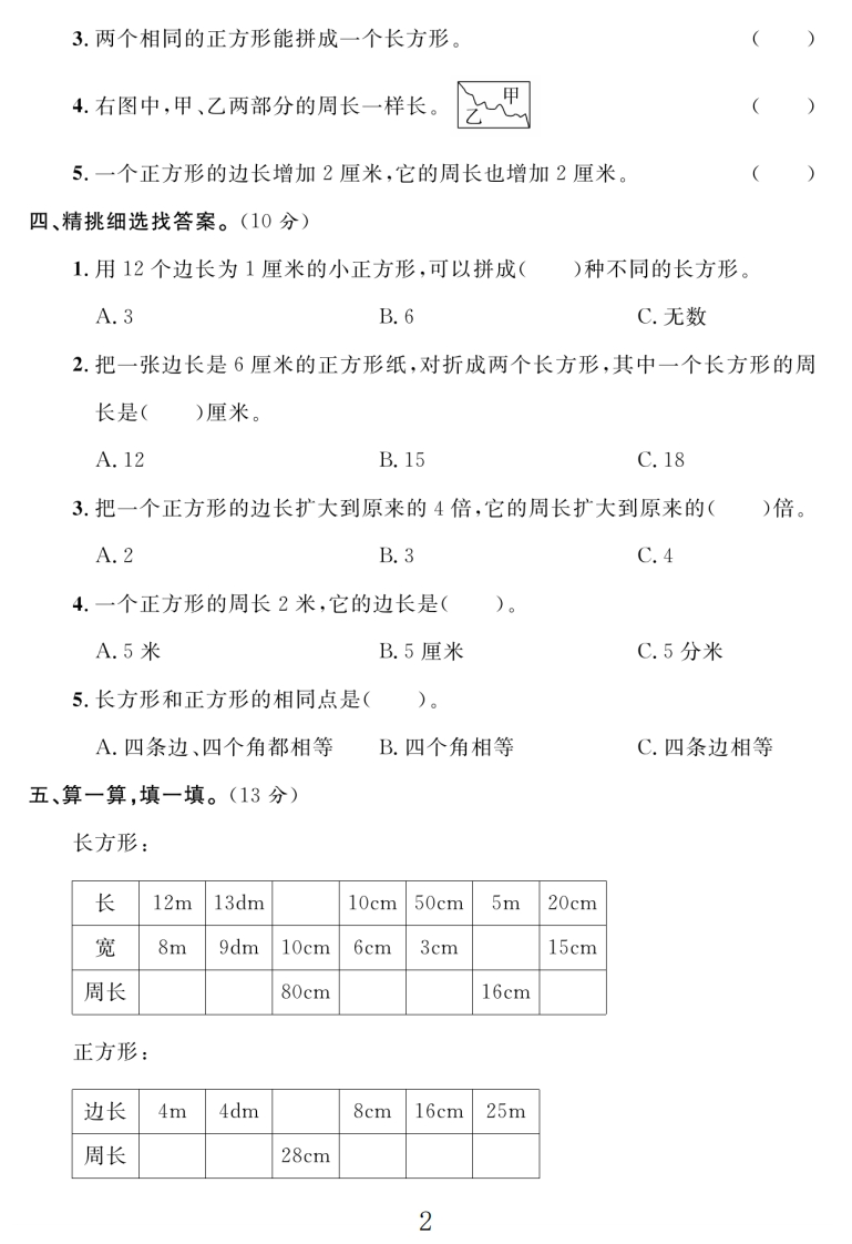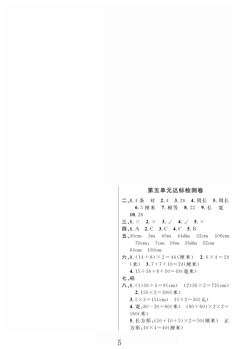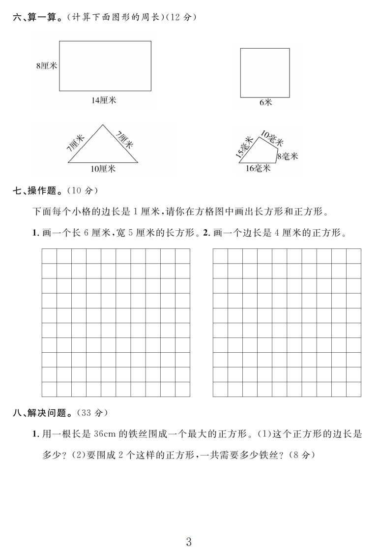 2025年数学三年级上册第五单元测试卷第五单元测试卷检测时间:60分钟满分:100分+5分题号二三四五六七八总分得分一、卷面书写。(5分)请同学们在答题时认真书写,做到规范、端正、美观,让你的试卷拥有一张清秀、漂亮的面孔!二、填一填。(12分)1.正方形的()边都是相等的,长方形的()边相等。2.一条绳子长8米,正好绕桌子2周,这张桌子的周长是()米。3.一个长方形的长是9米,宽是5米,周长是()米。4.围成一个平面图形的所有边长的总和叫做这个图形的()。5.明明用铁丝围了一个长方形,所用铁丝的长度就是这个长方形的()。6.用一条长20厘米的毛线围成一个大的正方形,它的边长是(7.用长度相同的花边围成不同的形状,各图形的周长一定(8.一个三角形三条边的长度分别是7厘米、6厘米、9厘米,这个三角形的周长是()厘米。9.要计算长方形的周长,一般要知道它的()和(10.一个长方形的长和宽的和是14厘米,它的周长是()厘米。三、细心判断。(对的画“/”,错的画“X”)(10分)1.已知长方形的两条边长就可求出它的周长。2.边长不相等的两个正方形,周长有可能相等。1