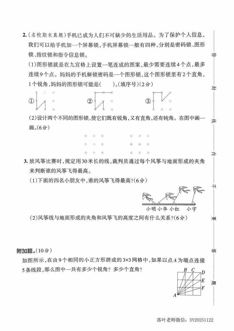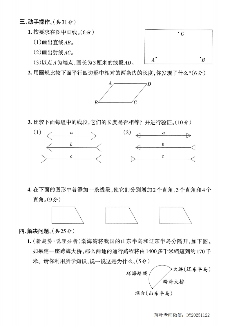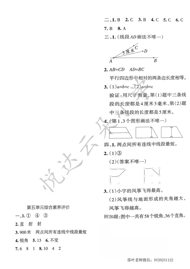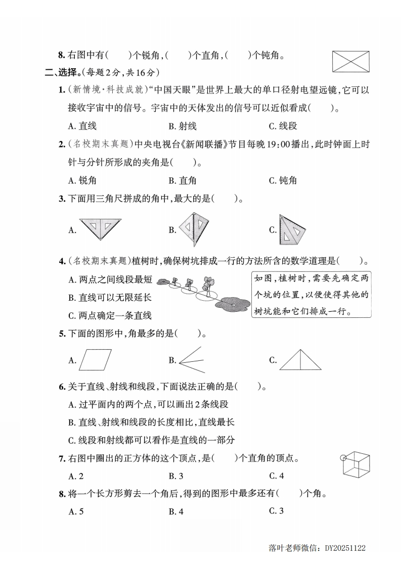 2025-2026学年人教版三年级上册数学综合素养评价第五单元综合素养评价最时间:60分钟满分:100+10分题序三四附加题总分等级n蜘得分一、填空。(第1、2题每空1分,其余每空2分,共28分)1.下图中,()是直线,()是线段,()是射线。(填序号)①②③④⑤2.()线和()线可以无限延伸,角的两条边是()线。3.如图,从小红家到公园有4条路线,长度分别是1000米、900米、950米、1200米。戡路线②的长度是(),理由是()。①②小红家③④公园蜗4.把一张圆形纸按箭头方向连续对折三次后,得到的角是()。(填“锐角”“直角”或“钝角”)第4题图第5题图5.(教材改编)如图,两张8厘米长的纸条部分重叠粘在一起,重叠部分长3厘米,粘在一起后得到的纸条长度是()厘米。韵6.用10倍的放大镜观察一个角,这个角()。(填“变大”“变小”或“不变”)7.右图中,有()条线段,()条射线,()条直线。落叶老师微信:DY20251122