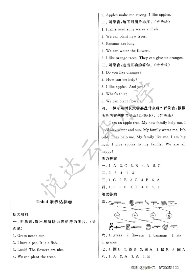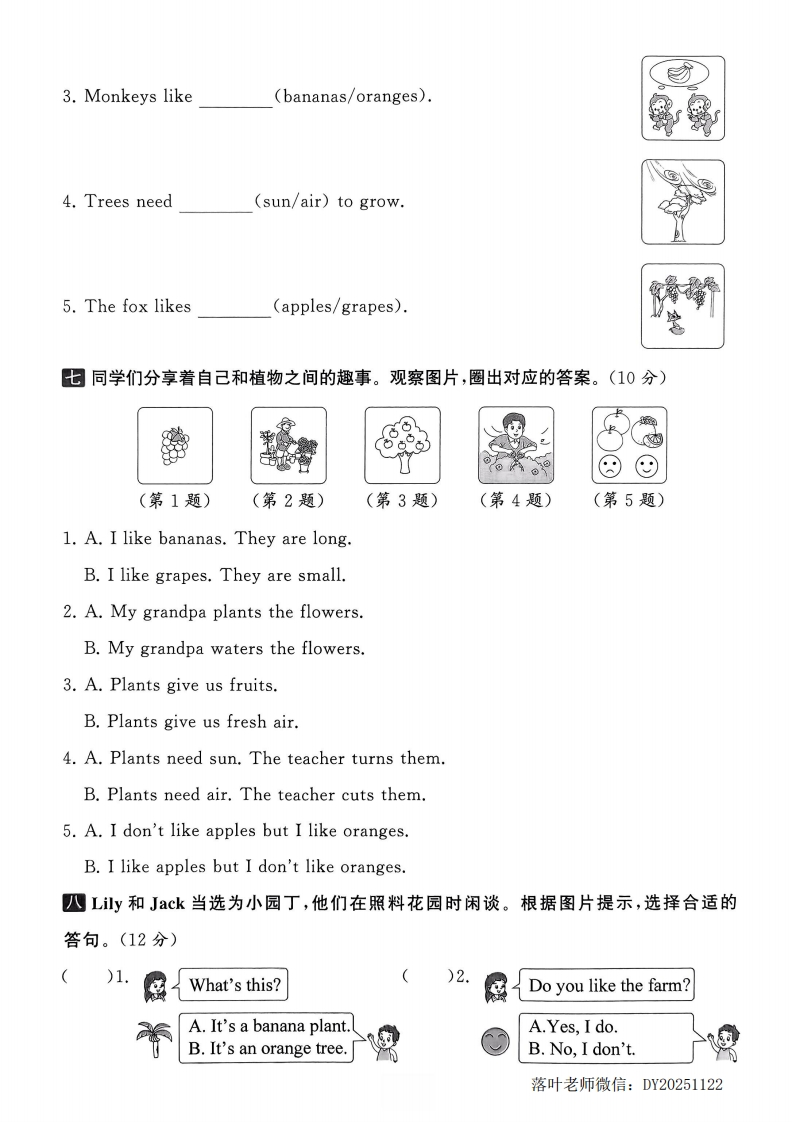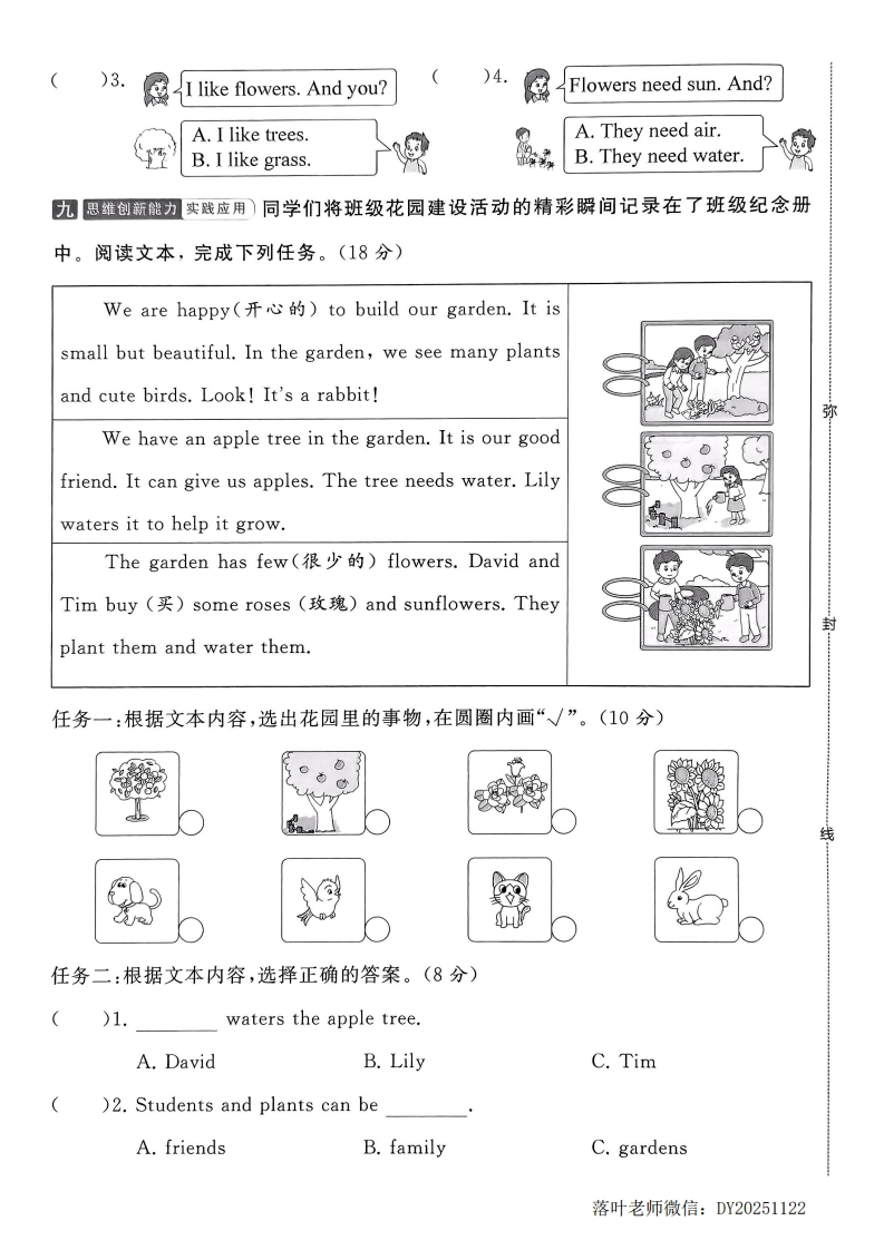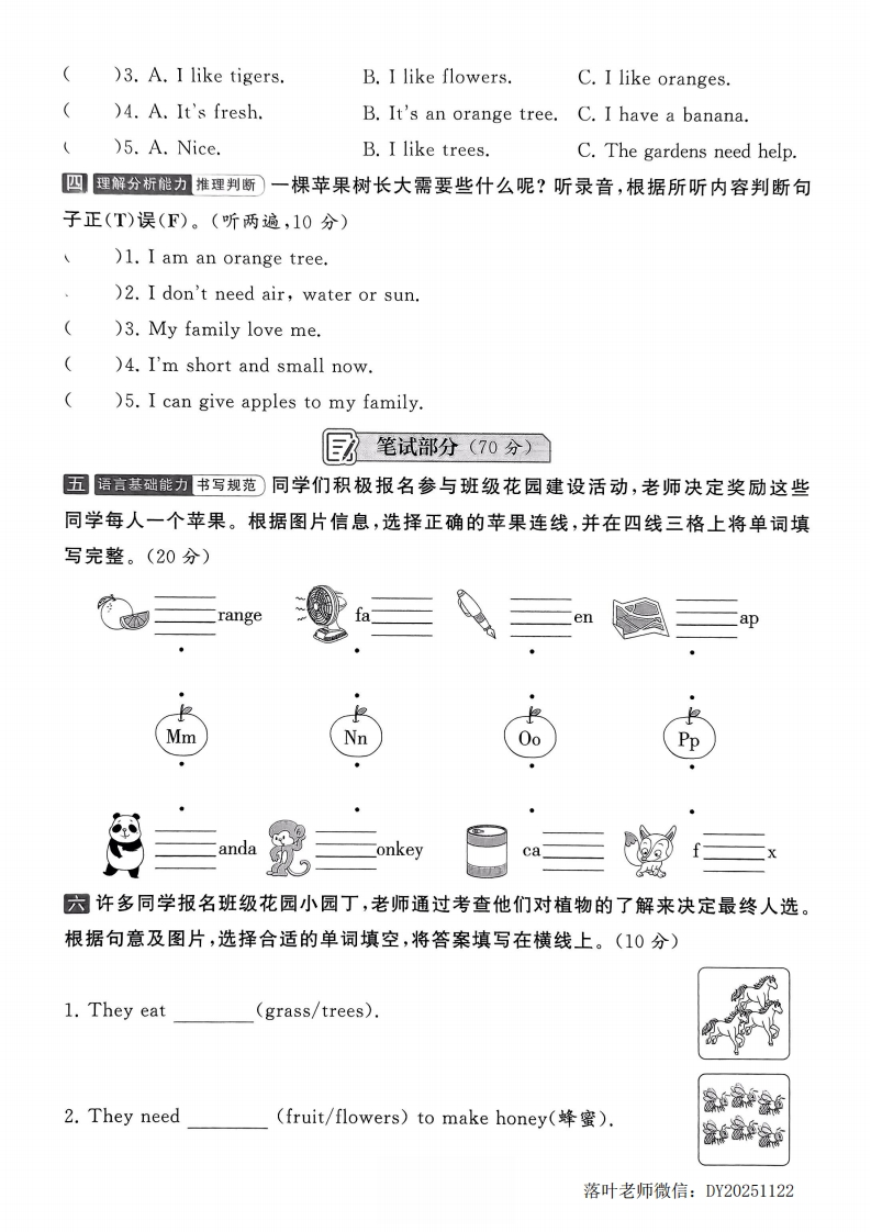 2025-2026学年人教版三年级上册英语素养达标卷Unit4素养达标卷时间:60分钟满分:100分“阳春三月初,繁花满枝迎。”在这温暖的春季,学校号召同学们加入班级花园的建设中,为$校园添一抹春色。通过亲自动手照料花草树木,孩子们对植物愈发了解。听力部分(30分)理解分标能力信息提取)听录音,选出与所听内容相符的图片。(听两遍,5分))1.A.BC苏)2.A.B救()3.AB.封()4.A.B.C.魅风蓝)5.A.B.C.日听录音,给下列图片排序。(听两遍,5分)南目听录音,选出正确的答句。(听两遍,10分))1.A.Yes,I am.B.No,it isn't.C.Yes,I do.)2.A.We can cut down trees.B.We can water grass.C.We need plants.落叶老师微信:DY20251122