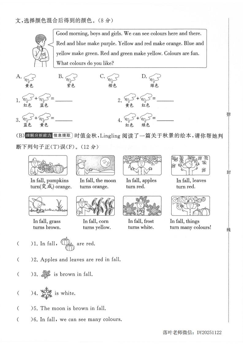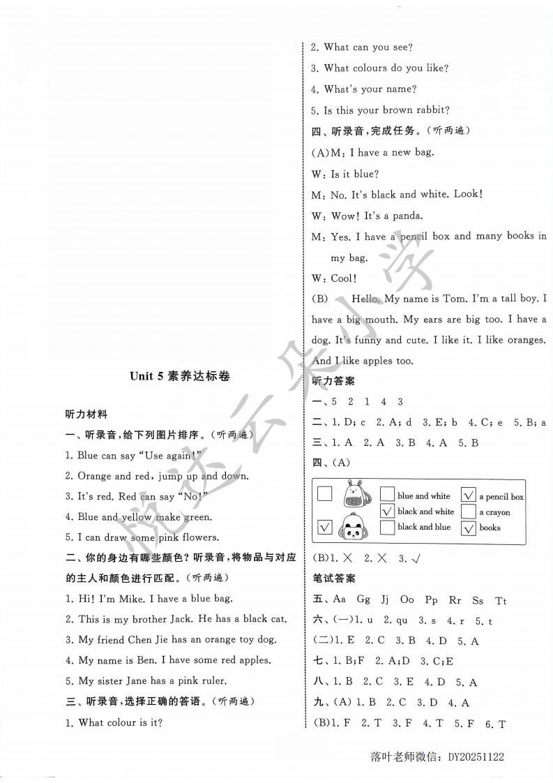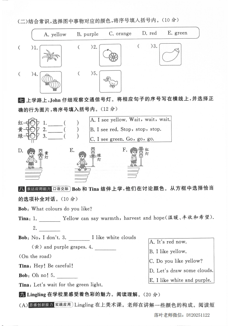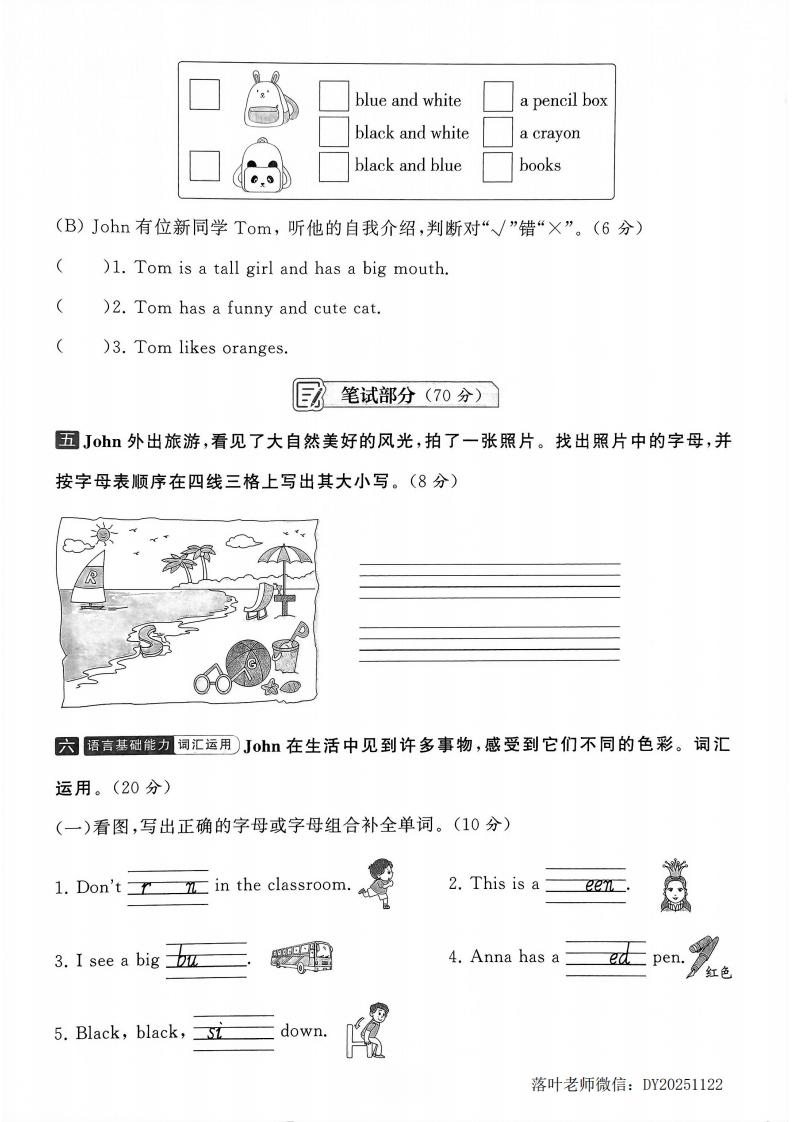 2025-2026学年人教版三年级上册英语素养达标卷Unit5素养达标卷时间:60分钟满分:100分世间万物都有独属于自己的颜色,我们丰富的生活也多姿多彩,何不一起绘制自己独特生活的调色盘呢?体验生活趣事,感受色彩魅力。肿听力部分(30分)□听录音,给下列图片排序。(听两遍,5分)粉色绿色红色班弥色日你的身边有哪些颜色?听录音,将物品与对应的主人和颜色进行匹配。(听两遍,毁10分)A.JackB.JaneC.Ben封D.MikeE.Chen Jiea.pinkb.orangec.blued.blacke.red3.童5.目听录音,选择正确的答语。(听两遍,5分)()1.A.It's pink.B.It's OK.)2.A.I can see a blue bird.B.I can water the flowers.)3.A.I like red apples.B.I like red and blue.()4.A.My name is John.B.Nice to meet you.)5.A.Yes,I like brown.B.Yes,it is.四听录音,完成任务。(听两遍,10分)(A)John换了新书包,听对话,在方框中勾出书包的信息。(4分)落叶老师微信:DY20251122