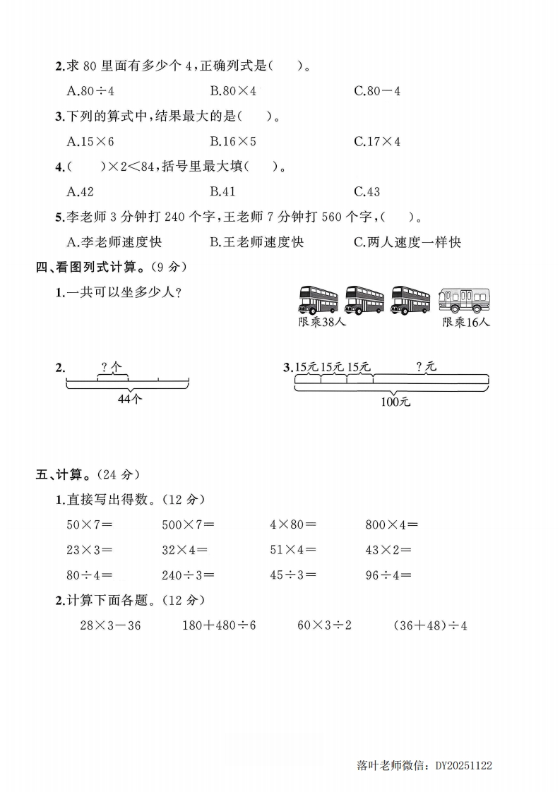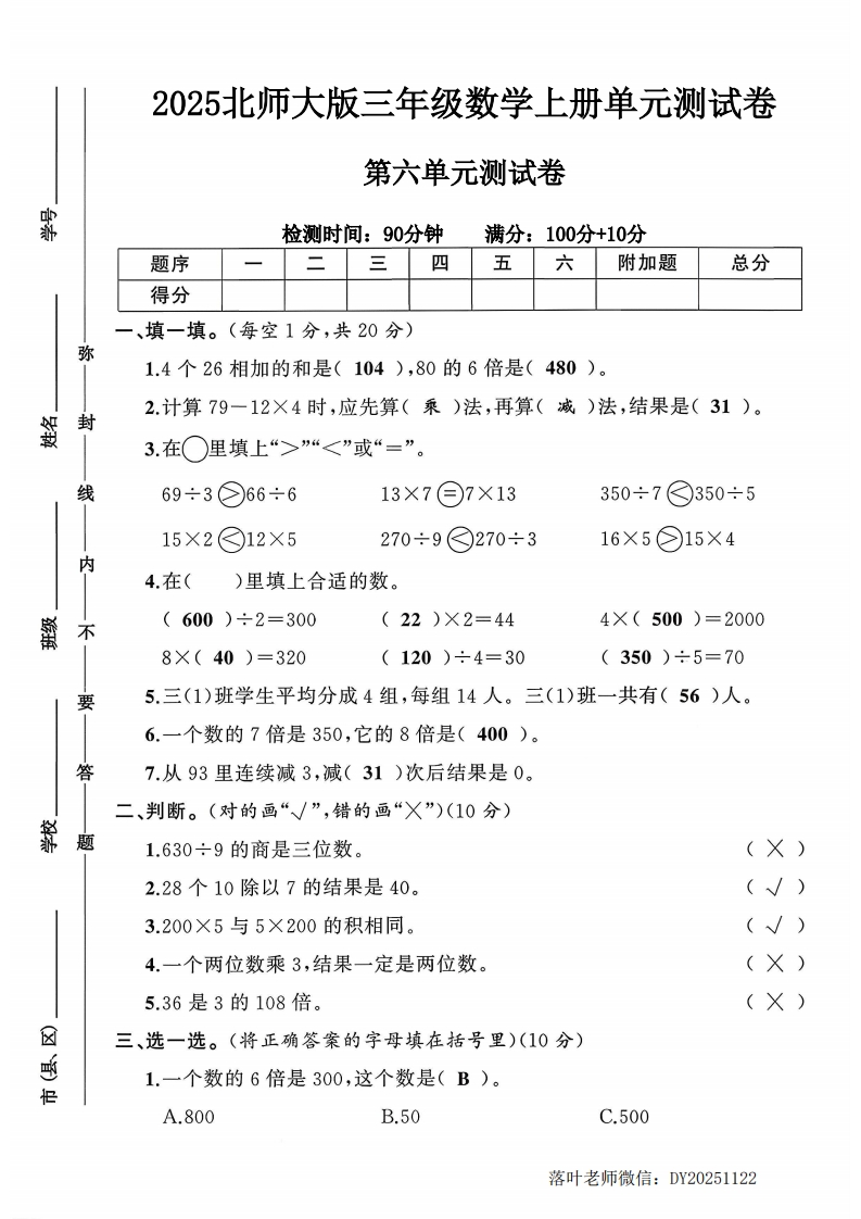 2025北师大版三年级数学上册单元测试卷第六单元测试卷检测时间:90分钟满分:100分+10分题序二三四五六附加题总分得分一、填一填。(每空1分,共20分)弥1.4个26相加的和是(),80的6倍是()。2.计算79-12×4时,应先算()法,再算()法,结果是()。毁封3.在○里填上“>”“<”或“=”。线69÷3○66÷613×7○7×13350÷7○350÷515×2○12×5270÷9○270÷316×5○15×4内4.在()里填上合适的数。藿)÷2=300()×2=444×()=2000不8×()=320)÷4=30()÷5=70要5.三(1)班学生平均分成4组,每组14人。三(1)班一共有()人。6.一个数的7倍是350,它的8倍是()。答7.从93里连续减3,减()次后结果是0。二、判断。(对的画“√”,错的画“X”)(10分)靠题1.630÷9的商是三位数。(2.28个10除以7的结果是40。(3.200×5与5×200的积相同。(4.一个两位数乘3,结果一定是两位数。5.36是3的108倍。☒三、选一选。(将正确答案的字母填在括号里)(10分)径1.一个数的6倍是300,这个数是()。A.800B.50C.500落叶老师微信:DY20251122