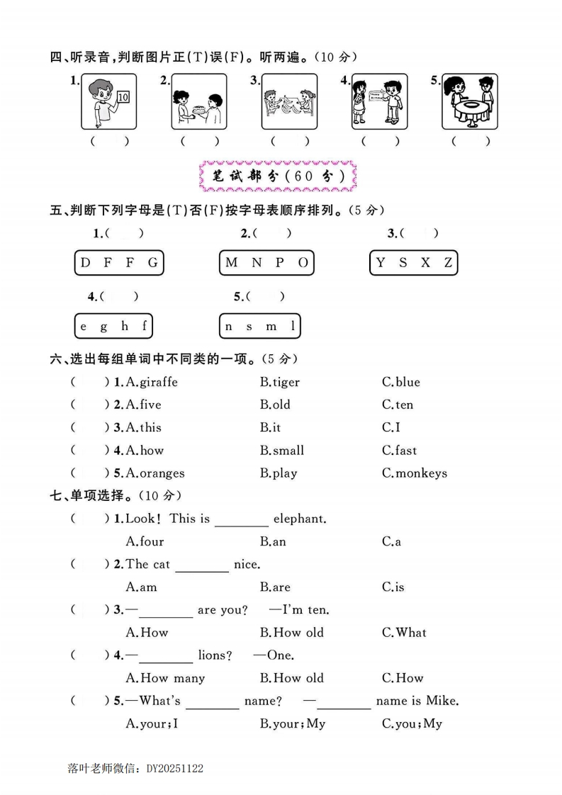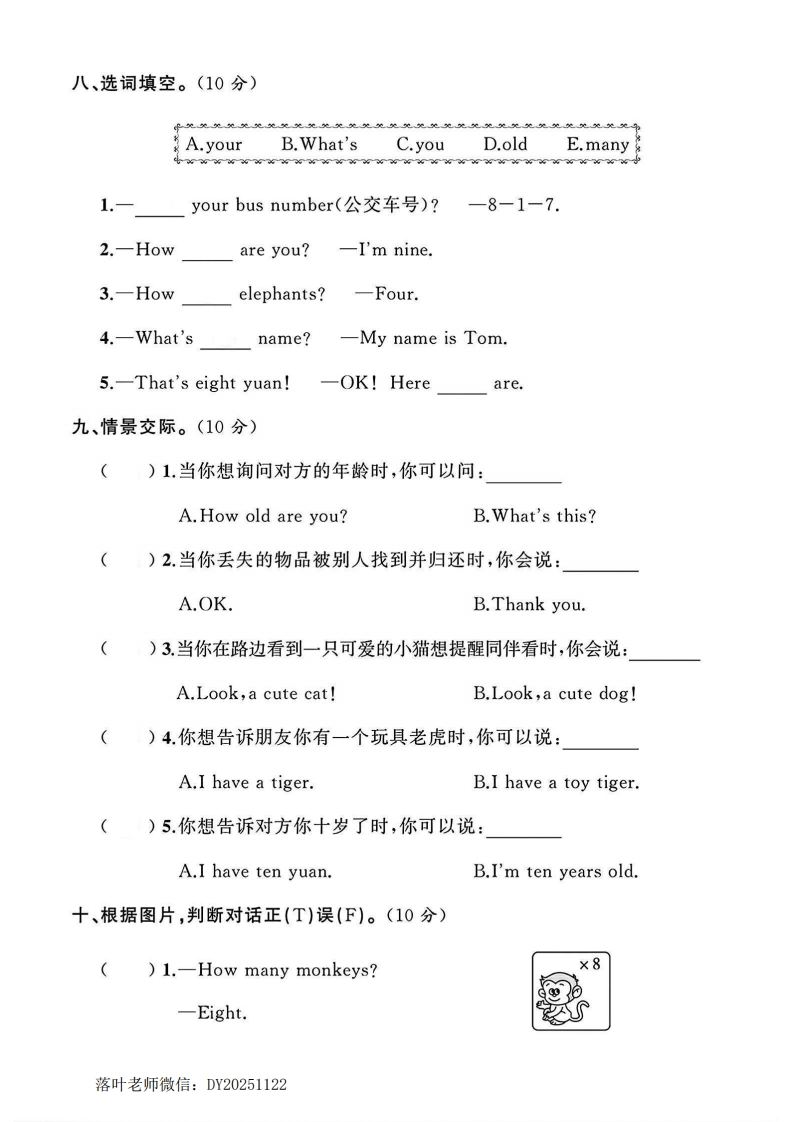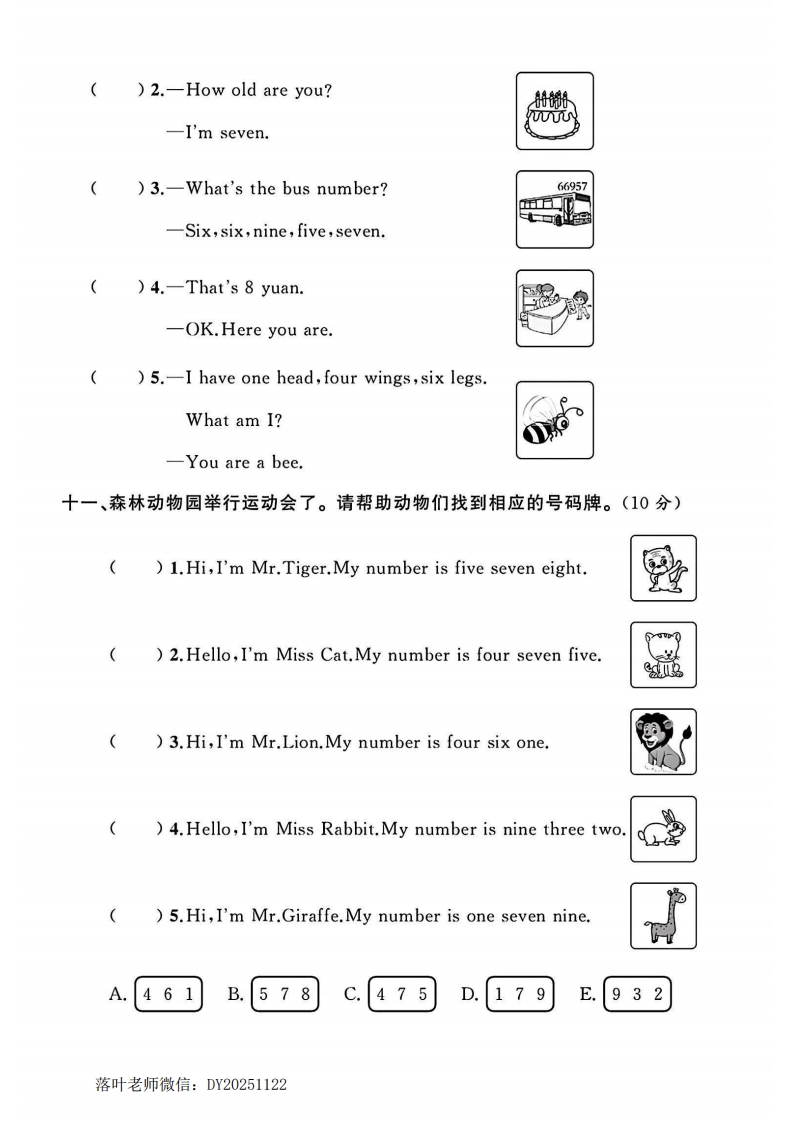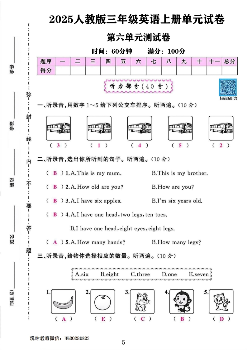 2025人教版三年级英语上册单元试卷第六单元测试卷时间:60分钟满分:100分:题序三四五六七八九十总分孙得分听力部分(40分)弥扫码听听力一、听录音,用数字1~5给下列公交车排序。听两遍。(10分)封荞5936线内二、听录音,选出你所听到的句子。听两遍。(10分))1.A.This is my mum.B.This is my brother.i()2.A.How old are you?B.How are you?)3.A.I have six apples.B.I'm six years old.要)4.A.I have one head,two legs,ten toes.答B.I have one head,eight eyes,eight legs.毁:.)5.A.How many hands?B.How many legs?题三、听录音,给物体选择相应的数量。听两遍。(10分)A.sixB.eightC.threeD.oneE.seven:3S落叶老师微信:DY20251122