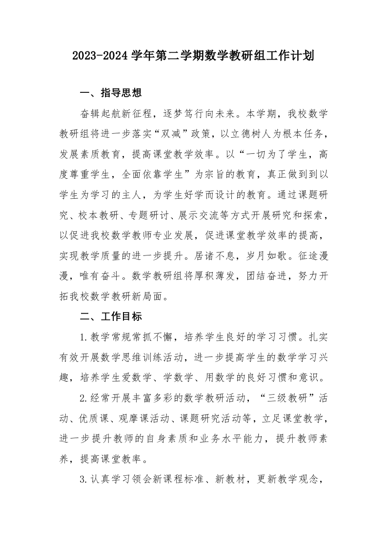 2023-2024学年第二学期数学教研组工作计划一、指导思想奋辑起航新征程,逐梦笃行向未来。本学期,我校数学教研组将进一步落实“双减”政策,以立德树人为根本任务,发展素质教育,提高课堂教学效率。以“一切为了学生,高度尊重学生,全面依靠学生”为宗旨的教育,真正做到到以学生为学习的主人,为学生好学而设计的教育。通过课题研究、校本教研、专题研讨、展示交流等方式开展研究和探索,以促进我校数学教师专业发展,促进课堂教学效率的提高,实现教学质量的进一步提升。居诸不息,岁月如歌。征途漫漫,唯有奋斗。数学教研组将厚积薄发,团结奋进,努力开拓我校数学教研新局面。二、工作目标1.教学常规常抓不懈,培养学生良好的学习习惯。扎实有效开展数学思维训练活动,进一步提高学生的数学学习兴趣,培养学生爱数学、学数学、用数学的良好习惯和意识。2.经常开展丰富多彩的数学教研活动,“三级教研”活动、优质课、观摩课活动、课题研究活动等,立足课堂教学,进一步提升教师的自身素质和业务水平能力,提升教师素养,提高课堂教率。3.认真学习领会新课程标准、新教材,更新教学观念,