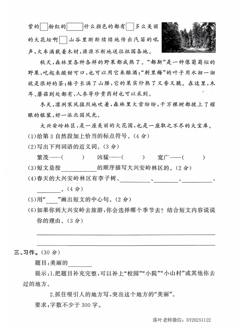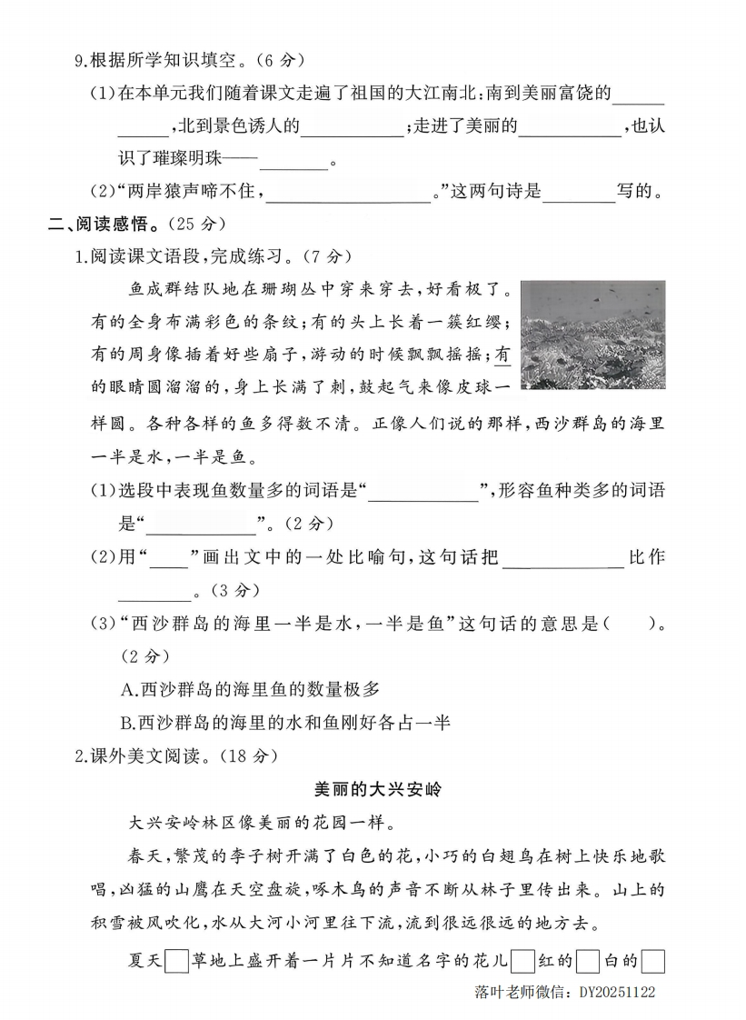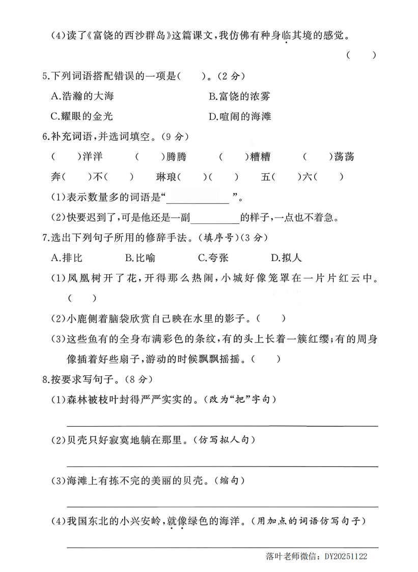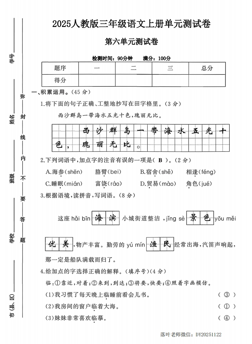 2025人教版三年级语文上册单元测试卷第六单元测试卷累检测时间:90分钟满分:100分题序一二三总分得分一、积累运用。(45分)弥1.将下面的句子正确、工整地抄写在田字格里。(3分)封西沙群岛一带海水五光十色,瑰丽无比。线内2.下列词语中,加点字的注音有误的一项是()。(2分)A.海参(shēn)胳臂(bei)B.宿舍(shě)相逢(féng)不C.睡眠(midn)富饶(ro)D.贸易(mào)角色(jué)要3.根据语境,读拼音,写词语。(8分)答这座hai bin小城街道整洁,jing seouměi物产丰富。勤劳的yu min经常出海,汽笛声响起,那一定是船队满载而归了。4.给加点的字选择正确的解释。(填序号)(4分)临:①靠近,对着;②来到,到达;③将要,快要;④照着字画模仿。☒(1)我习惯了每天晚上临睡前看会儿书。)(2)我房间的窗户临着大海。()e(3)妹妹非常喜欢临摹。()落叶老师微信:DY20251122