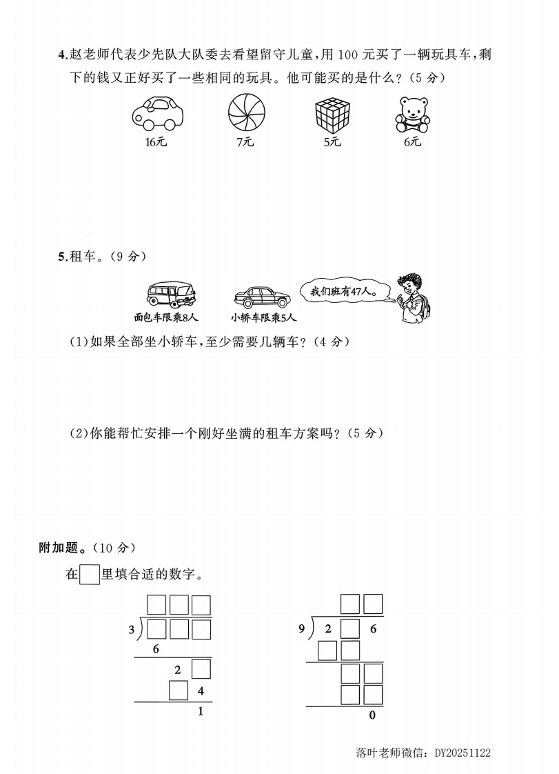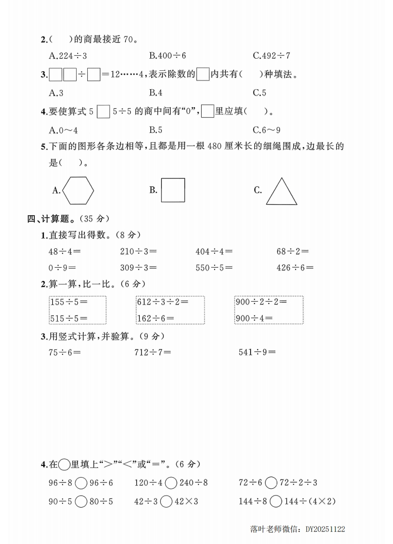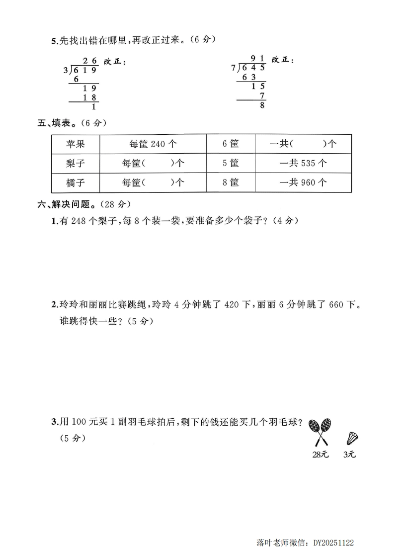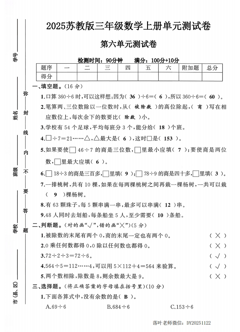 2025苏教版三年级数学上册单元测试卷第六单元测试卷露检测时间:90分钟满分:100分+10分题序二三四五六附加题总分得分一、填空题。(16分)弥1.口算360÷6时,可以这样想:因为()÷6=(),所以360÷6=()。2.笔算两、三位数除以一位数时,从()的高位除起,()写在相封应数位上,每次余下的数要比()小。3.学校有54个足球,平均每班分3个,能分给()个班。线4.☐÷7=21…△,△最大是(),这时口是()。内5.如果要使☐46÷7的商是三位数,口里最小应填();要使商是两位数,☐里最大应填()。童不6.☐18÷3的商是三百多,☐里填();☐78÷9的商是四十多,☐里填()。7.一排桃树,共有10棵,如果在每两棵桃树之间再栽一棵杨树,一共可以栽要()棵杨树。8.有63颗珠子,每5颗串满一串,最多可以串满()串。答9.48人同时去划船,每条船坐5人,至少需要()条船。靠二、判断题。(对的画“√”,错的画“X”)(5分)题1.被除数的末尾有两个0,商的末尾一定也有两个0。(2.0乘任何数都得0,0除以任何数也都得0。(3.72÷2÷3=72÷6。(4.564÷5=112…4,可以用5×112+4=564来验算。5.两个数相除,除数是8,则余数最大是9。(☒三、选择题。(将正确答案的字母填在括号里)(10分)1.下面各算式中,没有余数的是()。A.69÷6B.684÷6C.153÷6落叶老师微信:DY20251122