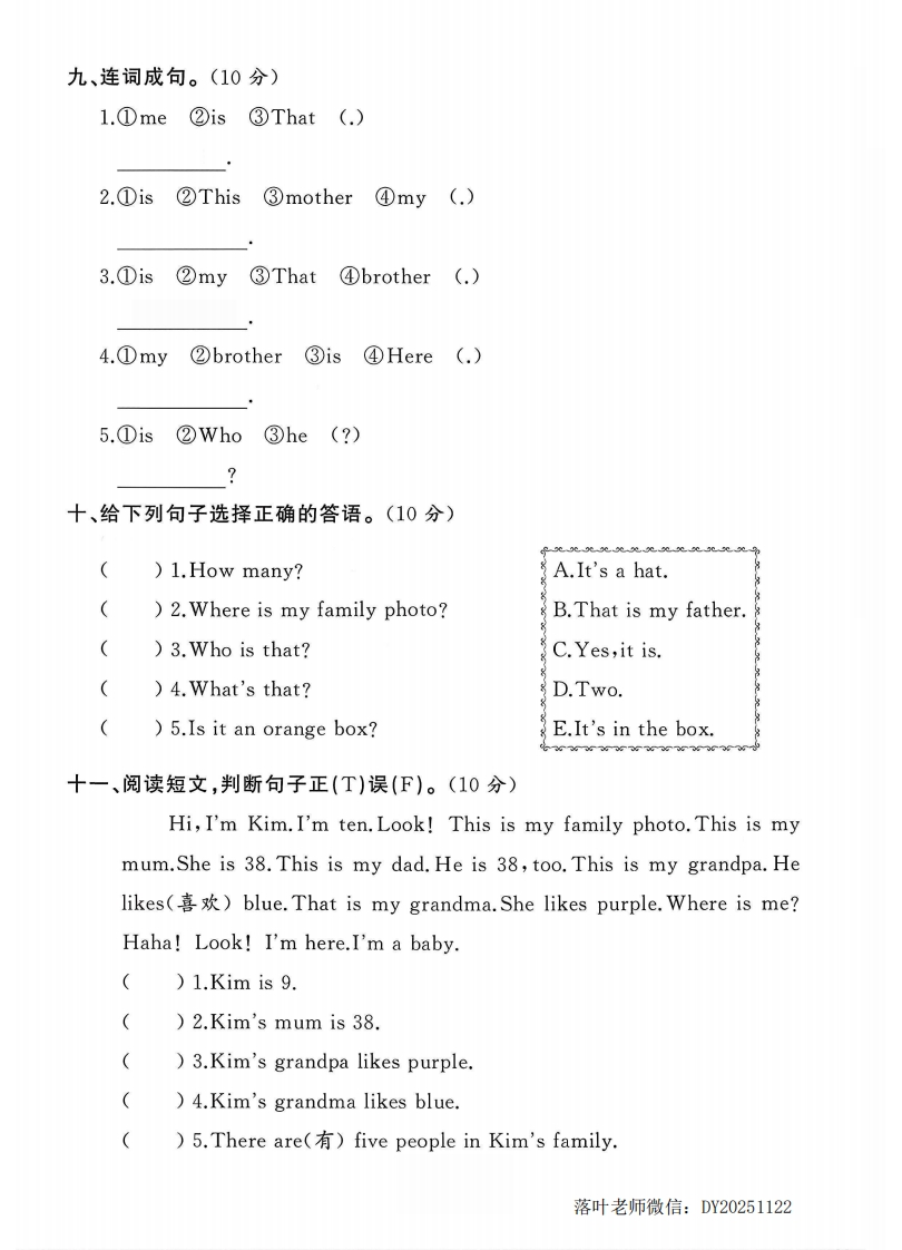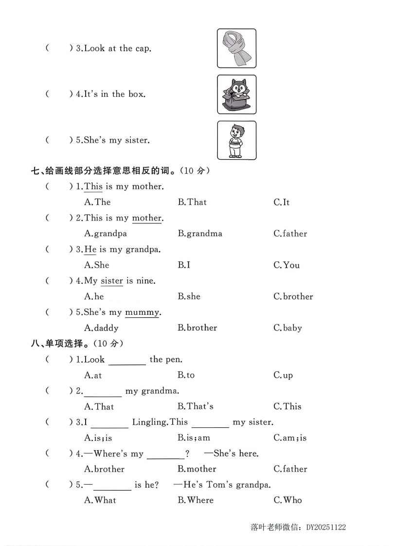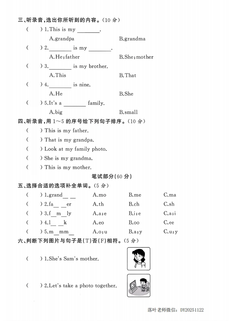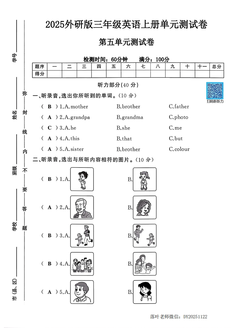 2025外研版三年级英语上册单元测试卷第五单元测试卷累检测时间:60分钟满分:100分题序三四五六七八九十十总分得分听力部分(40分)弥一、听录音,选出你所听到的单词。(10分)扫码听听力)1.A.motherB.brotherC.father毁封)2.A.grandpaB.grandmaC.photo)3.A.heB.sheC.me线)4.A.thisB.thatC.but内)5.A.sisterB.brotherC.colour二、听录音,选出与所听内容相符的图片。(10分)蠻不1.AB要答)2.AB靠题)3.AB)4.AB因)5.AB落叶老师微信:DY20251122