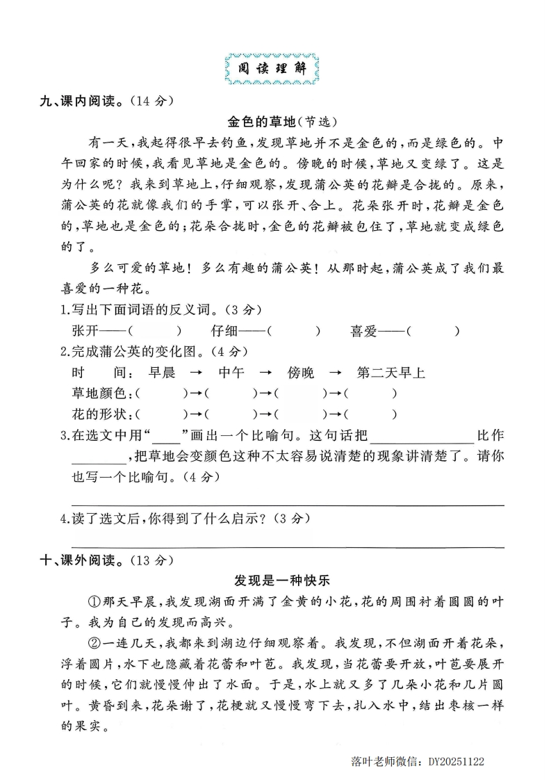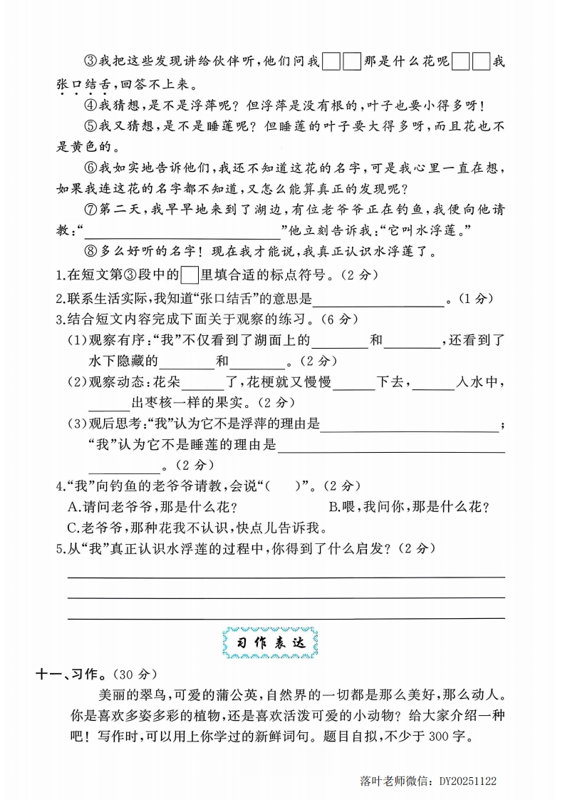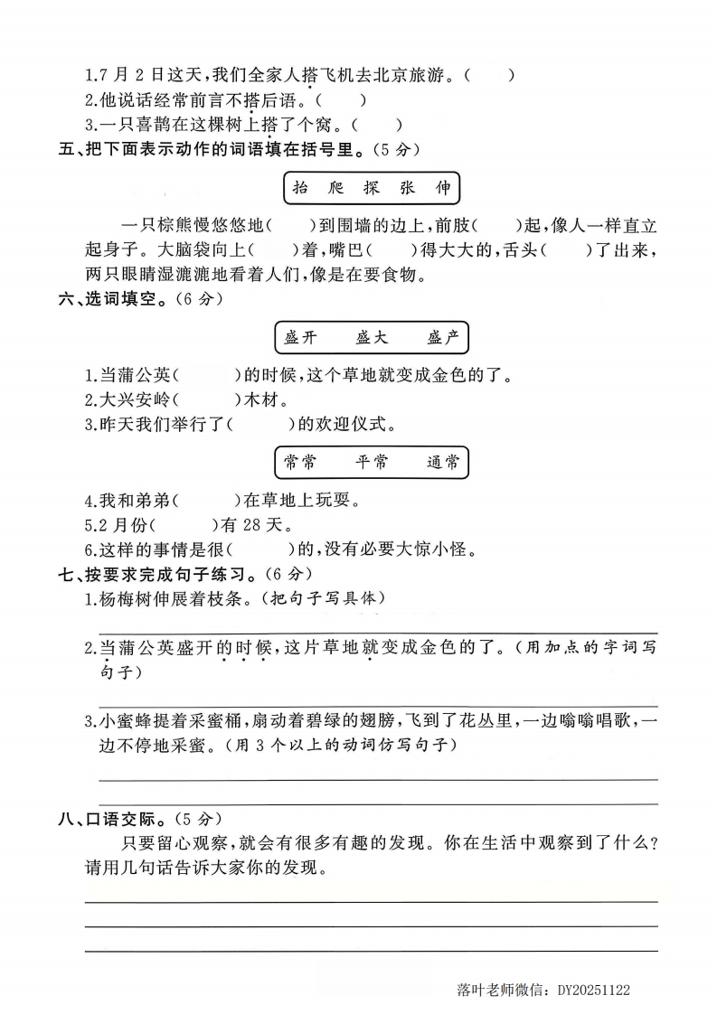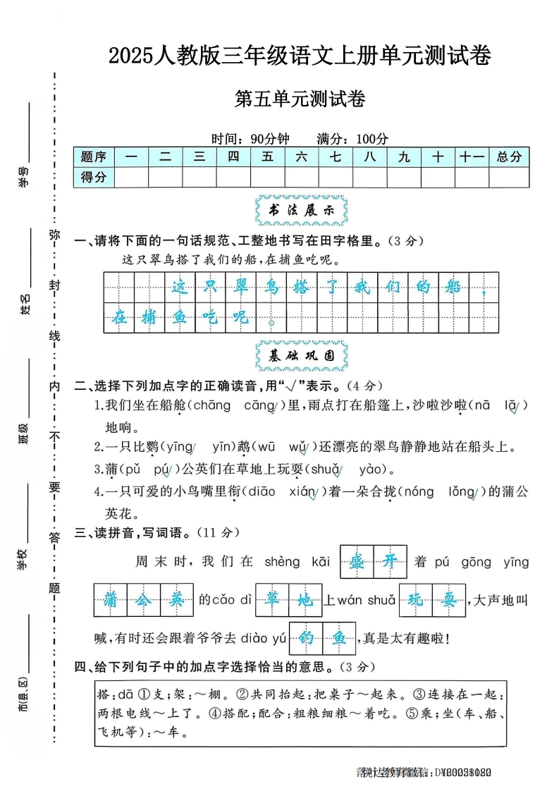 2025人教版三年级语文上册单元测试卷第五单元测试卷:时间:90分钟满分:100分题序三四五六七八九总分n得分》书法展示弥一、请将下面的一句话规范、工整地书写在田字格里。(3分)这只翠鸟搭了我们的船,在捕鱼吃呢。封救线基础巩固内二、选择下列加点字的正确读音,用“√”表示。(4分)l.我们坐在船舱(chang cang)里,雨点打在船篷上,沙啦沙啦(nala)黛不地响。2.一只比鹦(yingyin)鹉(wuwù)还漂亮的翠鸟静静地站在船头上。3.蒲(pǔpú)公英们在草地上玩耍(shudyào)。要4.一只可爱的小鸟嘴里衔(diao xian)着一朵合拢(n6ng1ǒng)的蒲公英花。答三、读拼音,写词语。(11分)靠周末时,我们在shengka着púgongying题的cao diL wan shua大声地叫:喊,有时还会跟着爷爷去diàoyú真是太有趣啦!:四、给下列句子中的加点字选择恰当的意思。(3分)搭:dā①支;架:~棚。②共同抬起:把桌子起来。③连接在一起:两根电线一上了。④搭配;配合:粗粮细粮一着吃。⑤乘;坐(车、船、飞机等):~车。落叶老师微信:DY20251122