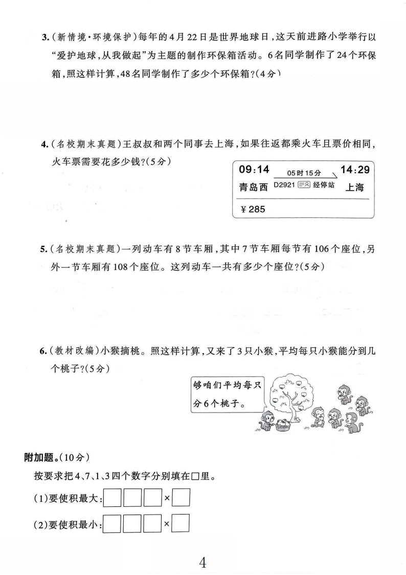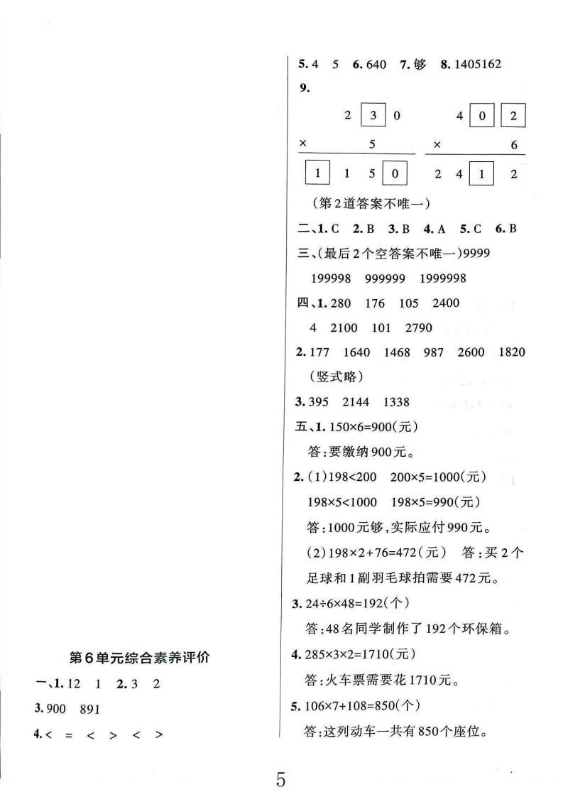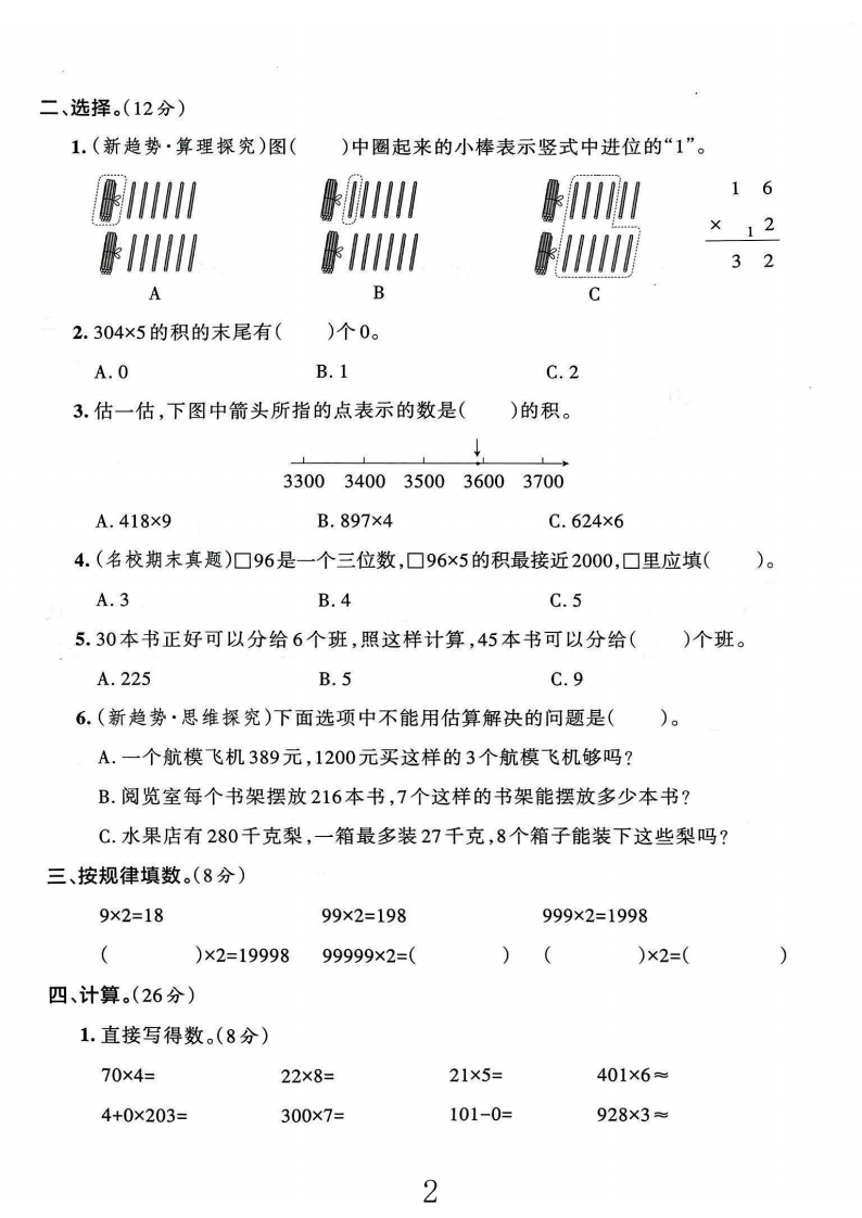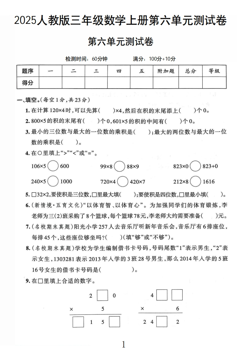 2025人教版三年级数学上册第六单元测试卷第六单元测试卷检测时间:60分钟满分:100分+10分题序三四五附加题总分等级得分一、填空。(每空1分,共23分)1.在计算120×4时,可以先算()×4,然后在积的末尾添上()个0。2.800×5的积的末尾有()个0,601×5的积的中间有()个0。3.最小的三位数与最大的一位数的乘积是();最大的两位数与最大的一位数的乘积是()4在O里填上“>”“<”或“=”。106×560099×888×9823×0823+0240×51000720×4420x7212×816165.口32×2,要使积是三位数,□里最大填():要使积是四位数,口里最小填()6.(新情境·五育文化)“以体育智、以体育心”。为加强同学们的体育锻炼,李老师为三(2)班采购了8个篮球,每个篮球78元,李老师大约需要准备()元。7.(名校期未真题)阳光小学257人去音乐厅听新年音乐会,音乐厅有6排座位,每排45个,这些座位够坐吗?()(填“够”或“不够”)。8.(名校期末真题)学校为学生编制借书卡号码,号码尾数“1”表示男生,“2”表示女生,1303281表示2013年人学的3班28号男生,那么2014年人学的5班16号女生的借书卡号码是()。9.在口里填上合适的数字。562421