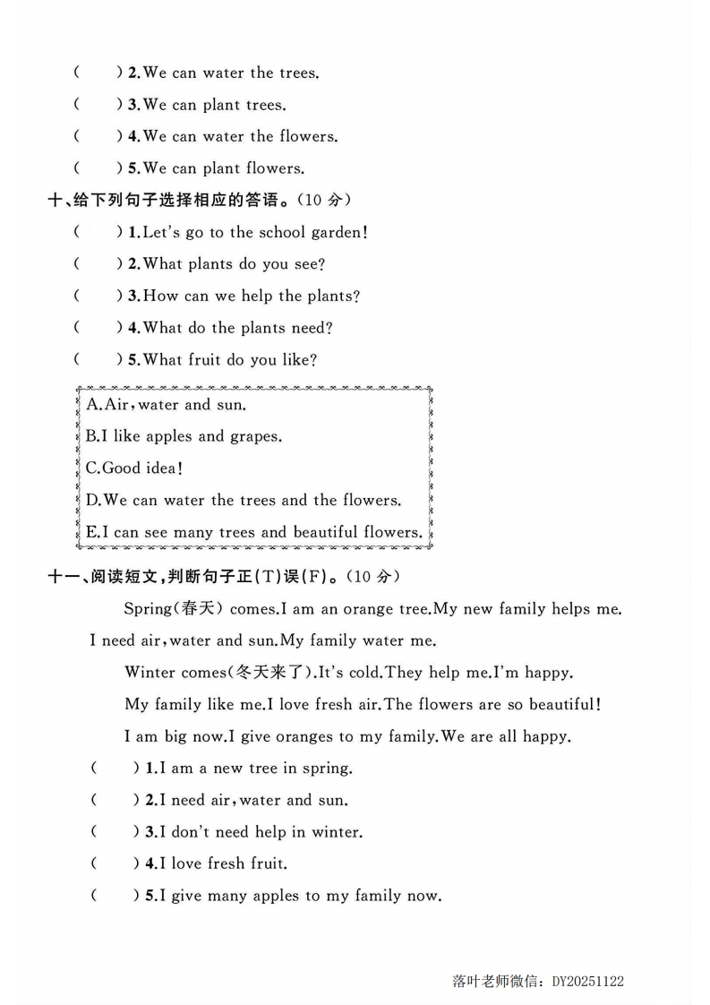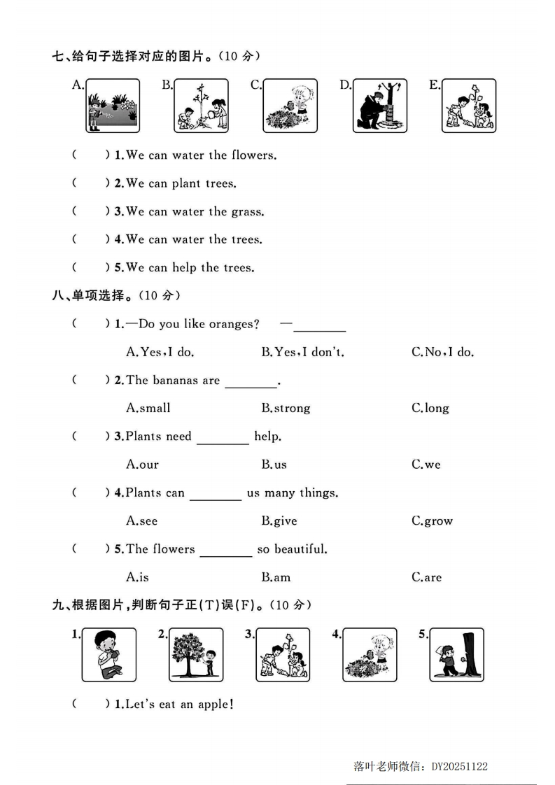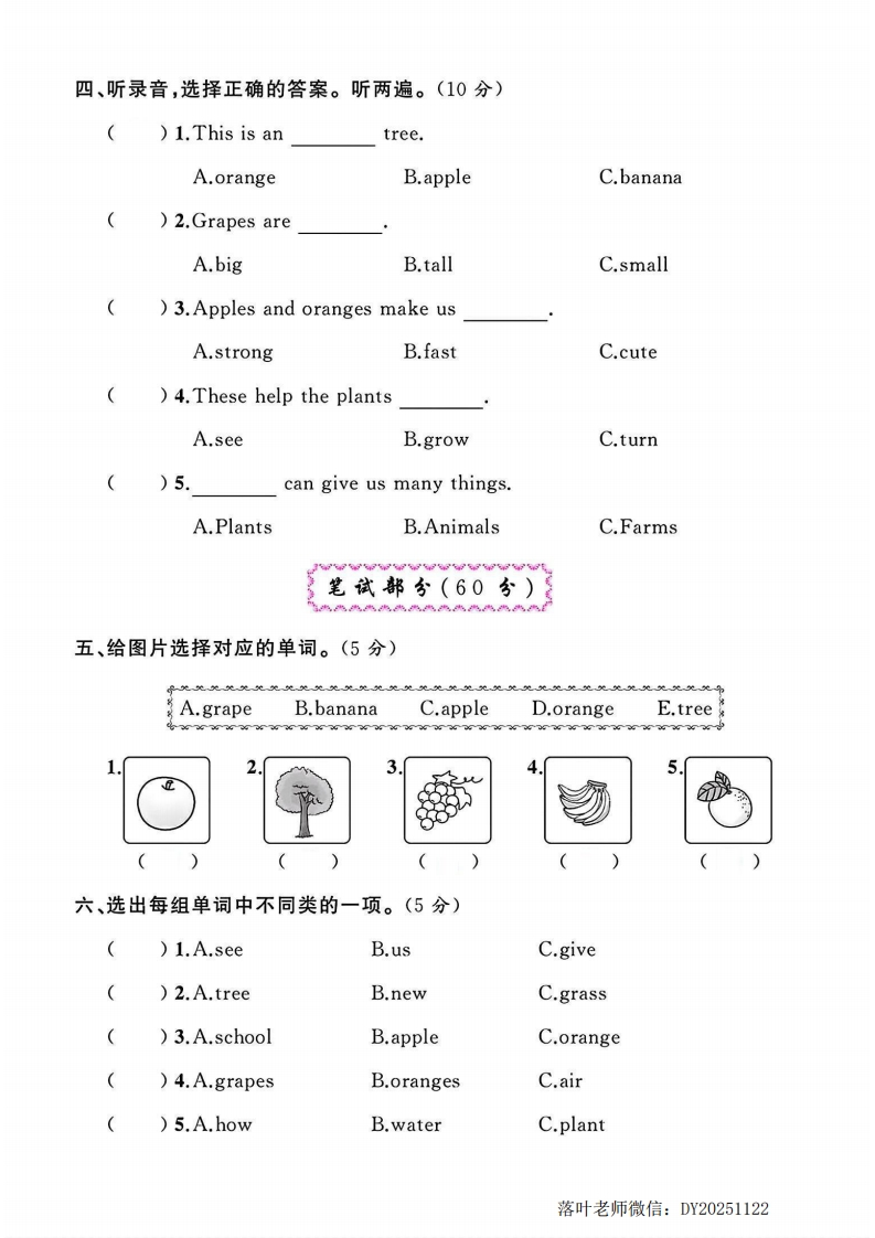 2025人教版三年级英语上册单元试卷::第四单元测试卷时间:60分钟满分:100分钟题序三四五六七八九十总分得分听力部分(40分)弥码听听力一、听录音,选出你所听到的内容。听两遍。(10分)封)1.A.MOB.NLC.PM靠()2.A.plantB.bananaC.give线)3.A.grapeB.gardenC.grass)4.A.airB.appleC.water·内!)5.A.farmB.sunC.flower二、听录音,选出与你所听内容相符的图片。听两遍。(10分)爵·不!1.AB)2.AB:1.要:1。答!)3.A.B)4.AB毁:!5.AB:三、听录音,用数字1~5给下列图片排序。听两遍。(10分):落叶老师微信:DY20251122