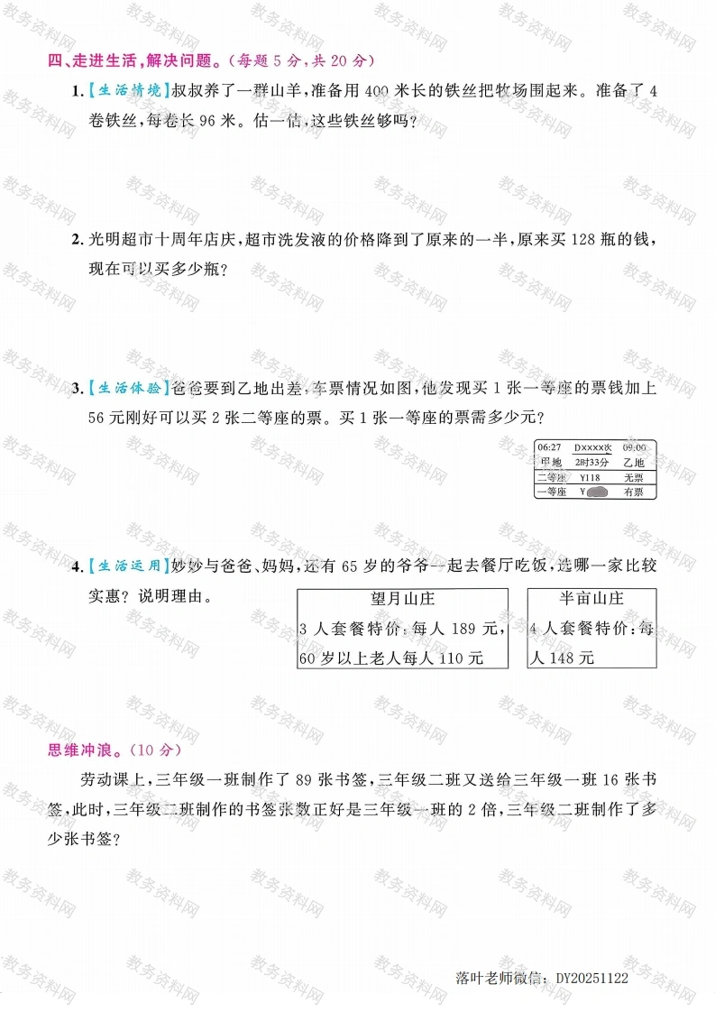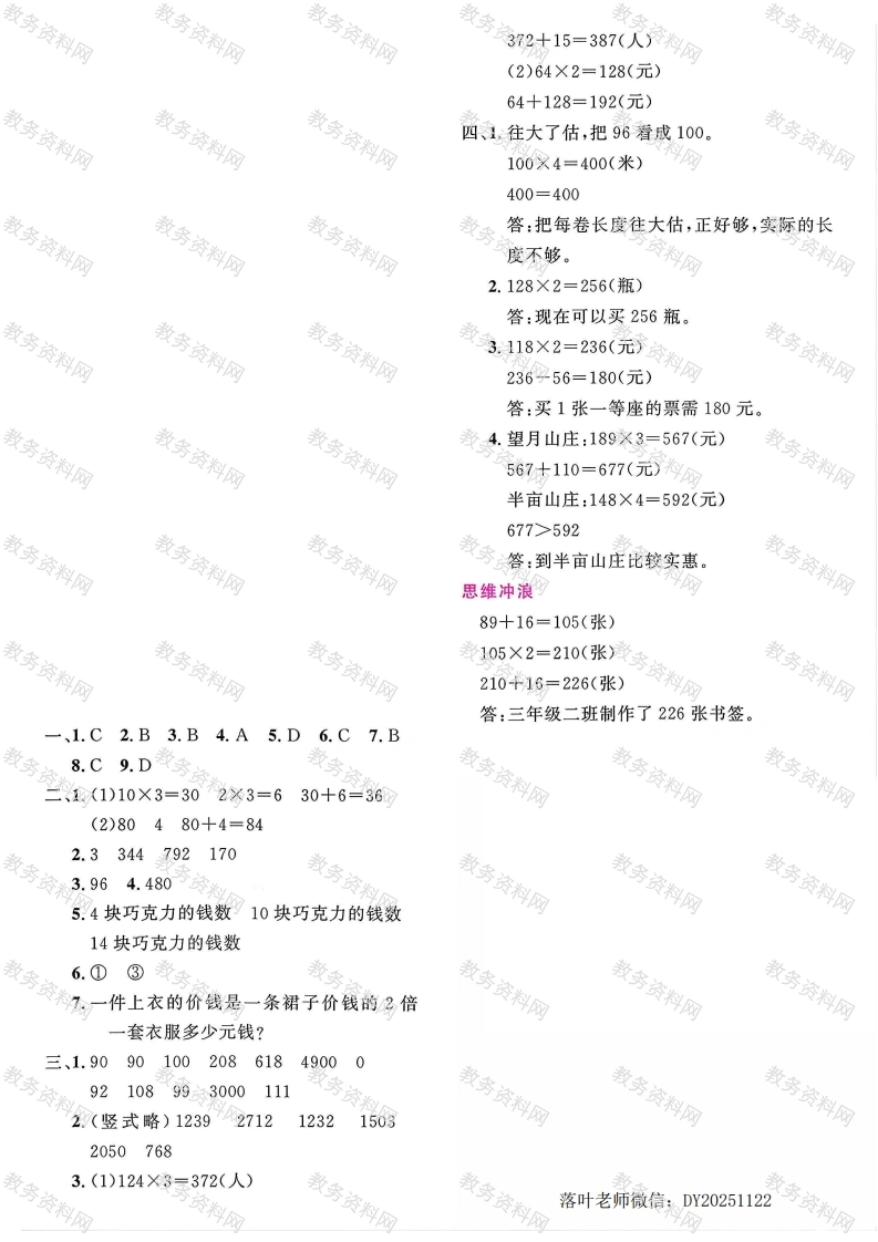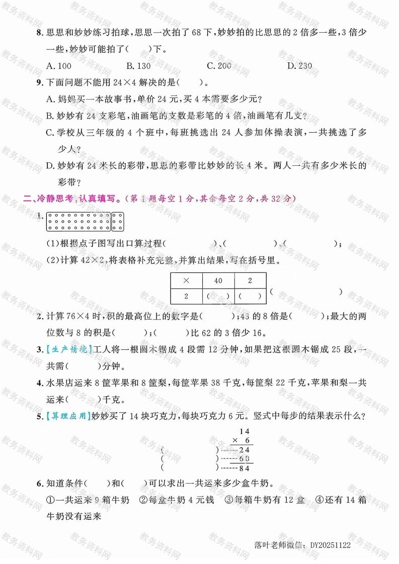 2025青岛63制三年级数学上册单元测试卷第五单元测试卷时间:60分钟总分:100分+10分书写等级:得分:一、周密分析,正确选择。(每题2分,共18分)每天能吃116只害虫,3天能吃()只害虫。浙A.300B.330C.348D.3582.要使241×☐的积是三位数,☐里最大是()。A.9B.4C.3D.53.【算理应用】李老师到文具店购买硬皮本,每个8元,买了34个,一共花多34×海8少元?竖式虚线框中的3表示()。272A.3元B.30元C.3个D.30个4.1位工人5小时加工150个零件,那么3位工人5小时加工()个零件。A.450B.2250C.90D.2705.下面说法正确的是()。①0与任何数相乘都得0。②三位数乘一位数,积只能是四位数。③☐50×4的积是三位数,口中最大填1。④15的6倍与6个15相加,可以列相同的算式。A.①②B.②③C.③④D.①③④6.游乐园平均每小时有85~98人骑旋转木马,照这样计算,4小时骑旋转木马的大约有()人。pA.340B.392C.380D.6007.【方法应用】叔叔家今年的荔枝大丰收,一共收了610千克。每个筐最多能装68千克,8个筐能装下这些荔枝吗?下面做法合理的是(A.68往小估,看成60,60×8=480(千克),480<610,不能装下B.68往大估,看成70,70×8=560(千克),560<610,不能装下C.把8往大估,看成10,68×10=680(千克),680>610,能装下D.把68,8都往大估,68看成70,8看成10,70×10=700,700>610,能装下落叶老师微信:DY20251122