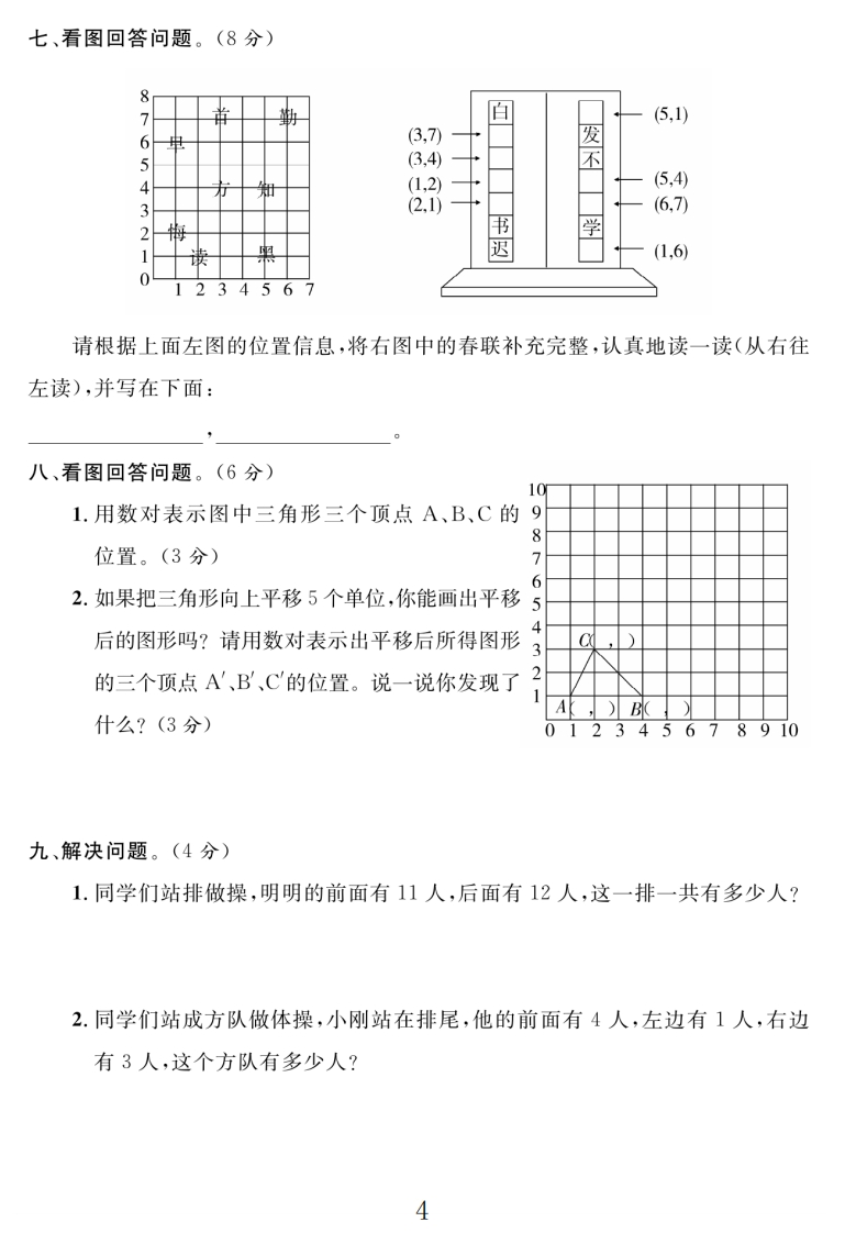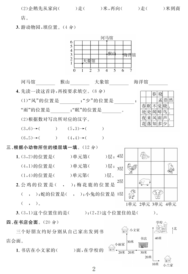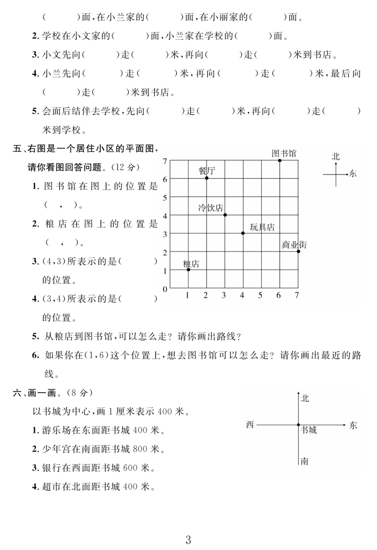 2025年数学四年级上册第五单元测试卷第五单元测试卷检测时间:90分钟满分:100分+5分题号三四五六七八九总分得分一、卷面书写。(5分)请同学们在答题时认真书写,做到规范、端正、美观,让你的试卷拥有一张清秀、漂亮的面孔!二、填空。(30分)1.(10分)少年宫北火车站医院,东电影院汽车站邮局人民商场(1)1路公交车从汽车站出发,向()行()站到达电影院,从电影院出发向()行()站到达少年宫。(2)小明从火车站向()走()站到邮局,再向()走()站到人民商场,再向()走()站到少年宫。2.(8分)》北企鹅家210米1东蚂数家0米20米商西350米0来小南家300米小兔家(1)小兔先从家向()走()米,再向()走()米到商店。1