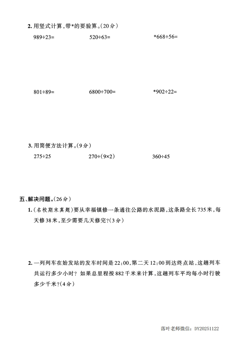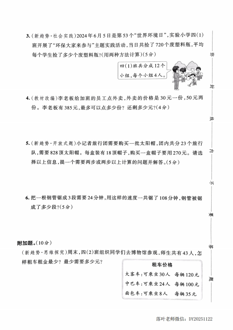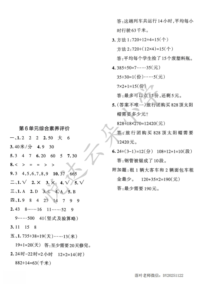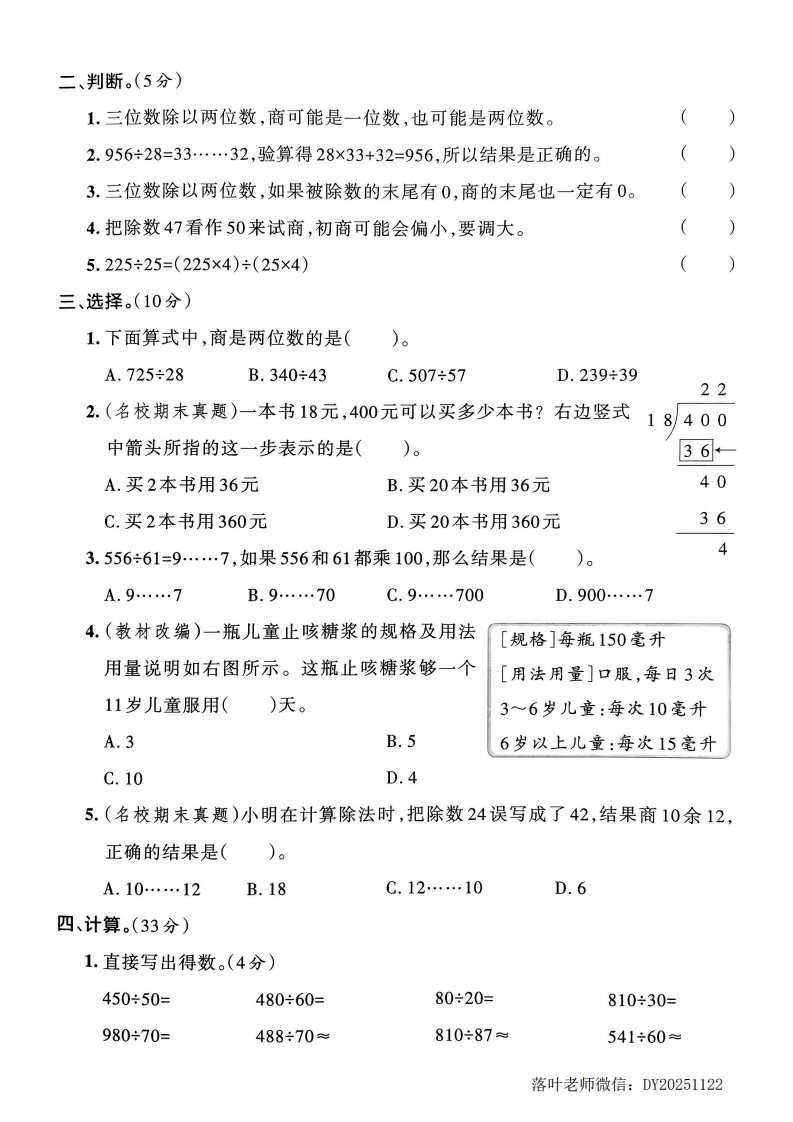 2025-2026学年人教版四年级上册数学综合素养评价第六单元综合素养评价时间:60分钟满分:100+10分题序二三四五附加题总分等级蜘得分孙一、填空。(每空1分,共26分)1.计算62÷30时,因为62里面有()个30,所以商是(),余数是(2.计算360÷52时,把52看作()来试商,初商偏(),要把商调为(3.(名校期末真题)我国自主设计并集成研制的“蛟龙号”载人潜水器在西太平洋20分钟大约下潜800米,它的下潜速度约是()。9领长4.(名校期末真题)有480千克大米,每50千克装一袋,从右边的竖5N480式可以知道,可以装()袋,还剩()千克。455.()里最大能填几?361×()<18593×(89×()<650R)<3806.根据240÷12=20,直接写出下面各题的商。2400÷120=()720÷12=()240÷48=()7.(新情境·科技成就)5G是最新一代蜂窝移动通信技术,若5秒可传输45GB数箭都据,则传输270GB数据需要()秒。8.在○里填上“>”“<”或“=”。282÷5210802÷4020450÷15900÷30630÷35630÷7÷5480÷12240÷24280÷42800÷4009.(名校期末真题)在算式口04÷36中,如果商是一位数,口里最大填();如总果商是两位数,口里可以填()10.一个除法算式的商是17,余数是36,除数最小是(),这时的被除数是()。落叶老师微信:DY20251122