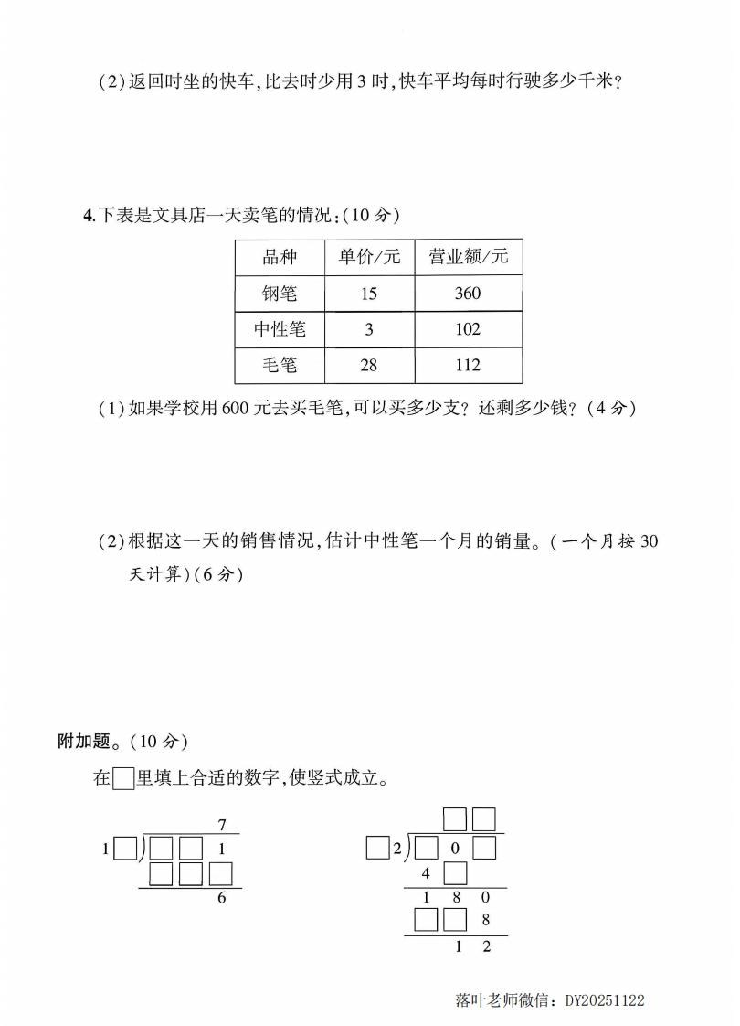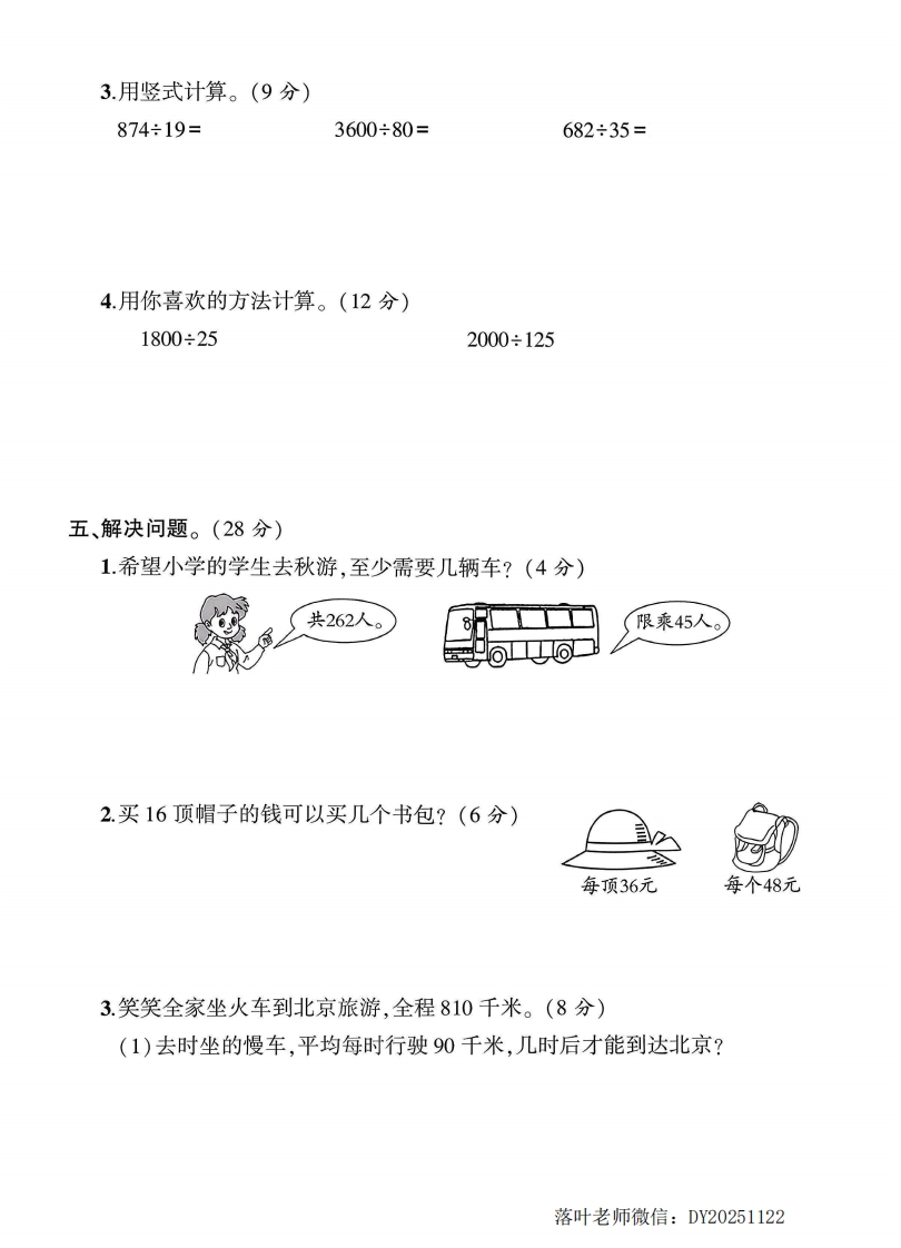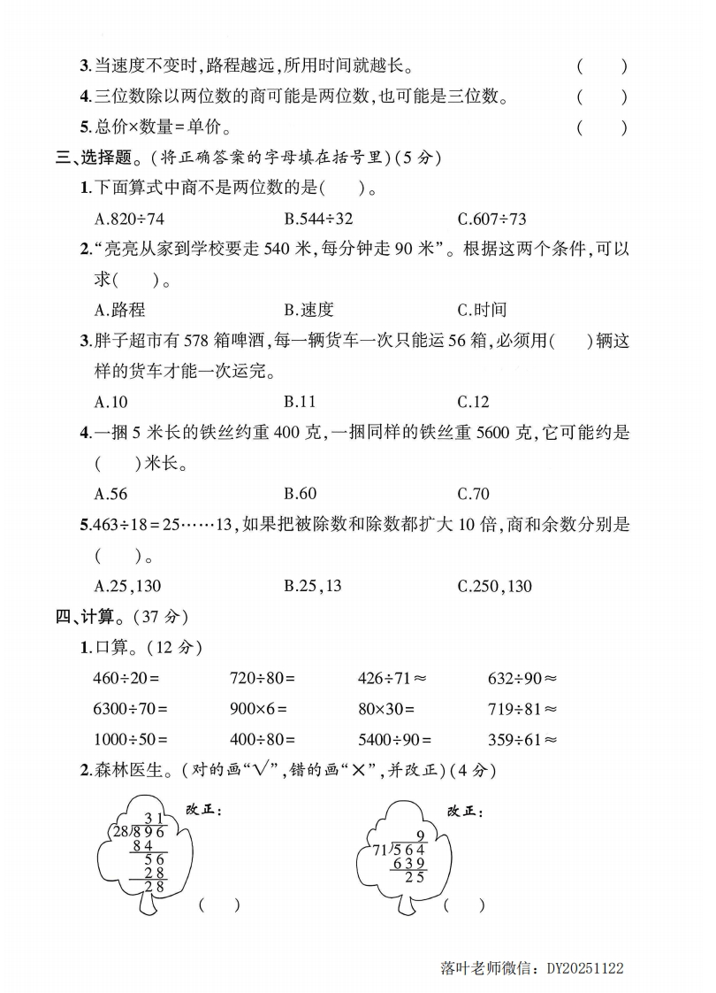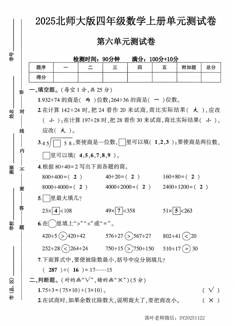 2025北师大版四年级数学上册单元测试卷第六单元测试卷菲检测时间:90分钟满分:100分+10分题序二三四五附加题总分得分弥一、填空题。(每空1分,共25分)》1.932÷74的商是()位数;264÷36的商是()位数。封2.在计算142÷24时,把24看作20来试商,商比实际结果(),应改製);在计算197÷28时,把28看作30来试商,商比实际结果(),线应改()。3.45☐58,要使商是一位数,☐里可以填();要使商是两位数,内里可以填()。蠻不4.根据80÷40=2写出下面各题的商。800÷400=()40÷20=(160÷80=()要8000÷4000=(4000÷2000=(2400÷1200=()5.里最大填几答23x☐k10849x☐k35851×☐<263靠题6在厘填上“>”“<”或“=”420÷5420÷42576÷27(567÷27802÷41(20252÷28(0264÷24750÷15(○750÷150510÷17307.下面算式中,要使被除数最小,括号中应分别填几?()÷()=17…15&二、判断题。(对的画“V”,错的画“X”)(5分)1.75÷3=(75×10)÷(3×10)。e2.在试商时,如果余数比除数大,说明商大了,要把商改小。(落叶老师微信:DY20251122
